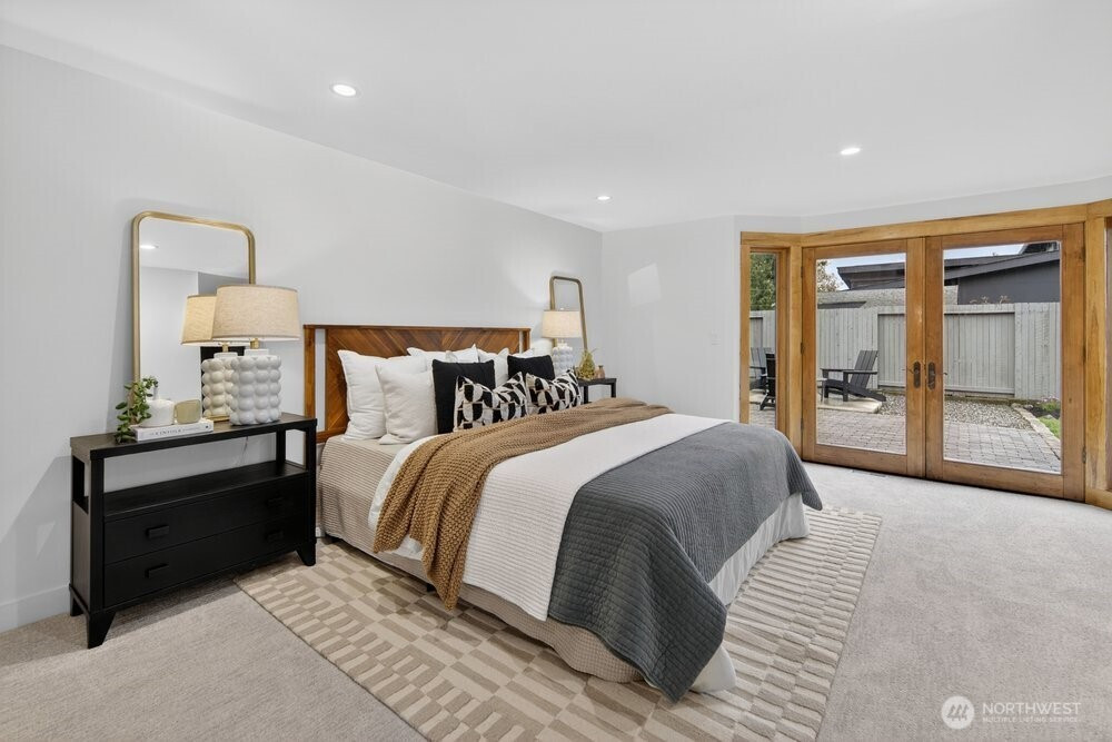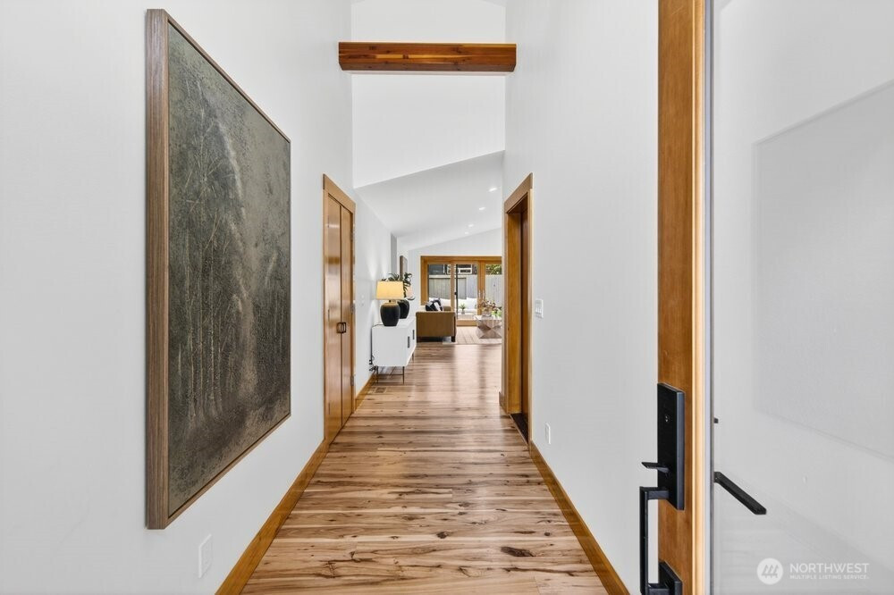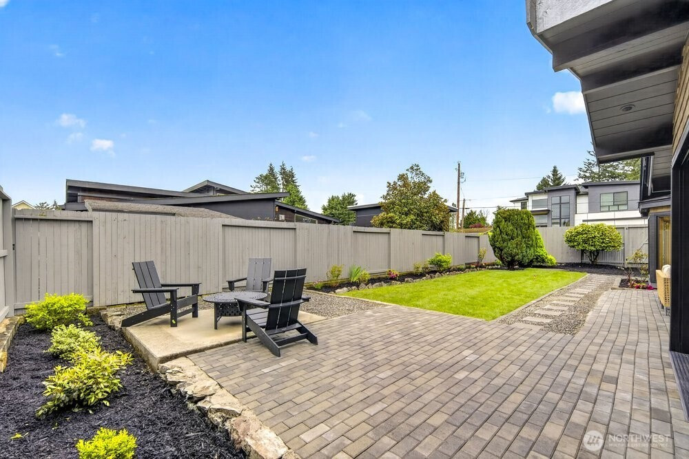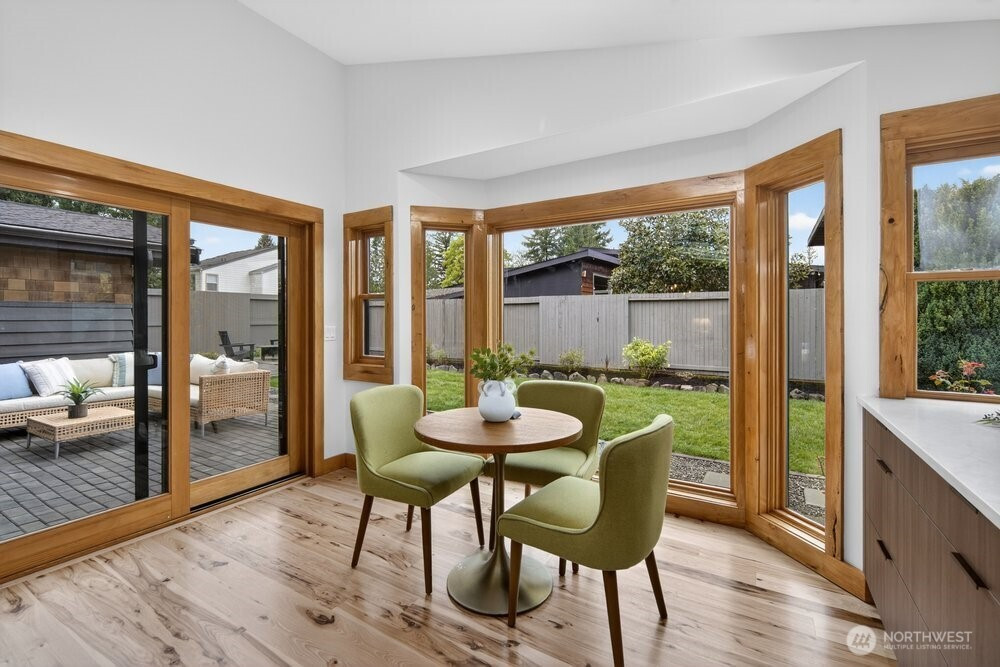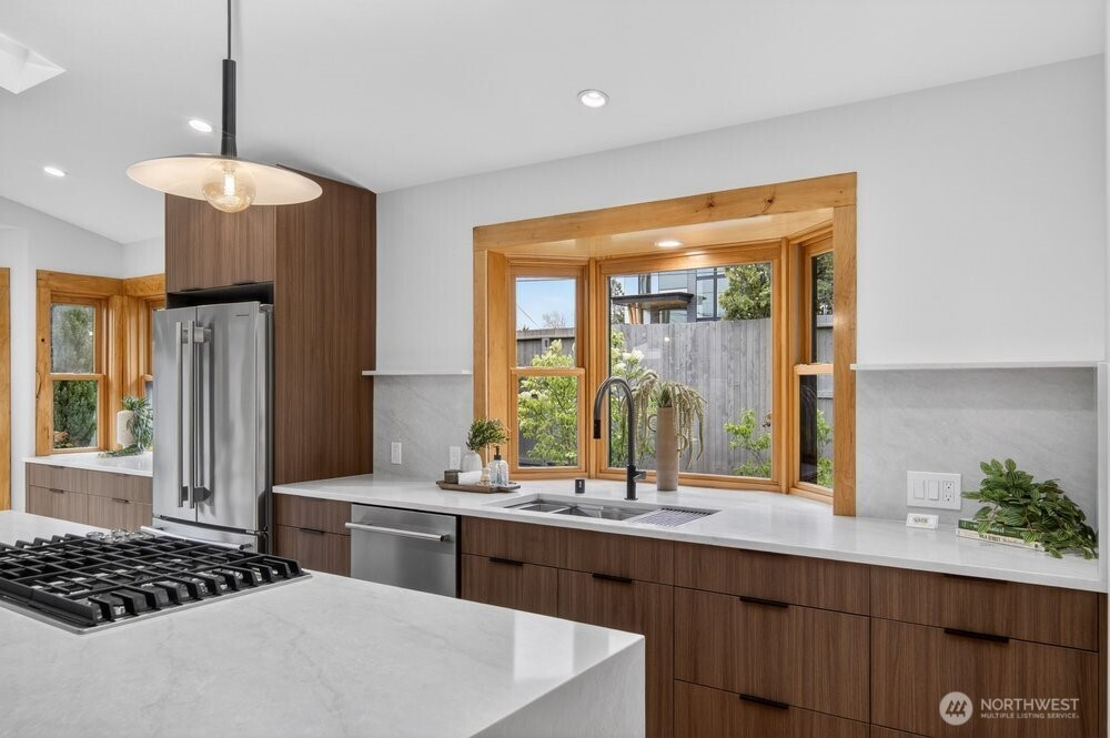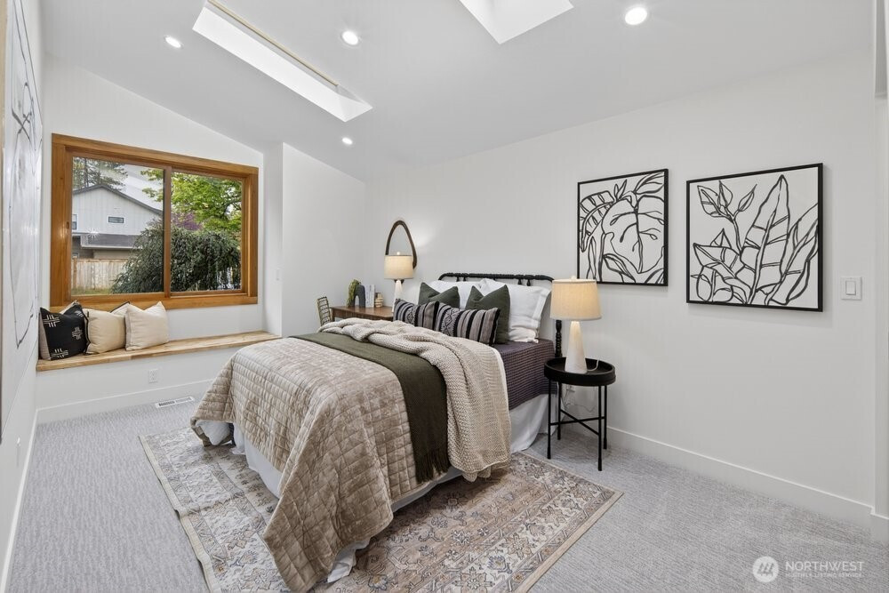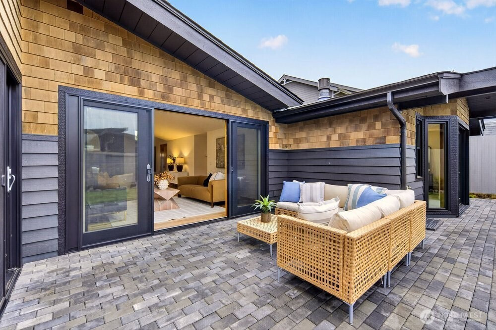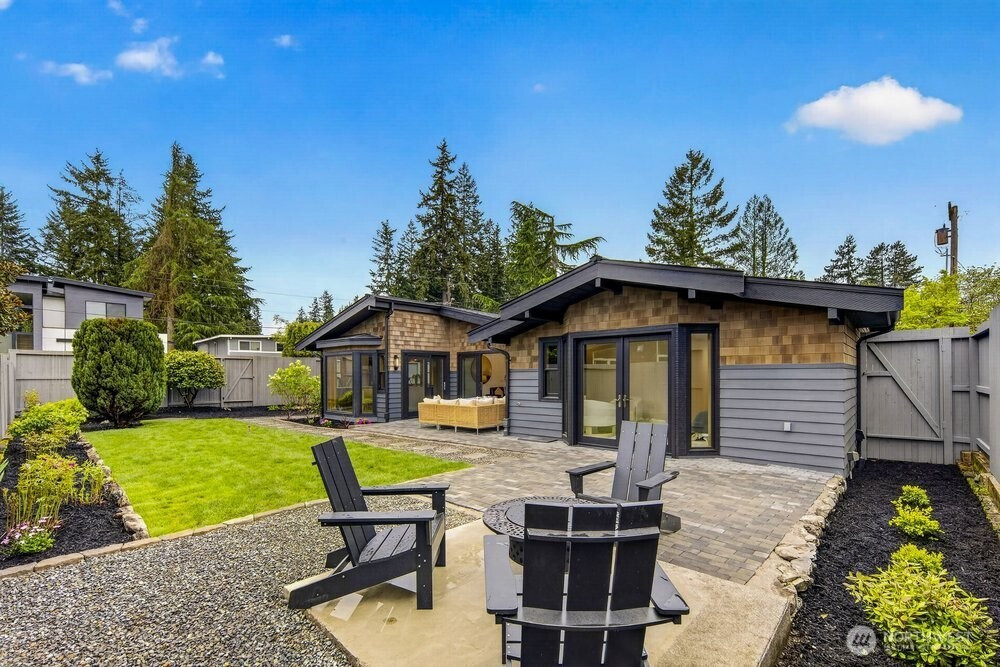 Large 2,190 sq ft rambler with striking Northwest contemporary design and vaulted ceilings throughout. Truly one of a kind, this home showcases quality craftsmanship with wood windows, cedar shingle siding, hardwood floors, and rich wood base and window trim. A new composite roof adds lasting value and peace of mind. The spacious kitchen is equipped with quality appliances, double ovens, a gas cooktop, and a beverage refrigerator. Natural light pours in through multiple skylights, including a dramatic series over the formal dining area and additional skylights above the kitchen island. The breakfast nook offers easy access to the paver patio through a 4-panel slider door, creating seamless indoor-outdoor flow. The primary suite is a private retreat with its own patio and backyard access, a gas fireplace, walk-in closet, and a 5-piece bath. Two additional large bedrooms, a huge full bath, and abundant storage provide space and flexibility. Additional major updates include a new tankless water heater with recirculation for instant hot water, plus a new gas furnace and A/C. Set on a fully fenced lot with a 2-car attached garage, this is a home you do not want to miss.