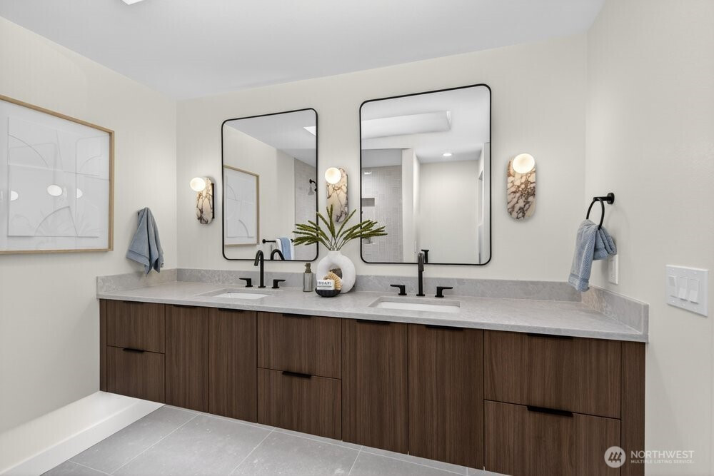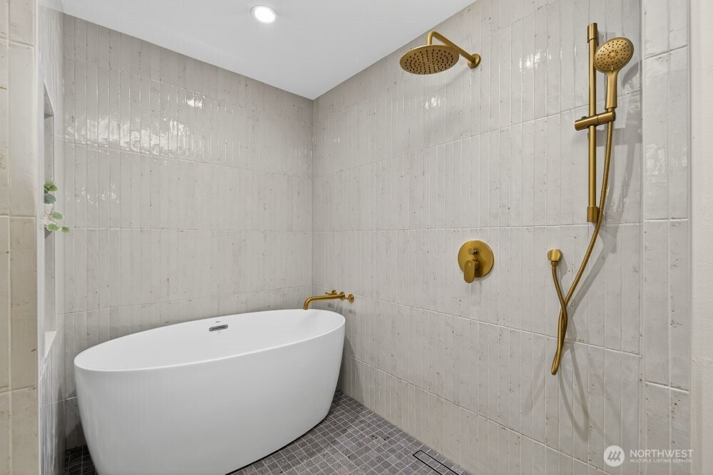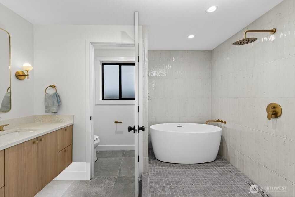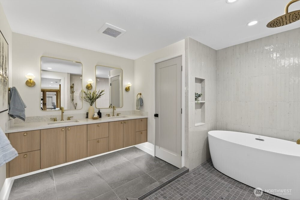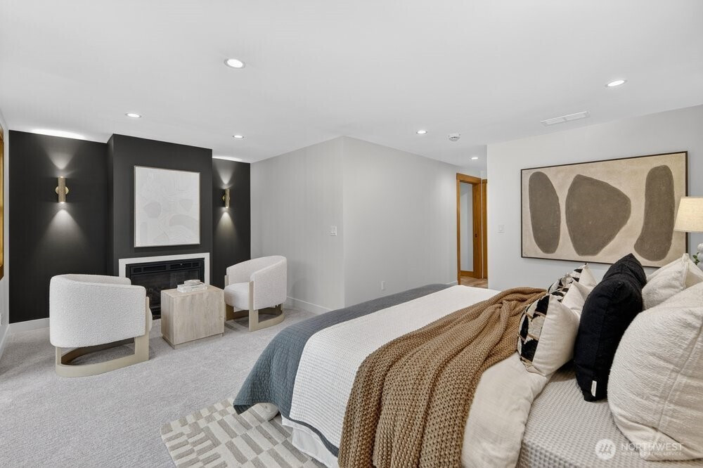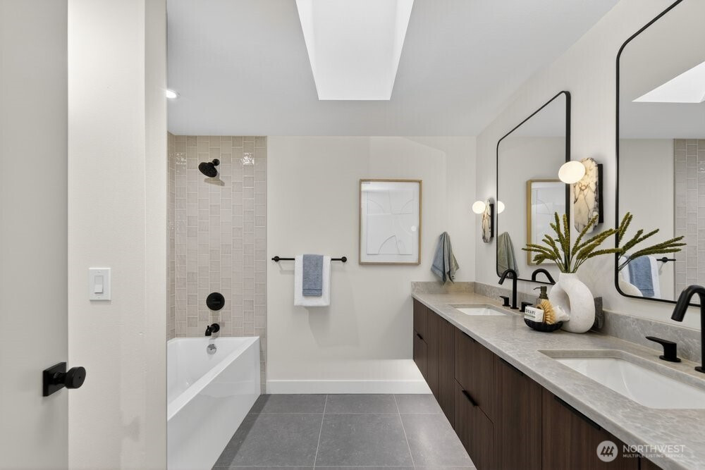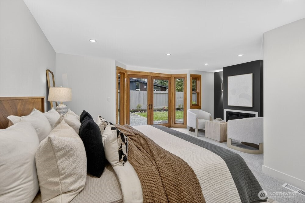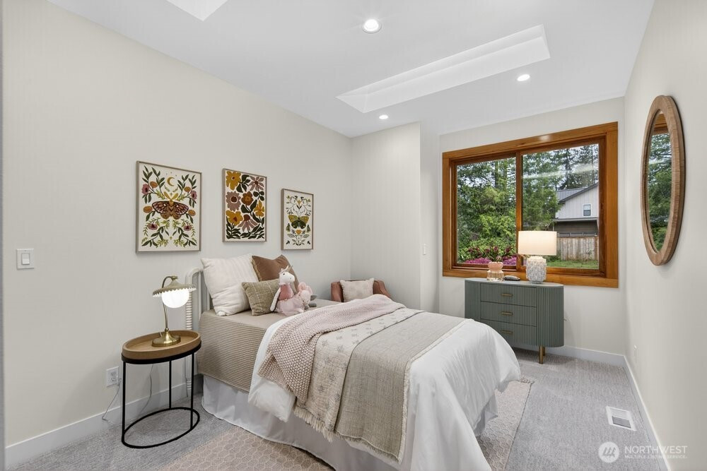 Large 2,190 sq ft rambler with striking Northwest contemporary design and vaulted ceilings throughout. Truly one of a kind, this home showcases quality craftsmanship with wood windows, cedar shingle siding, hardwood floors, and rich wood base and window trim. A new composite roof adds lasting value and peace of mind. The spacious kitchen is equipped with quality appliances, double ovens, a gas cooktop, and a beverage refrigerator. Natural light pours in through multiple skylights, including a dramatic series over the formal dining area and additional skylights above the kitchen island. The breakfast nook offers easy access to the paver patio through a 4-panel slider door, creating seamless indoor-outdoor flow. The primary suite is a private retreat with its own patio and backyard access, a gas fireplace, walk-in closet, and a 5-piece bath. Two additional large bedrooms, a huge full bath, and abundant storage provide space and flexibility. Additional major updates include a new tankless water heater with recirculation for instant hot water, plus a new gas furnace and A/C. Set on a fully fenced lot with a 2-car attached garage, this is a home you do not want to miss.