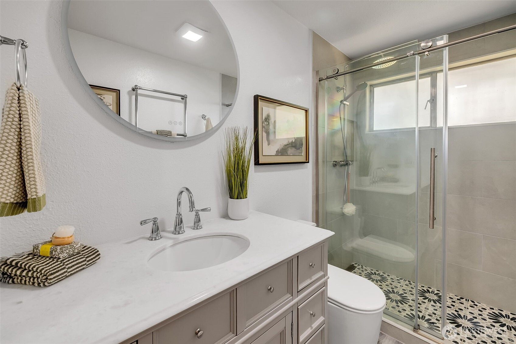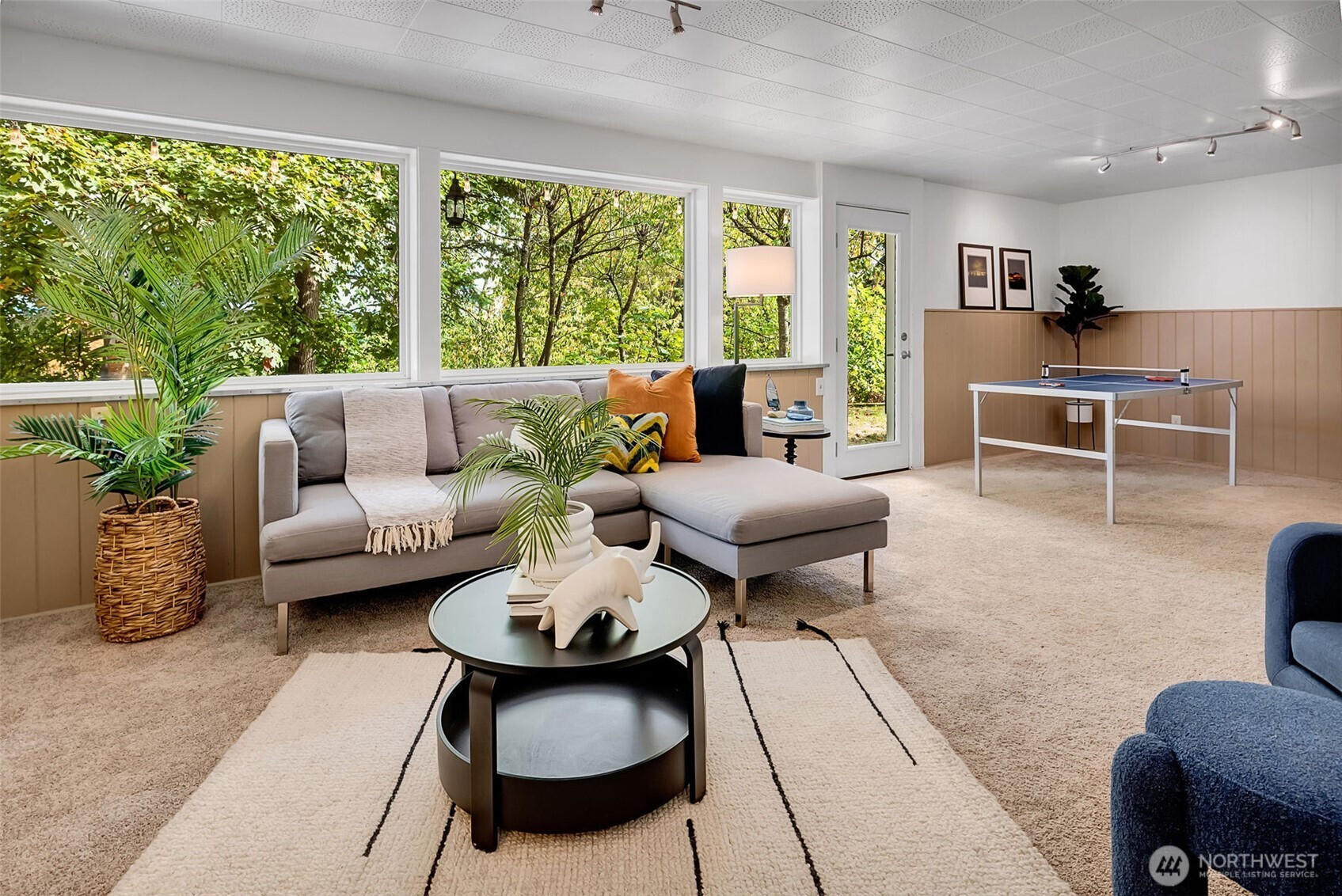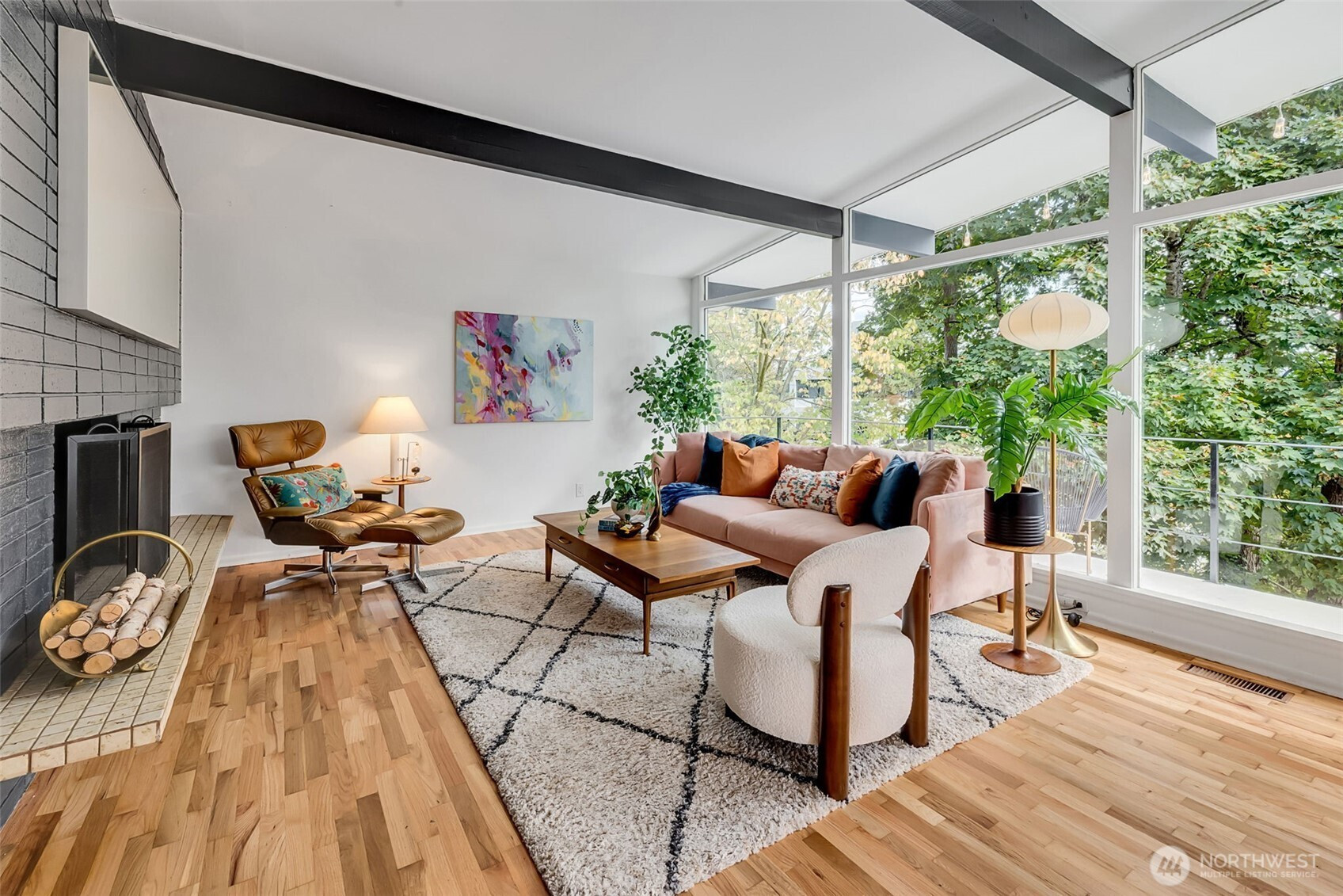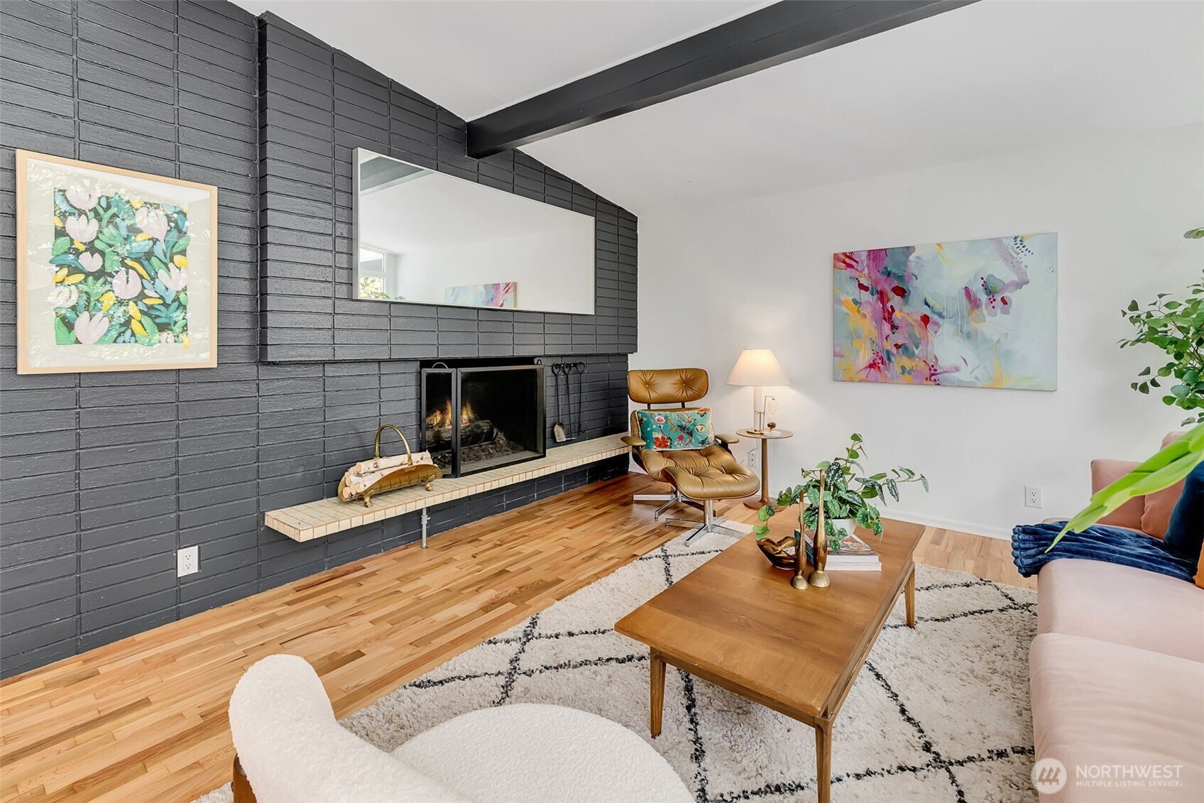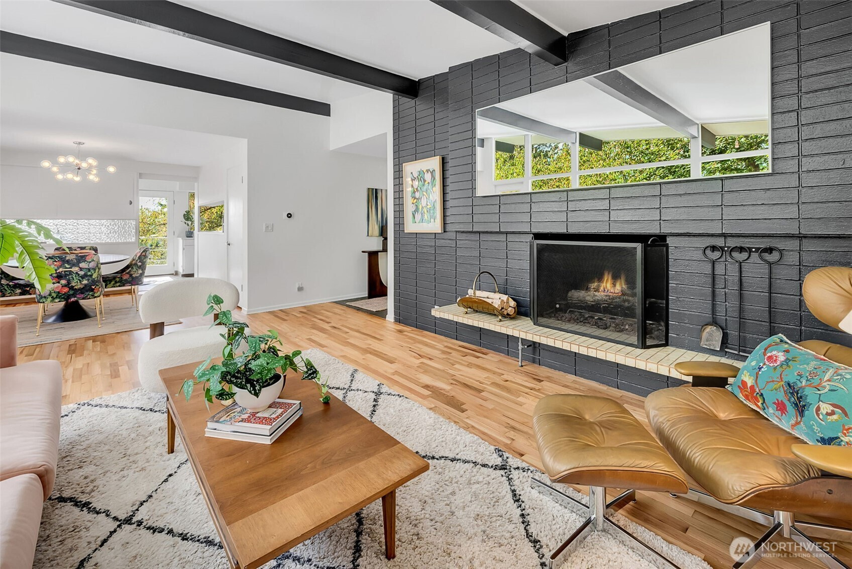 Beautifully updated mid-century modern rambler with walkout basement! This 4 bed, 1.75 bath home features vaulted ceilings, hardwood floors, and big windows with Mt. Rainier views from the eat-in kitchen. Two fireplaces plus living and family rooms offer flexible spaces. Main level has three bedrooms and a brand-new ¾ bath, while the lower level includes a large bedroom, full bath, and abundant storage. Enjoy a private yard, patio, sprinkler system, and carport for year-round dry access. Minutes to downtown Burien shops, cafes, and dining. Recent updates include new roof and furnace. Convenient to freeways and airport.