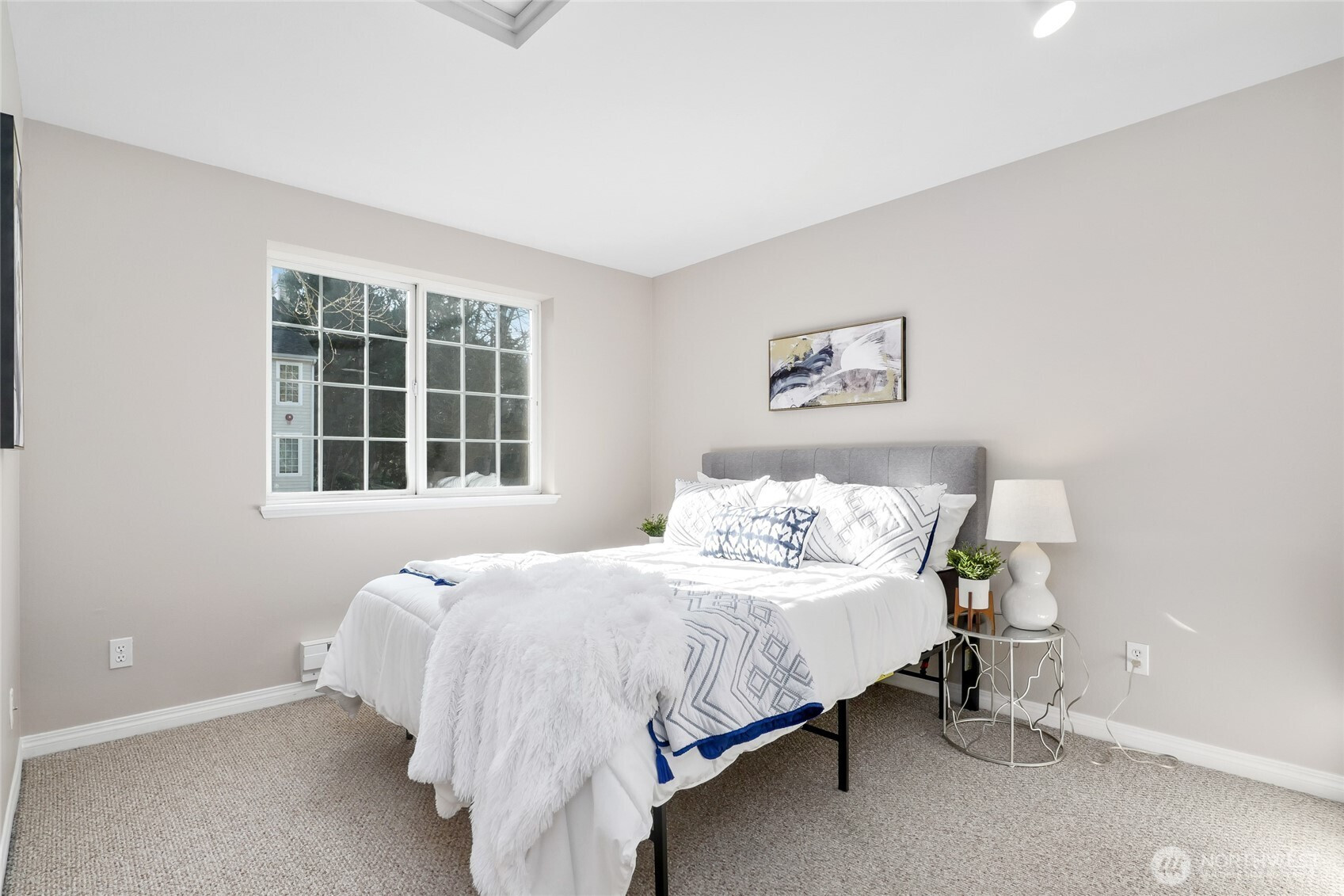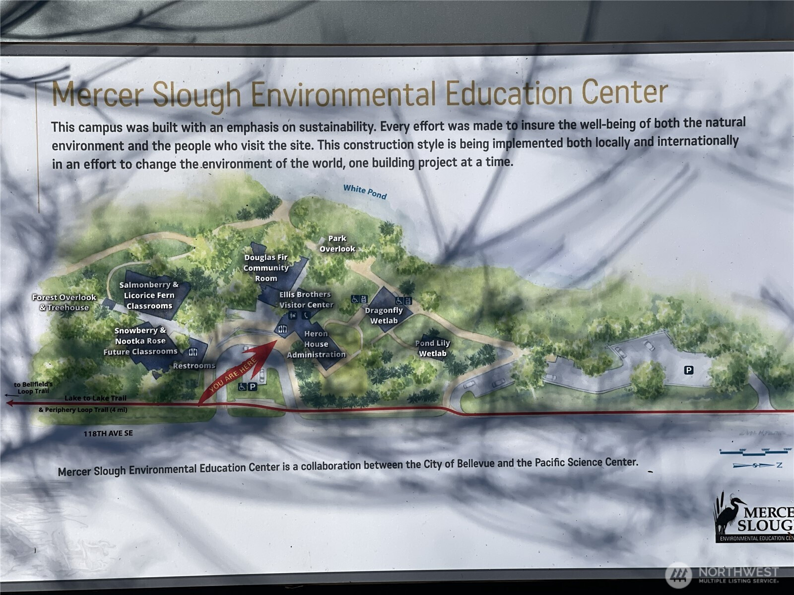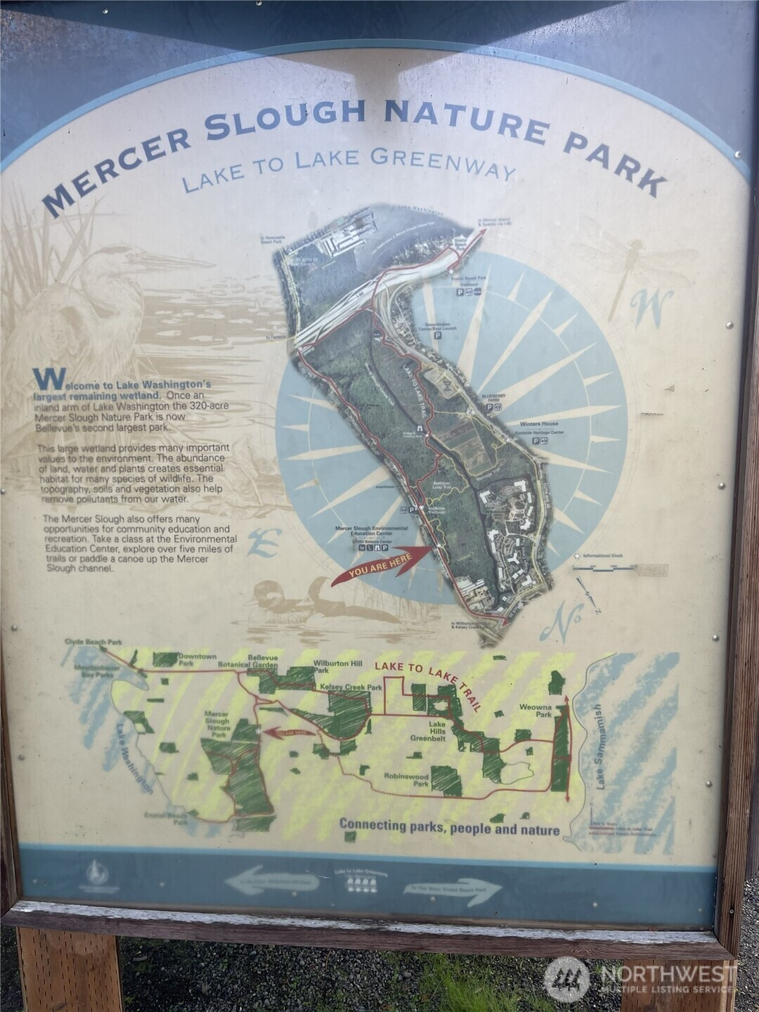 Bright and sunny top floor unit with vaulted ceilings. West facing deck overlooking the Mercer Environmental Center and wetlands. Well maintained home with many updates including kitchen and bathrooms. Individual garage and an uncovered parking space. Great location near downtown Bellevue with convenient access to I-405 & I-90. Across the street from the 329 acre Mercer Slough Nature Park a tranquil setting for walking, biking and observation. Backing to future Eastrail biking and hiking trail with EZ access to Downtown Bellevue and Link Rail, opening Fall 2026.