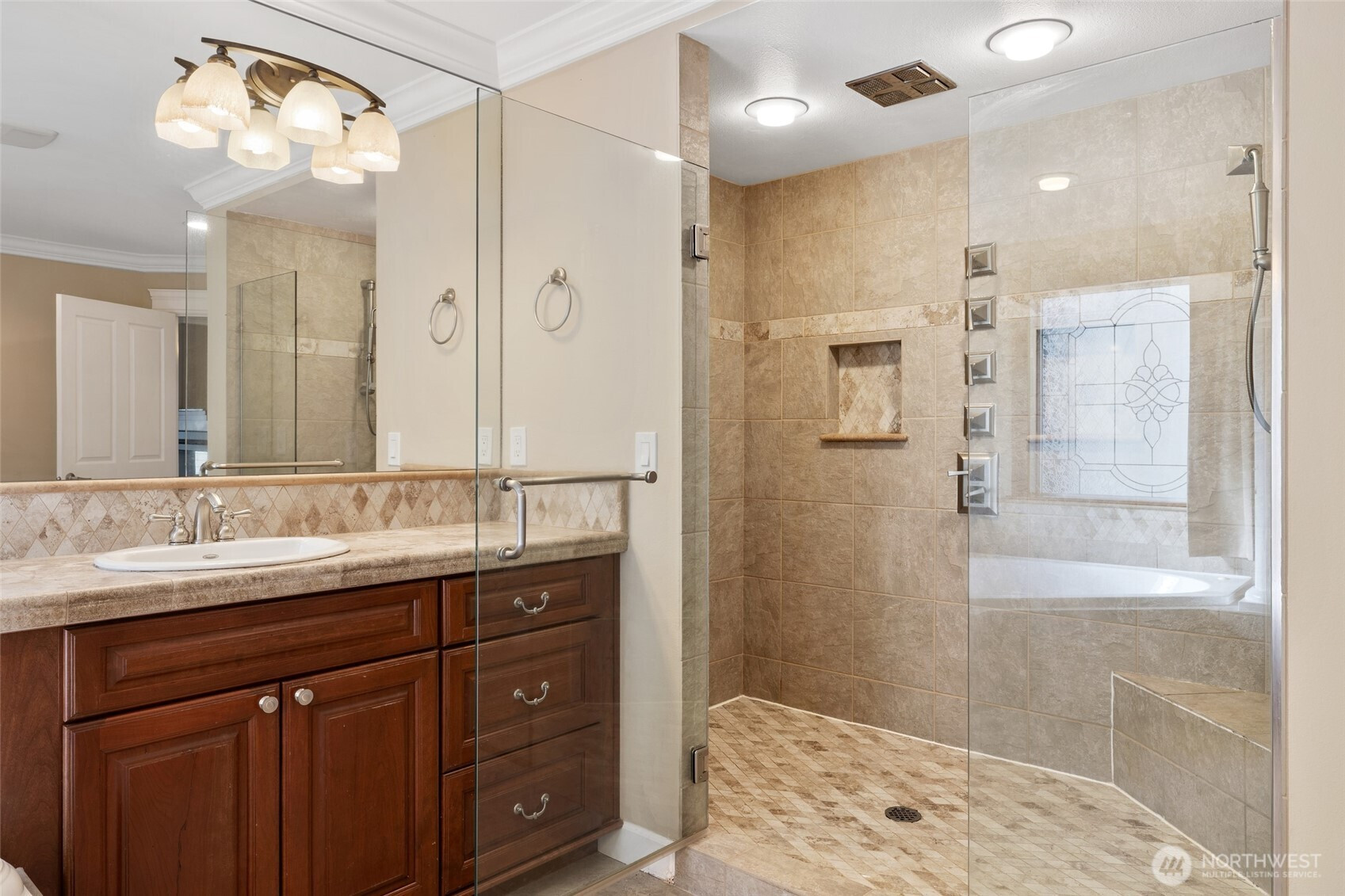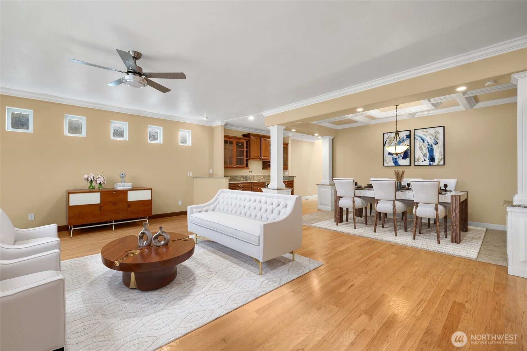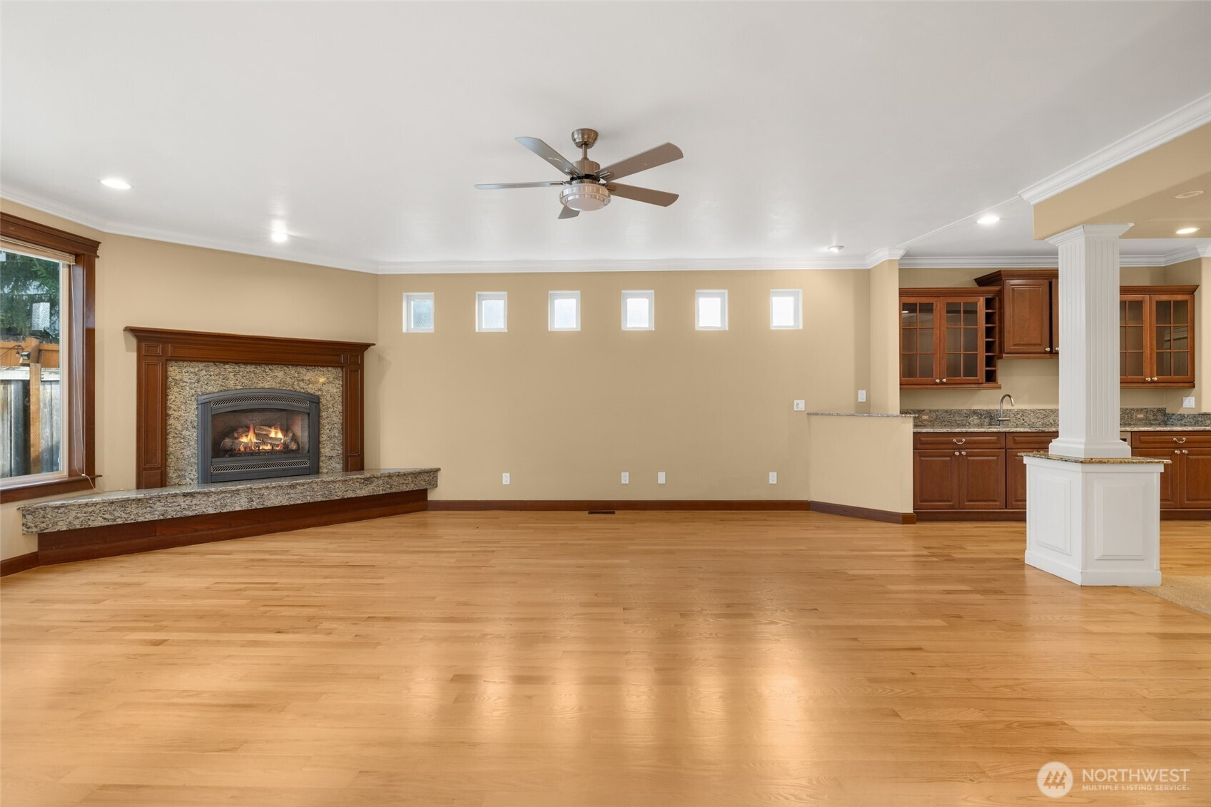 Impeccably maintained, exceptionally spacious, and beautifully designed—this Northshore School District home truly stands apart. A small-maintenance yard paired with a generously sized, feature-rich interior creates the perfect blend of comfort and convenience. Step inside to discover extravagant painted millwork, extensive cherry cabinetry, and a boxed-beam ceiling with elegant dining columns. The dining area includes a built-in buffet with wet bar and wine cooler, while the stunning island kitchen features a 6-burner gas cooktop and slab granite surfaces—ideal for both everyday cooking and entertaining. The grand primary suite offers a serene sitting area, a double-sided fireplace, and a luxury spa bath complete with separate vanities and an impressive 9-head shower. Additional bedrooms are extra-large and include a dual-vanity bath for added convenience. Recent updates include new carpet, refinished hardwood floors, and fresh interior paint, & a storage loft in garage - making this home truly move-in ready. A must-see property that delivers space, style, and exceptional craftsmanship; all located only blocks from Kirkland.