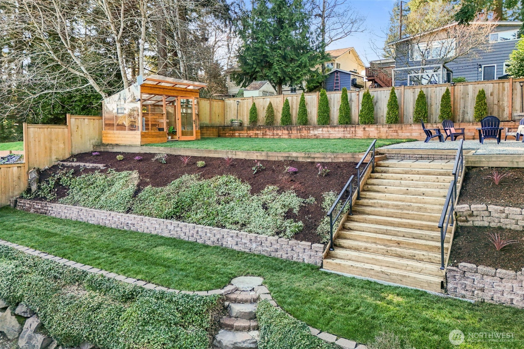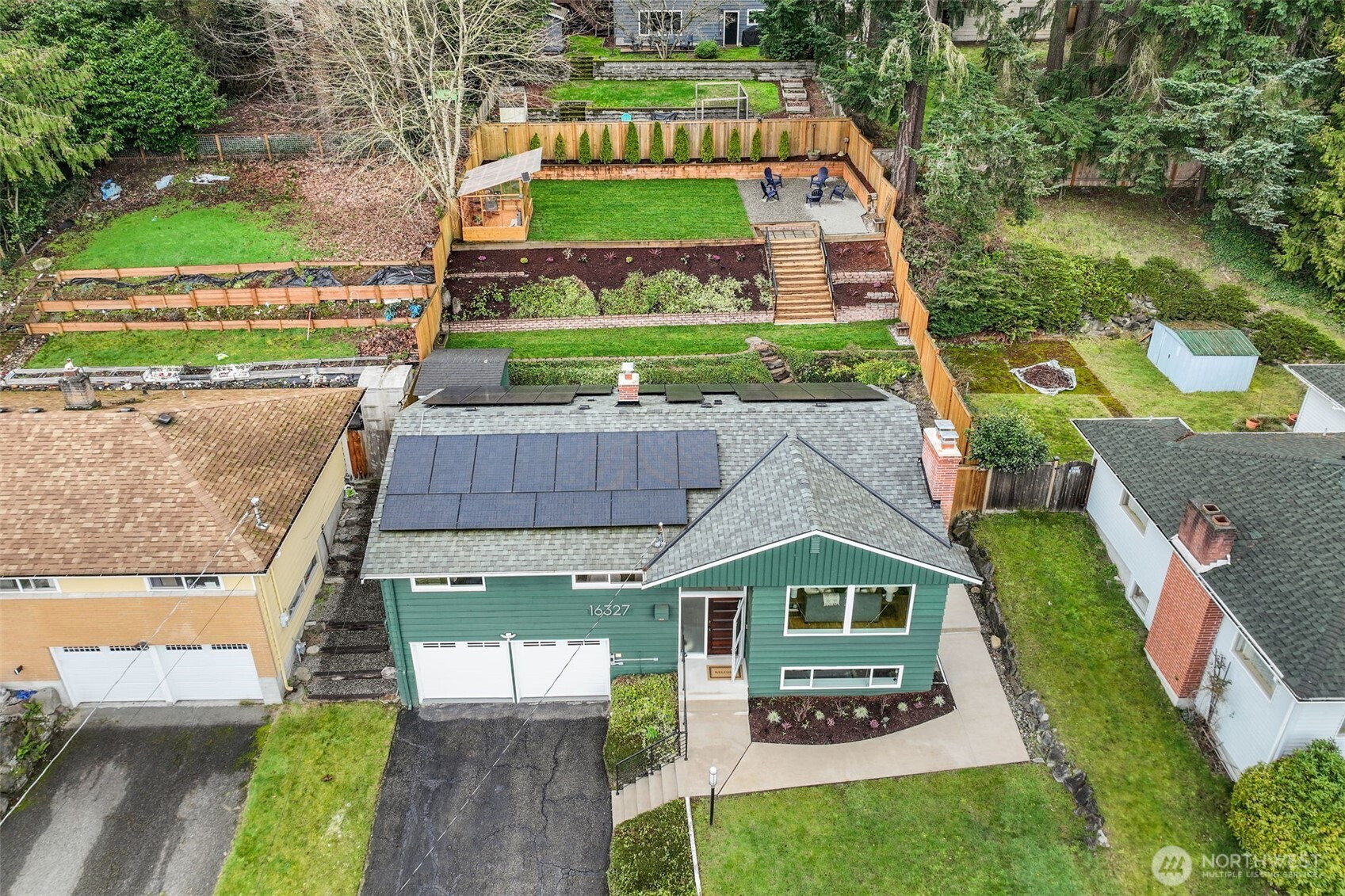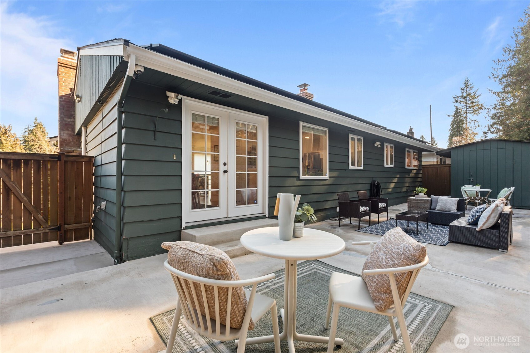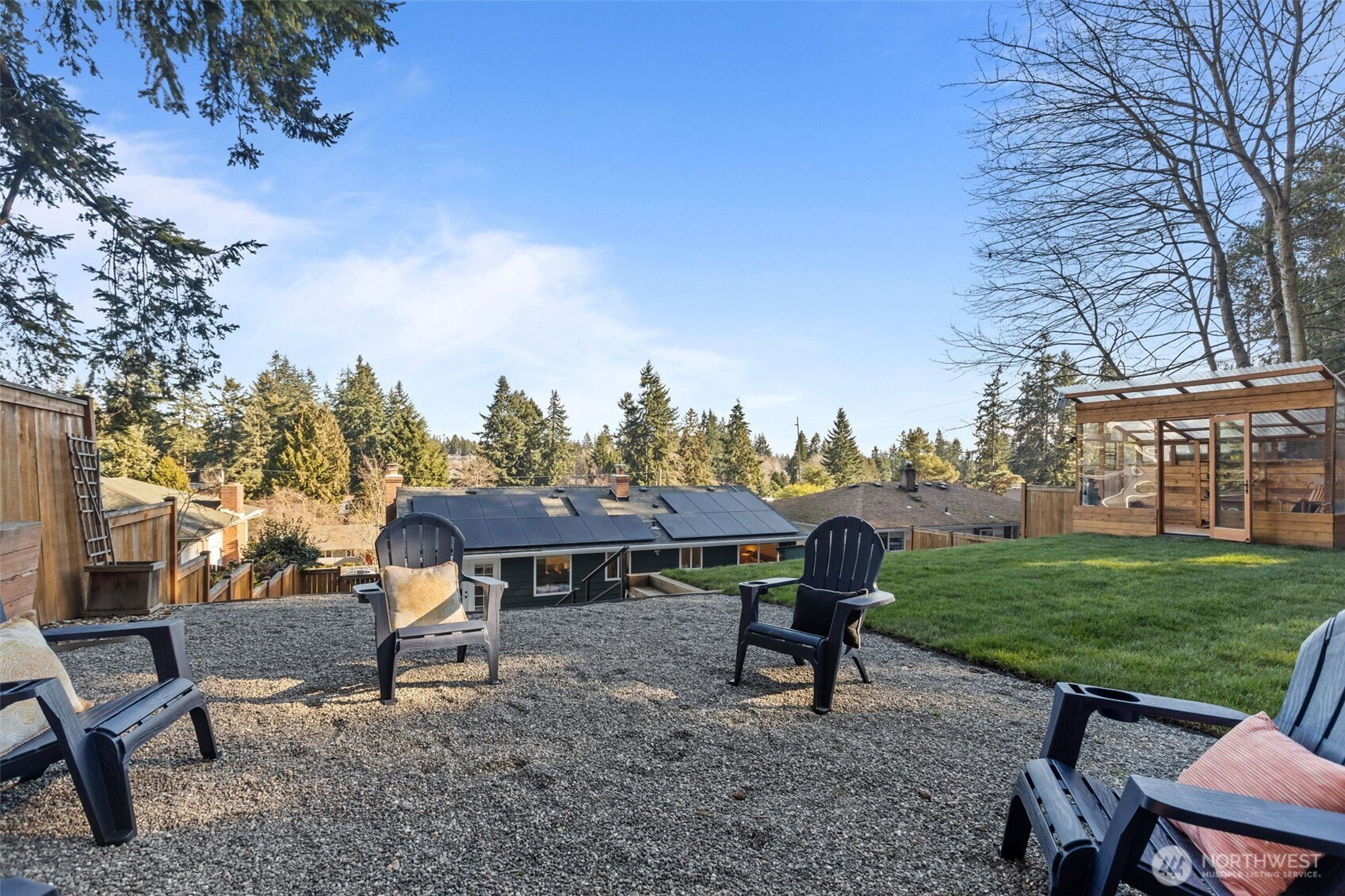 Mid-century charm meets modern comforts in this beautifully maintained 3-bdrm, 2-bath home with a natural flow between the living, dining, and kitchen spaces. Light-filled and east-facing with oversized picture windows and hardwood floors, this home offers energy-saving solar (2023), a newer roof (2021), A/C mini-splits, and central heat. Enjoy the chef’s kitchen with a gas range, quartz countertops, and a wine fridge. French doors open to a private, fully fenced outdoor sanctuary with easy-care landscaping, an expansive levelled terraced backyard, a large patio for entertaining, a gardener's greenhouse, and a storage shed. Spread out in the spacious lower-level bonus room with a cozy wood-burning fireplace and new carpet. Enjoy peace of mind with an updated exterior, painted in 2024, with updated siding. Tucked on a quiet street with minimal through traffic in a coveted Shoreline neighborhood, yet close to shops, grocery stores, parks, and trails. This home sits on a private 9,000 square foot lot with a spacious two-car garage and quick access to Light Rail, I-5, and Hwy 99, all within the highly rated Shoreline School District. Welcome home!