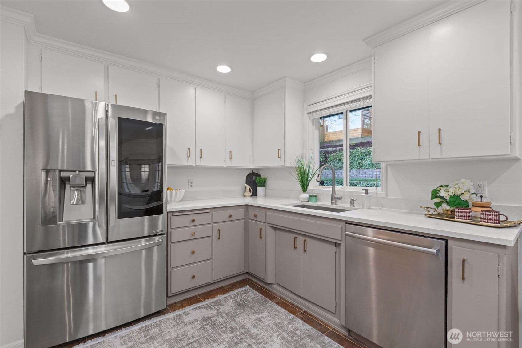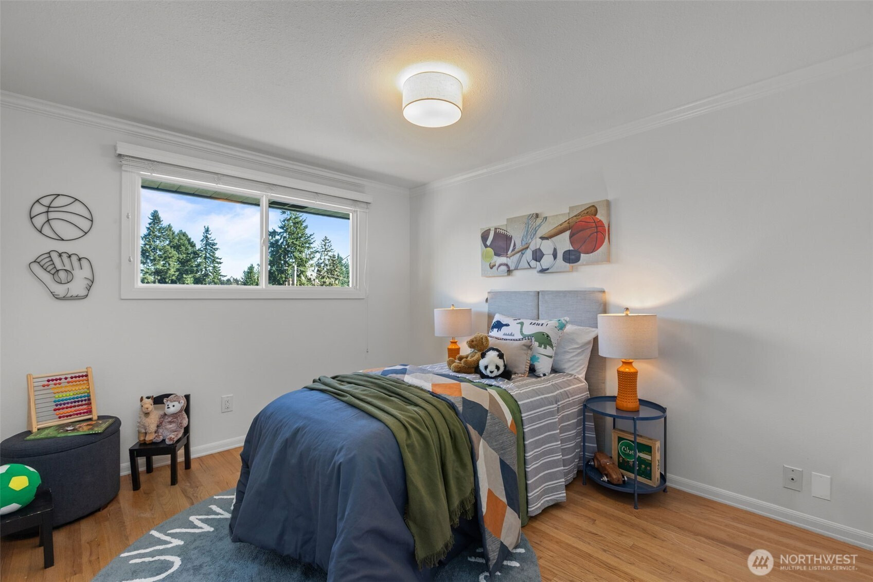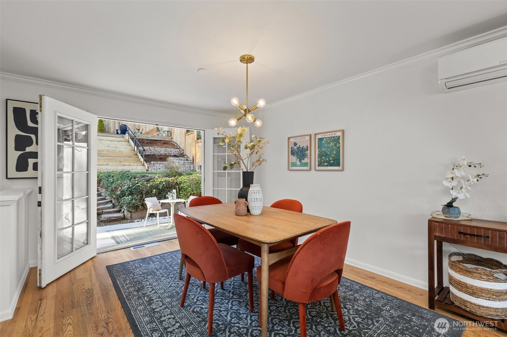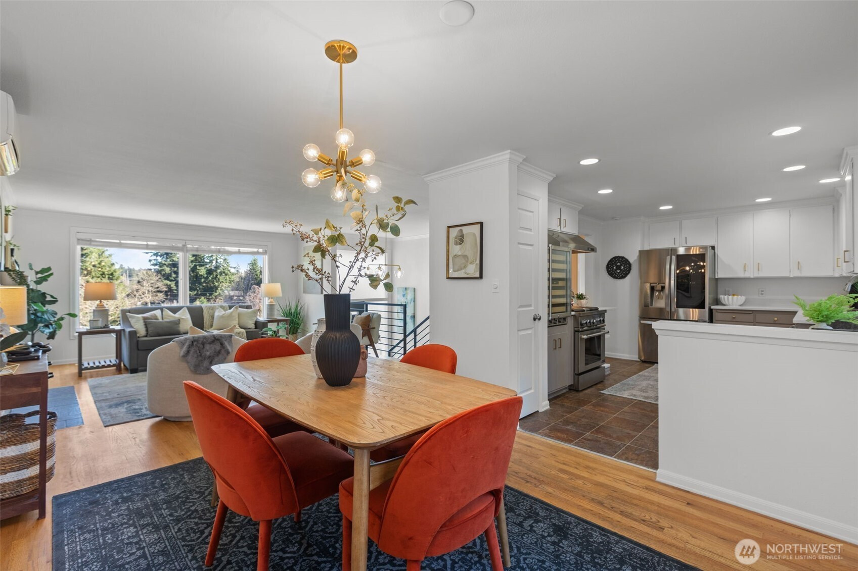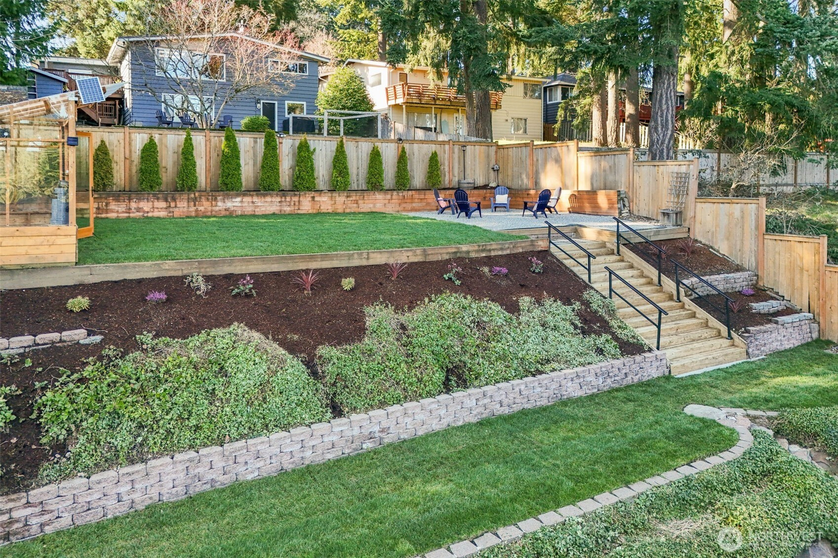 Mid-century charm meets modern comforts in this beautifully maintained 3-bdrm, 2-bath home with a natural flow between the living, dining, and kitchen spaces. Light-filled and east-facing with oversized picture windows and hardwood floors, this home offers energy-saving solar (2023), a newer roof (2021), A/C mini-splits, and central heat. Enjoy the chef’s kitchen with a gas range, quartz countertops, and a wine fridge. French doors open to a private, fully fenced outdoor sanctuary with easy-care landscaping, an expansive levelled terraced backyard, a large patio for entertaining, a gardener's greenhouse, and a storage shed. Spread out in the spacious lower-level bonus room with a cozy wood-burning fireplace and new carpet. Enjoy peace of mind with an updated exterior, painted in 2024, with updated siding. Tucked on a quiet street with minimal through traffic in a coveted Shoreline neighborhood, yet close to shops, grocery stores, parks, and trails. This home sits on a private 9,000 square foot lot with a spacious two-car garage and quick access to Light Rail, I-5, and Hwy 99, all within the highly rated Shoreline School District. Welcome home!