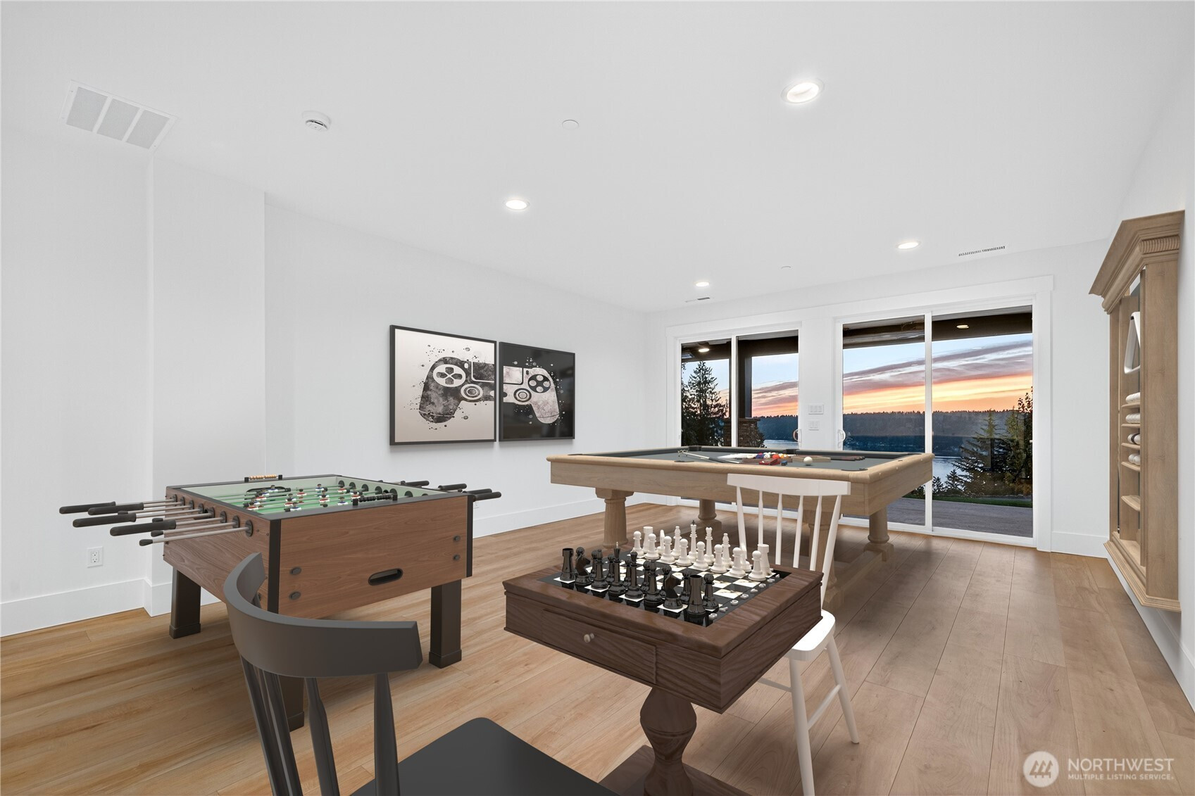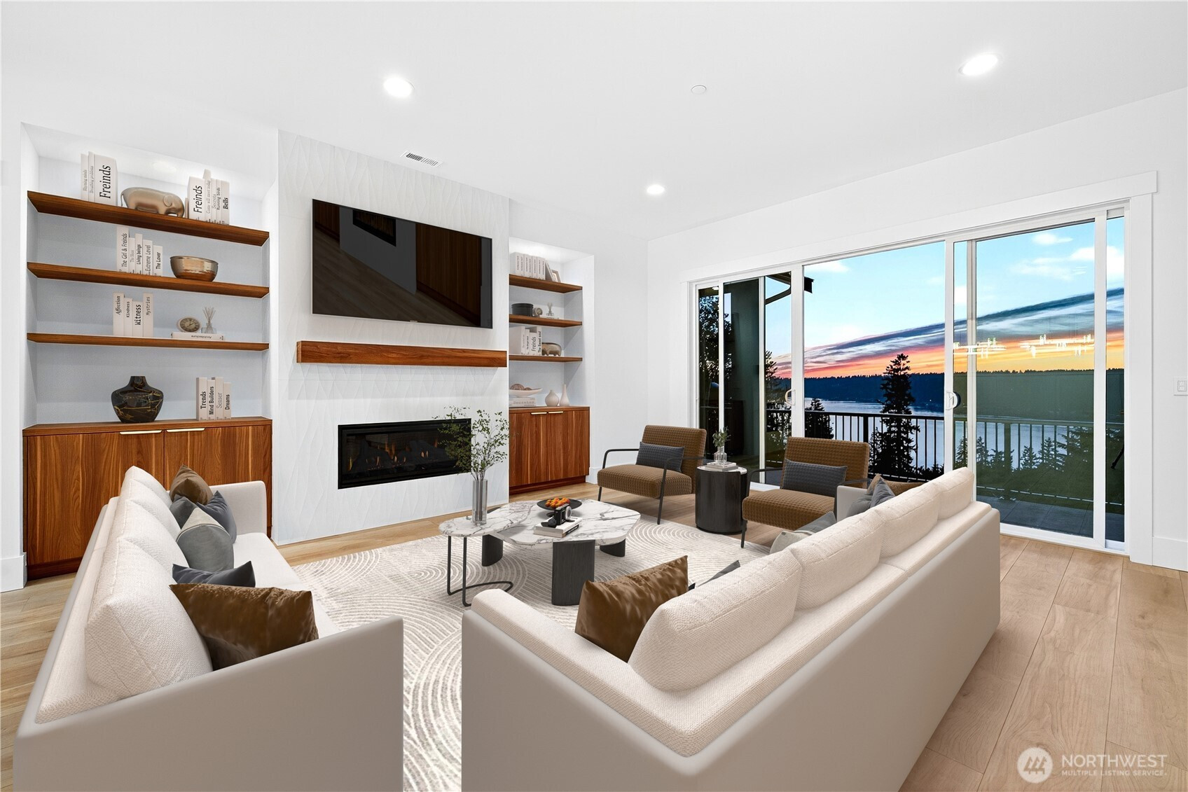 Exceptional luxury new construction in Sammamish’s Inglewood (Sammamish Sunset) neighborhood w/ sweeping Lake Sammamish views from every level. This 6,301 sqft home offers 6 beds, 5 baths, open-concept gourmet kitchen w/ high-end appliances, formal dining, sunlit great room, private office & guest ensuite. Easy main-level garage access means no stairs from car to kitchen, a rare find for the area. Two fridges on main, W/D on each floor, & tri-zone heating/cooling. Upper-level primary includes, spa-like bath w/ soaking tub (enjoy expansive lake views here too!) & large walk-in closet. Lower level includes rec room w/ wet bar & gym. Heated floors in multiple bathrooms, solar panels, & covered outdoor living. Top-rated Lake Washington schools.