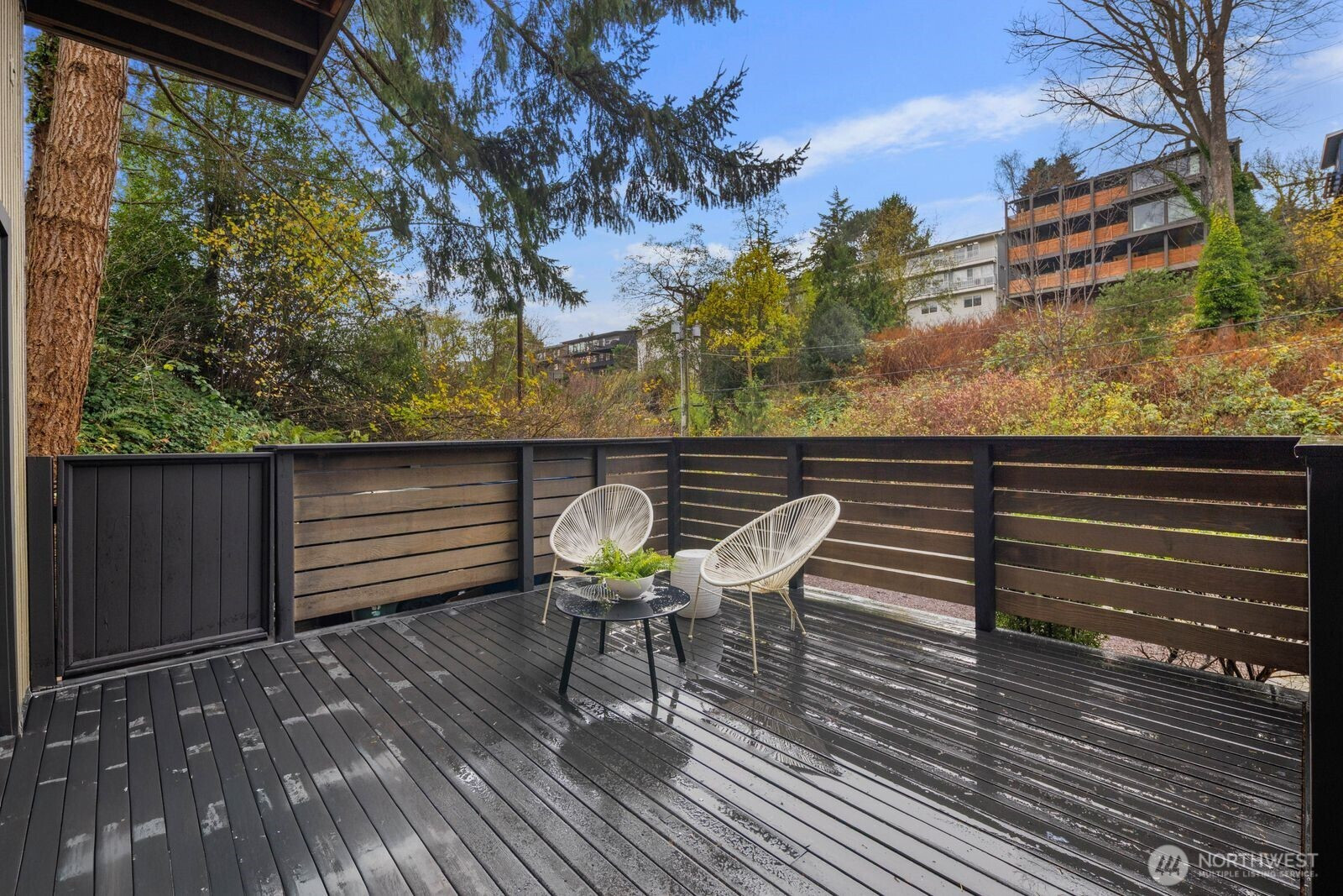 This NW Modern retreat offers rare privacy in a lush greenbelt, yet Magnolia Village is just around the corner. Sunlight pours through skylights, glass doors, and large windows, illuminating an elegant, freshly redesigned interior with a new designer kitchen, updated baths, and an airy open-concept layout. The lower-level features versatile spaces w/sweeping ceilings and a refined contemporary feel, while the upstairs carries a subtle MCM flair with clean lines and warm accents, creating a stylish, comfortable atmosphere. The 360° covered deck, lower terrace, and private gazebo beneath the evergreens offer spaces for year-round enjoyment. Located minutes from downtown, and with a hidden beachside park lying at the end of this quiet street.