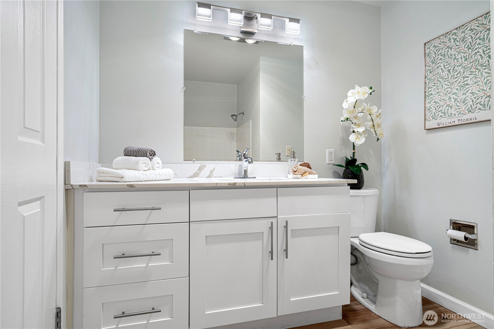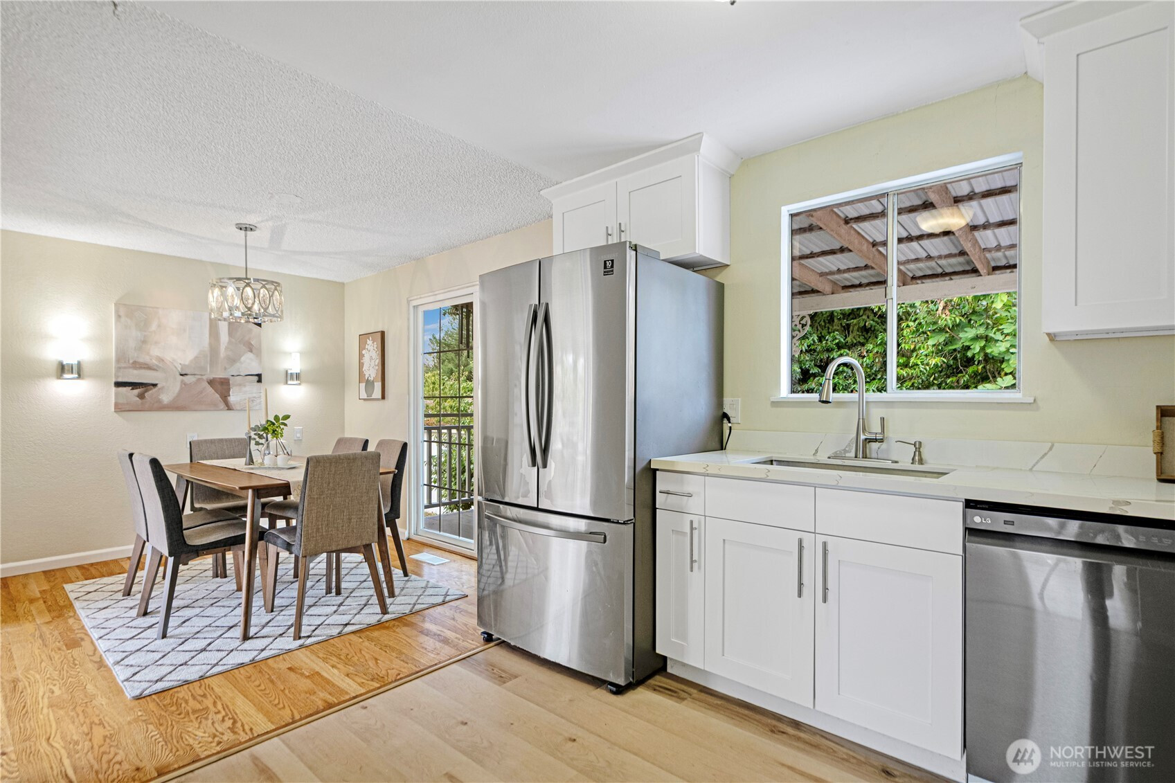 Beautifully updated 5-bedroom, 3-bath split-entry home in desirable Shoreline! Bright open floor plan with large windows, refinished hardwood floors, and two cozy wood-burning fireplaces. The fully remodeled kitchen features quartz countertops, new cabinets, and stainless-steel appliances. All bathrooms have been tastefully upgraded with modern tile and fixtures. Lower level offers a second kitchen, living area, and separate entrance—perfect for guests or MIL suite. Enjoy a private, fully fenced backyard with fruit trees, a spacious partially covered deck, and ample parking. Convenient location near schools, parks, light rail, and easy freeway access!