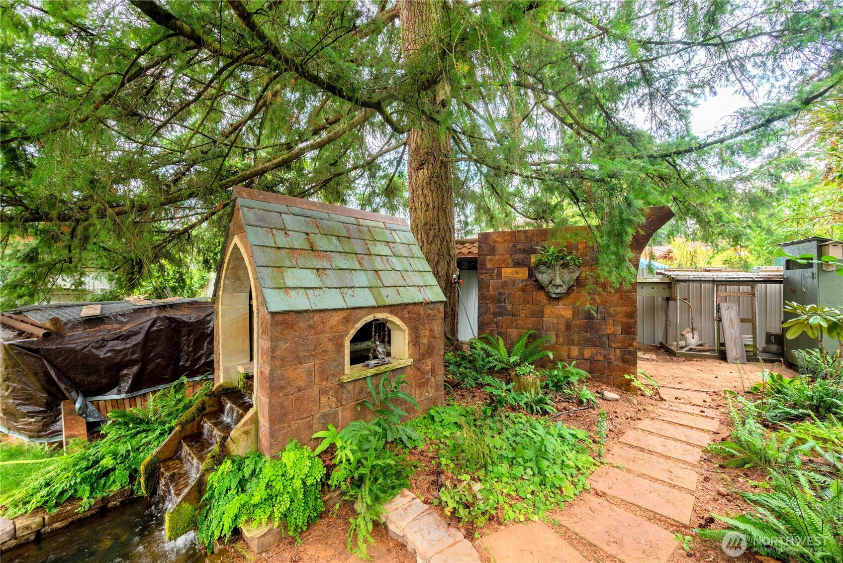 Quality-built, partially remodeled gem just ½ block from Hamlin Park and a short walk to Kellogg and Shorecrest. Garden lovers will appreciate raised concrete beds with supports, ready for your DIY greenhouse. NR3 zoning offers flexibility, with a perfectly sized lot for a DADU. Inside, 10 flexible rooms are bathed in natural light and centered around a cozy wood-burning fireplace. Updated bath with sleek glass shower, CAT6a, and audio wiring throughout. Outside, enjoy a solid tile roof, chicken coop, storage, a reverse-gravity stream water feature, a dramatic outdoor fireplace, new metal fencing, and a generous driveway—all set among towering evergreens for exceptional privacy. 2 car attached garage plus shop/potting shed/craft room off garage.