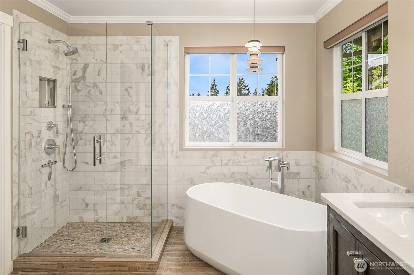The Vanderbilt at Northstar presents a refined and versatile open-concept design tailored for modern living. A grand foyer welcomes you with dramatic 18-foot ceilings, a skylight, rich white oak hardwoods, and an elegant, curved staircase. The adjacent dining room is bathed in natural light, highlighted by expansive windows and soaring 14-foot ceilings—perfect for sophisticated entertaining. The chef’s kitchen features a statement center island with gas cooktop, premium stainless KitchenAid appliances, and generous space for casual dining. It flows effortlessly into the inviting family room, anchored by a sleek gas fireplace. Two additional main-level rooms, each with their own fireplace, offer flexibility for a private office, den, or guest accommodations. Upstairs, the luxurious primary suite includes a serene sitting area, fireplace, and a fully remodeled spa-inspired bath with custom closet, freestanding tub, tile shower, heated floors and mirrors, and dual vanities. A spacious bonus room completes the upper level, ideal for a home theater, fitness studio, or game room. Outstanding three-car garage with high ceilings, bright lighting, custom flooring, secure storage and workspace. Set on a quiet street in a well-established neighborhood, this home offers seamless access to parks, shopping, dining, major highways, nearby transit options, and Lake Washington Schools —delivering both convenience and elevated living.