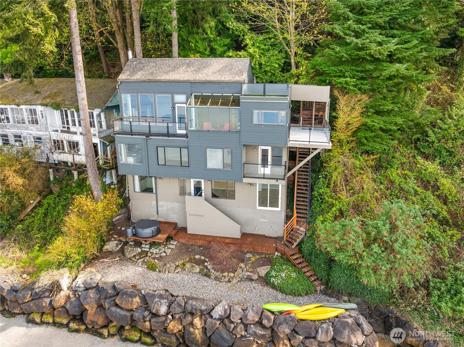 Welcome to Maplewild—An opportunity to own 60 feet of low-bank waterfront and enjoy true Pacific Northwest living. This inviting 4-bedroom, 2.25-bath home blends comfort, flexibility, and an unbeatable connection to the water. Imagine living in a peaceful, private setting that feels worlds away, yet remains conveniently close to the city. Inside, natural light fills the open living spaces, where large windows frame calming waterfront views. The layout is ideal for everyday living and entertaining, with seamless flow between the kitchen, dining, and living area. Four bedrooms offer versatility for guests, work-from-home needs, or extended living. Step outside and embrace the lifestyle. The gentle, low-bank shoreline provides easy access for kayaking, paddleboarding, beachcombing, or simply relaxing by the water. A 34' boat anchor and buoy adds the convenience of private moorage, making spontaneous boating and sunset cruises effortless. Unwind in your private hot tub, perfectly positioned to take in the surrounding serenity, an ideal spot to relax under the stars after a day on the water. Above it all, the rooftop deck offers sweeping panoramic views, creating an incredible space for entertaining or quiet reflection. Maplewild is more than a home; it’s a secluded waterfront retreat where privacy, comfort, and natural beauty come together.