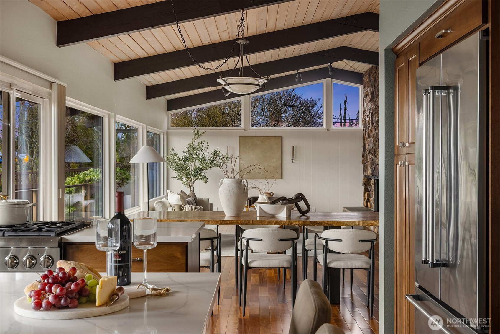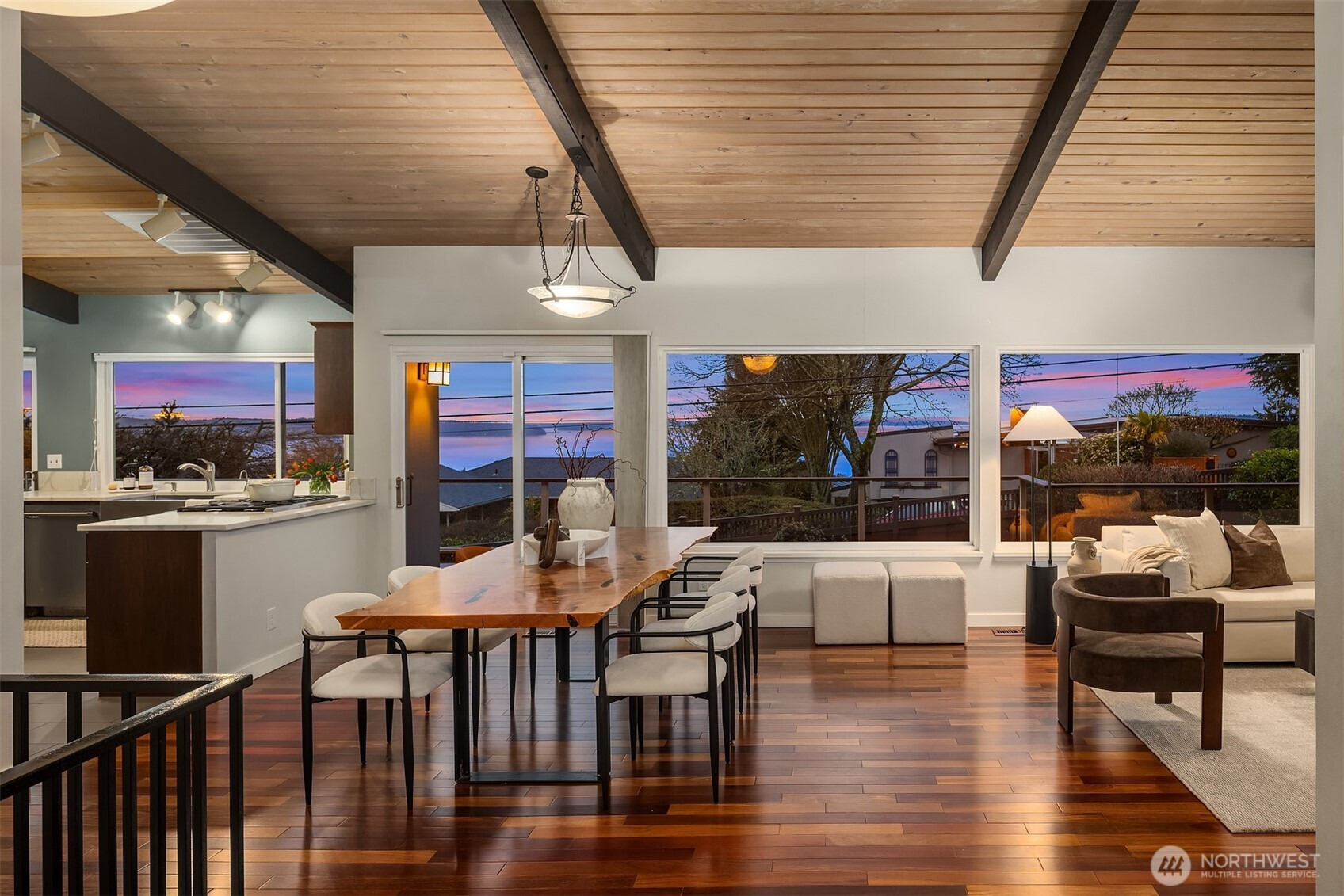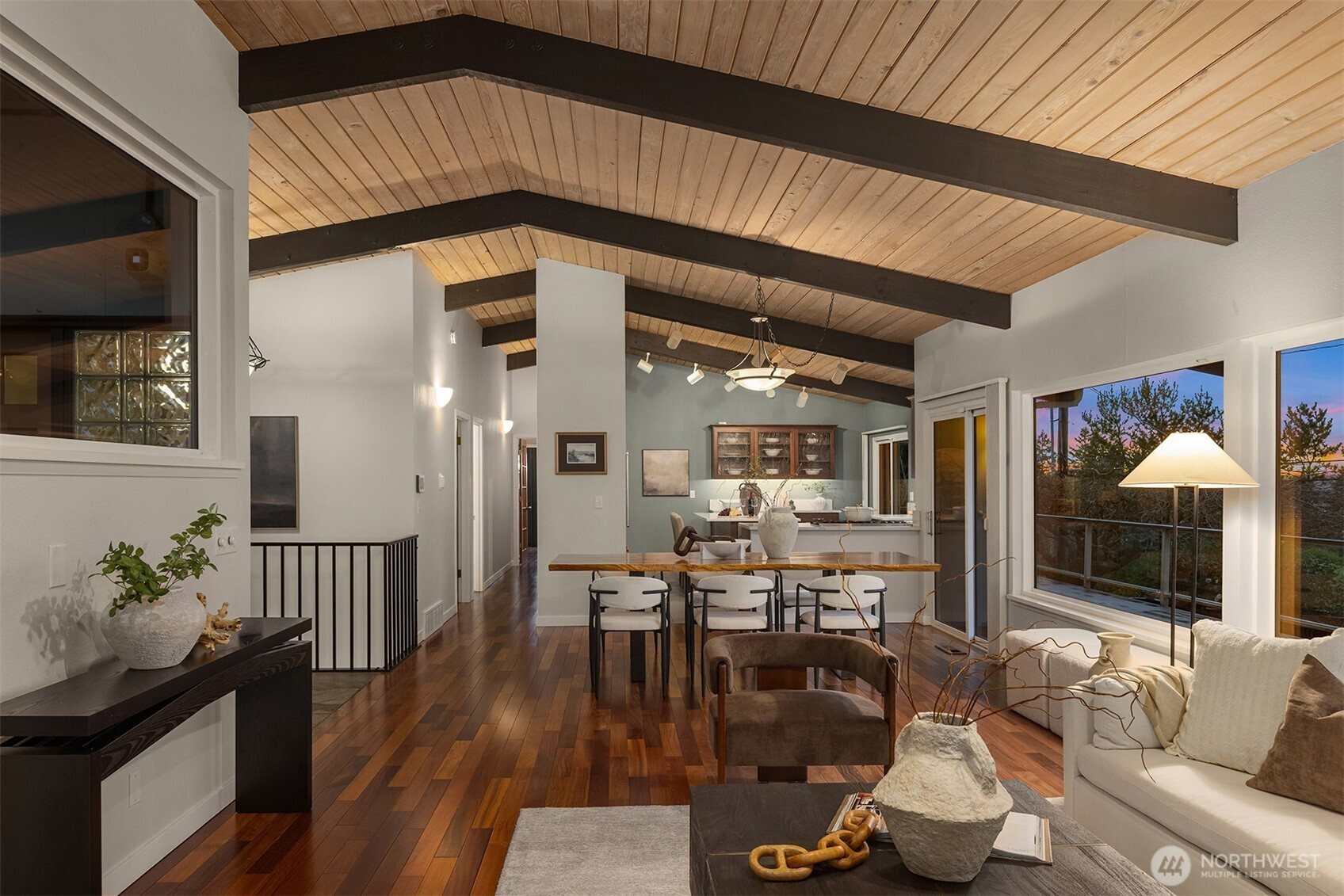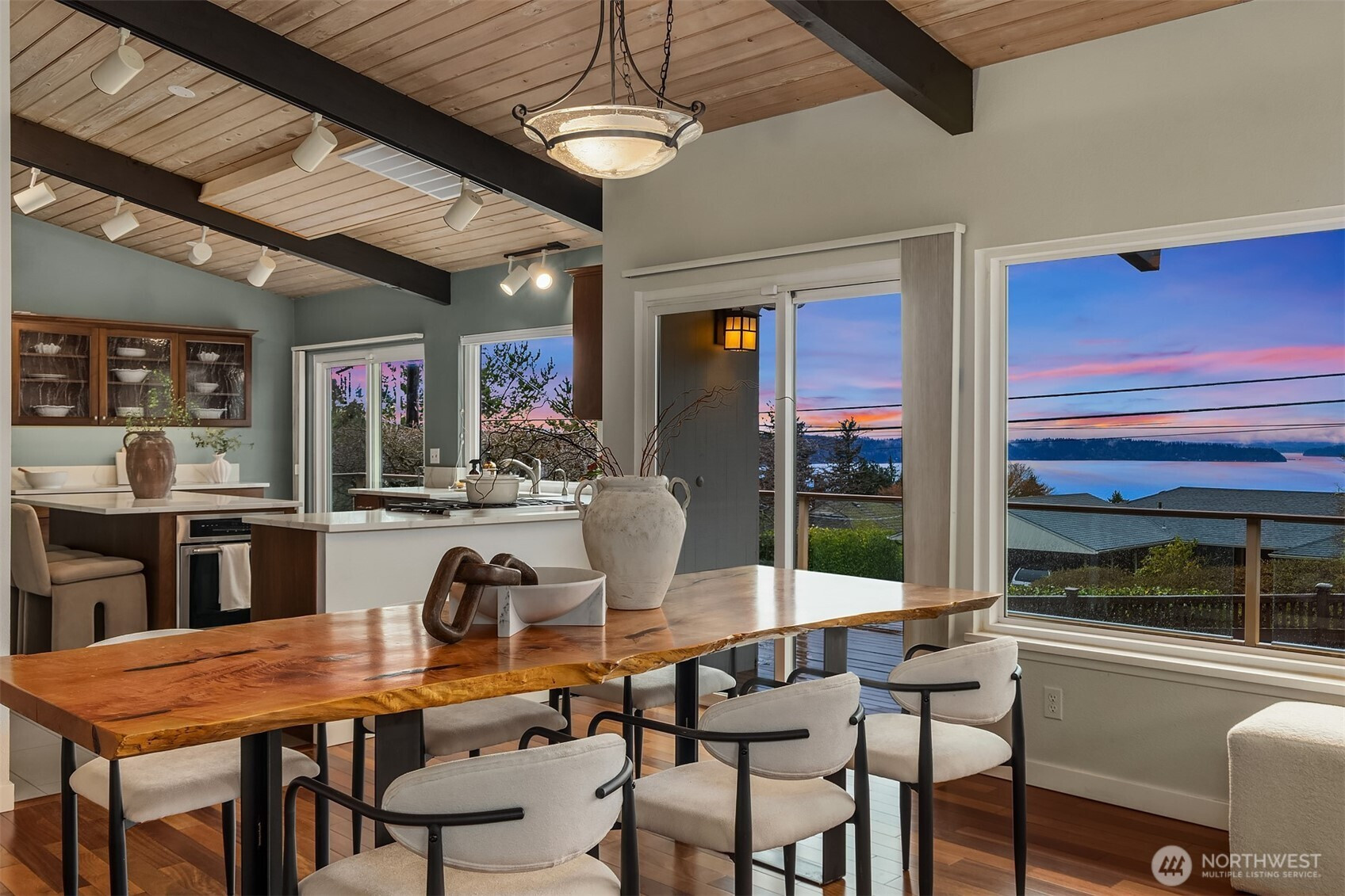 A Home, A Lifestyle… Located on Three Tree Point Heights, and overlooking Puget Sound and Olympic views, this architectural Northwest home offers convenience, comfort and versatility. Step into a spacious and open interior where one feels good: vaulted ceilings, walls of picture windows and natural elements. Cozy up by the stone fireplace with a good book, cook in the fully renovated kitchen while enjoying a lively conversation with friends and step onto the wrap around deck to breathe in the sea air. The easy floor plan offers main level living (without stairs if desired) and enjoys 2 bedrooms including a sizable primary ensuite with its spa bathroom and private access to a secluded deck & jacuzzi. The garden level boasts a wide array of uses with its sizable rec room, 3 additional bedrooms and own private patio and entrance: ideal as guest quarters, ADU or work retreat. Fully fenced, the mature grounds represent the ideal setting for fun Summer parties & barbecues around the swimming pool which adds an exotic feel to this wonderful property. Two sets of carports for 4+ cars, ample extra parking & storage. New HVAC system and membrane roof. Pick your own fresh raspberries in the warm season. Grow tomatoes and your own herbs on the sunny courtyard. A stone's throw to public beaches, minutes to Olde Burien's quaint shops and restaurants and a short drive to SeaTac international airport. Welcome to this peaceful and delightful place!
