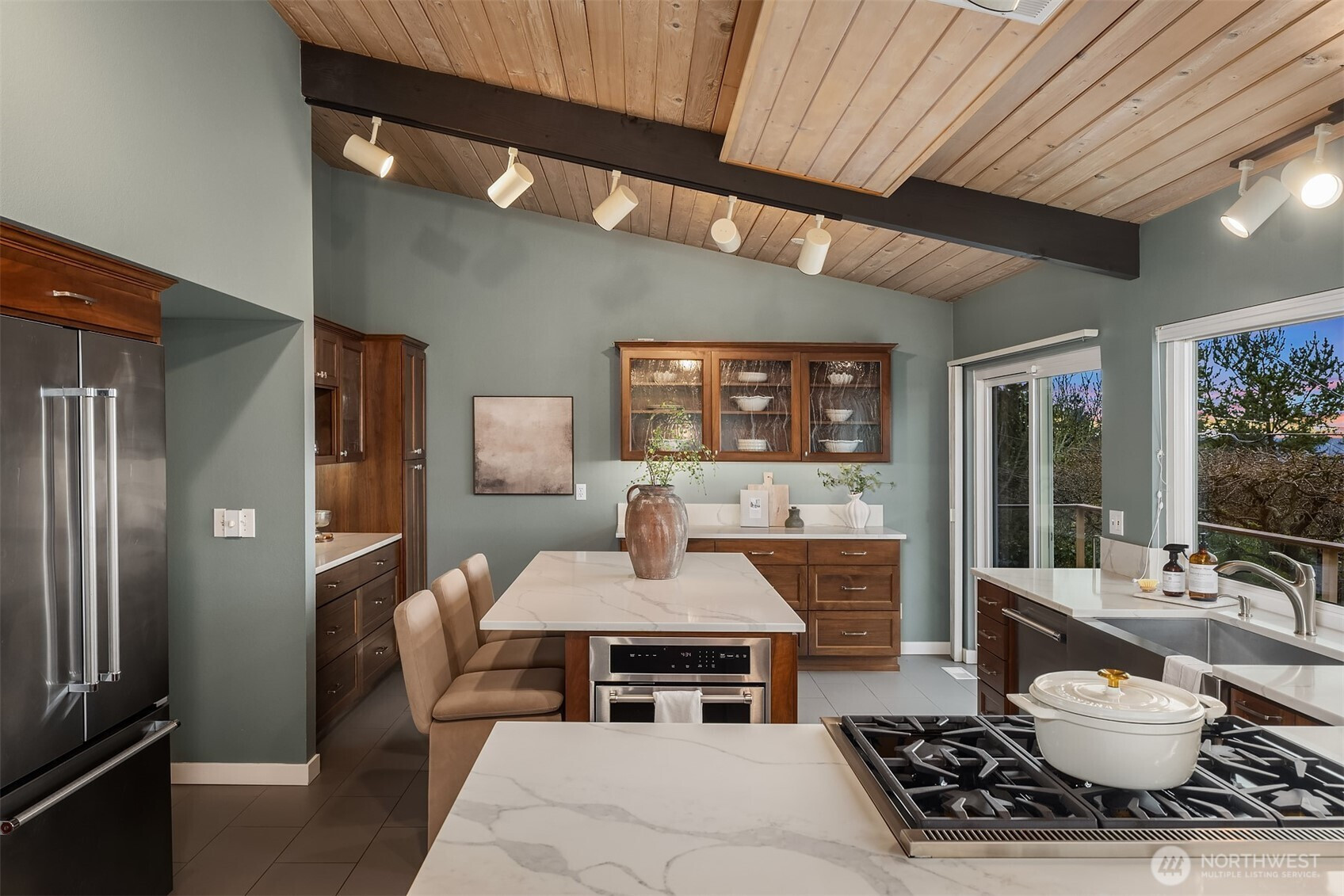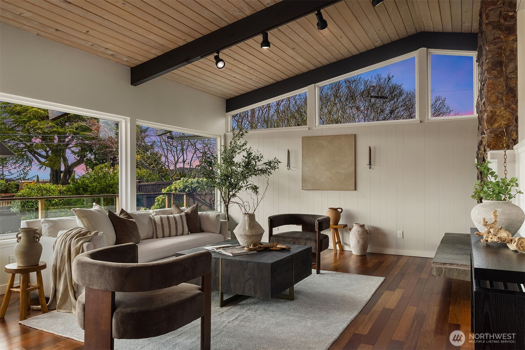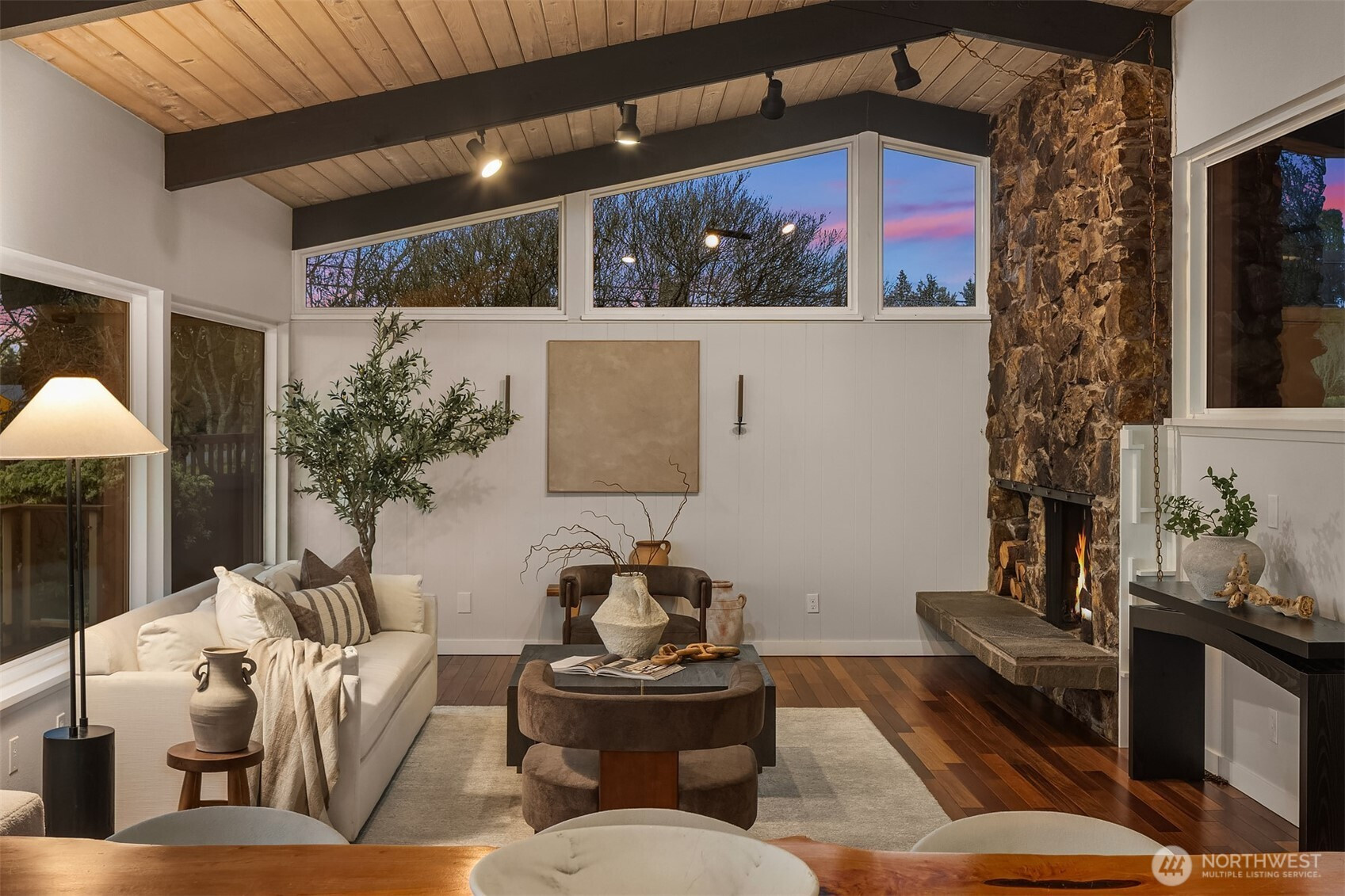 A Home, A Lifestyle… Located on Three Tree Point Heights, and overlooking Puget Sound and Olympic views, this architectural Northwest home offers convenience, comfort and versatility. Step into a spacious and open interior where one feels good: vaulted ceilings, walls of picture windows and natural elements. Cozy up by the stone fireplace with a good book, cook in the fully renovated kitchen while enjoying a lively conversation with friends and step onto the wrap around deck to breathe in the sea air. The easy floor plan offers main level living (without stairs if desired) and enjoys 2 bedrooms including a sizable primary ensuite with its spa bathroom and private access to a secluded deck & jacuzzi. The garden level boasts a wide array of uses with its sizable rec room, 3 additional bedrooms and own private patio and entrance: ideal as guest quarters, ADU or work retreat. Fully fenced, the mature grounds represent the ideal setting for fun Summer parties & barbecues around the swimming pool which adds an exotic feel to this wonderful property. Two sets of carports for 4+ cars, ample extra parking & storage. New HVAC system and membrane roof. Pick your own fresh raspberries in the warm season. Grow tomatoes and your own herbs on the sunny courtyard. A stone's throw to public beaches, minutes to Olde Burien's quaint shops and restaurants and a short drive to SeaTac international airport. Welcome to this peaceful and delightful place!