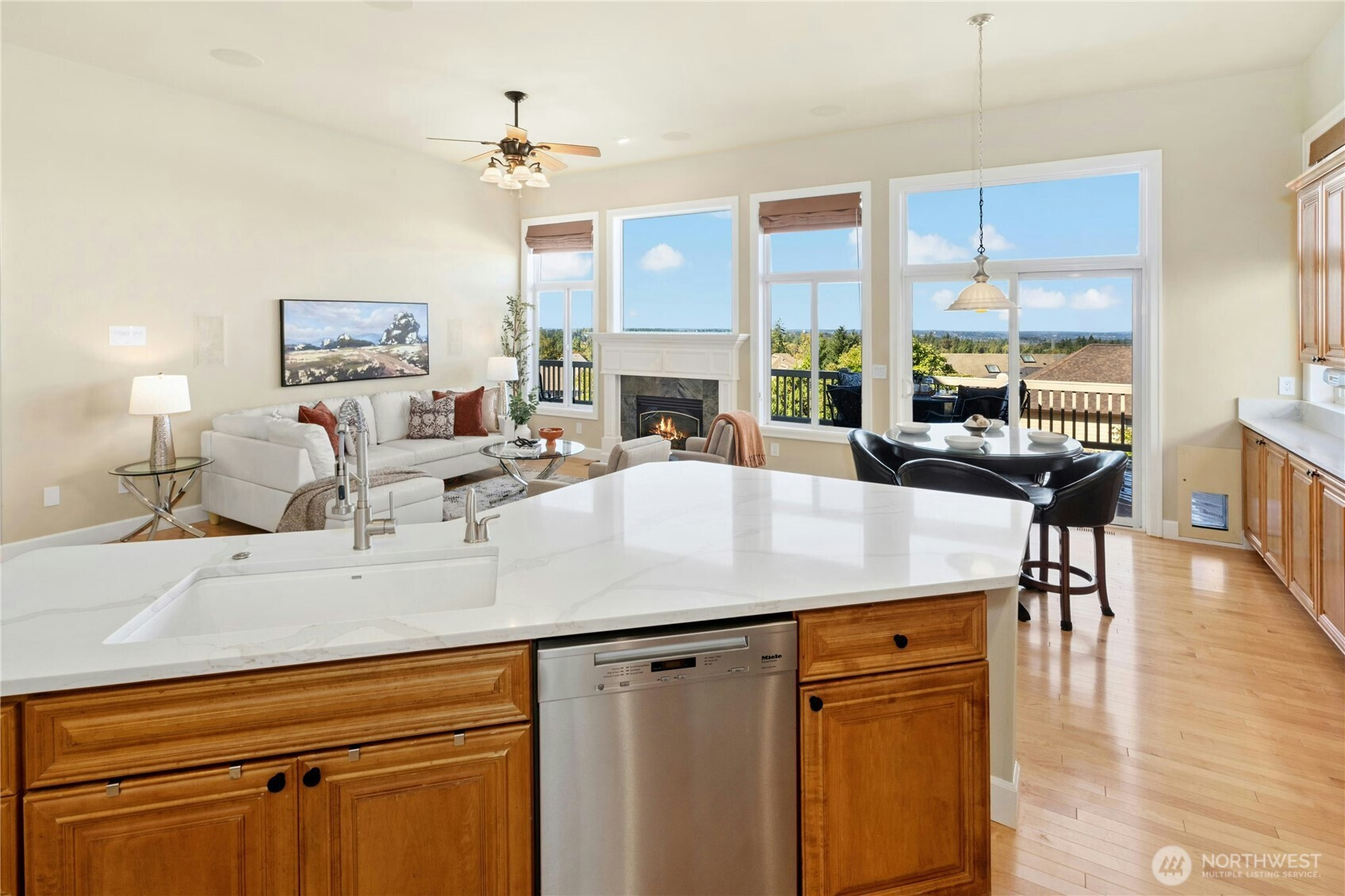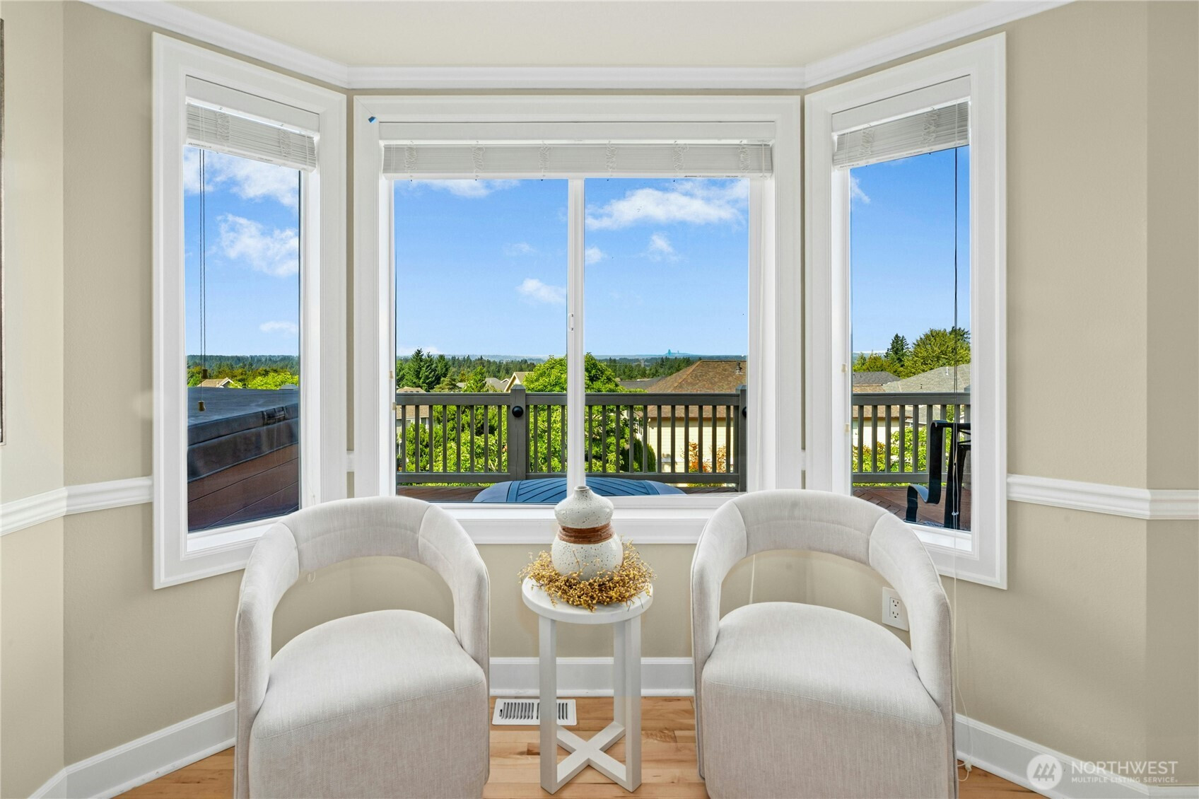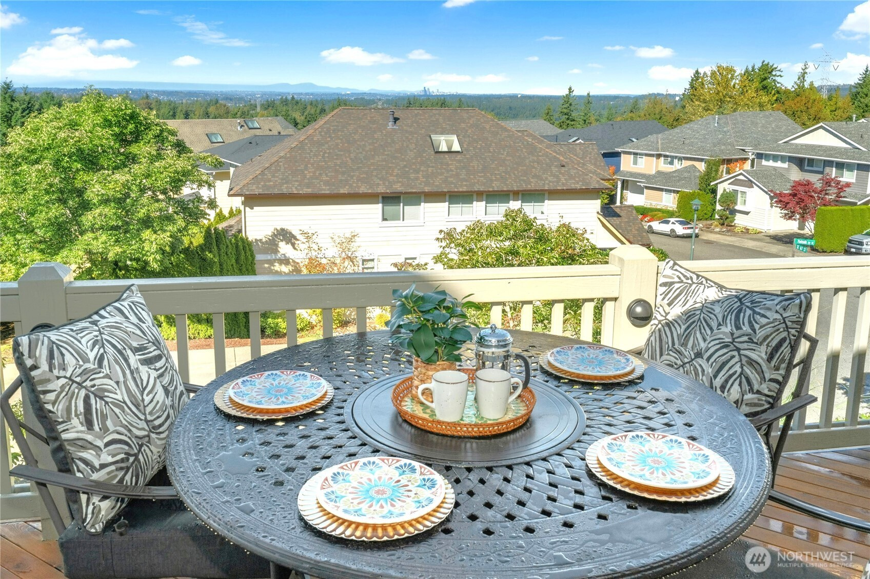Privately nestled at the top of Woodside at McGarvey Park by Donogh Homes with unmatched livability: MAIN FLOOR OWNER SUITE & 2nd bedroom by ¾ bathroom. Unobstructed VIEWS of sparkling Seattle skyline, Olympics, colorful sunsets, firework shows. Gorgeous kitchen w/warm cider cabinets, new quartz counters, statement 50k BTU Italian range, walk-in pantry. Gather in bonus room upstairs or great room opening to 600sf VIEW deck w/hot tub. Many community parks/trails steps away. NW detailing: rich hues of stacked stone, hardwoods, travertine, quartzite, tall ceilings, classic millwork. 3-car garage, Tesla EVC, A/C, healthy furnace UV filtration. New roof/furnace/paint. Fun, social neighborhood, Summer events, disc golf coming. EAST FACING door!