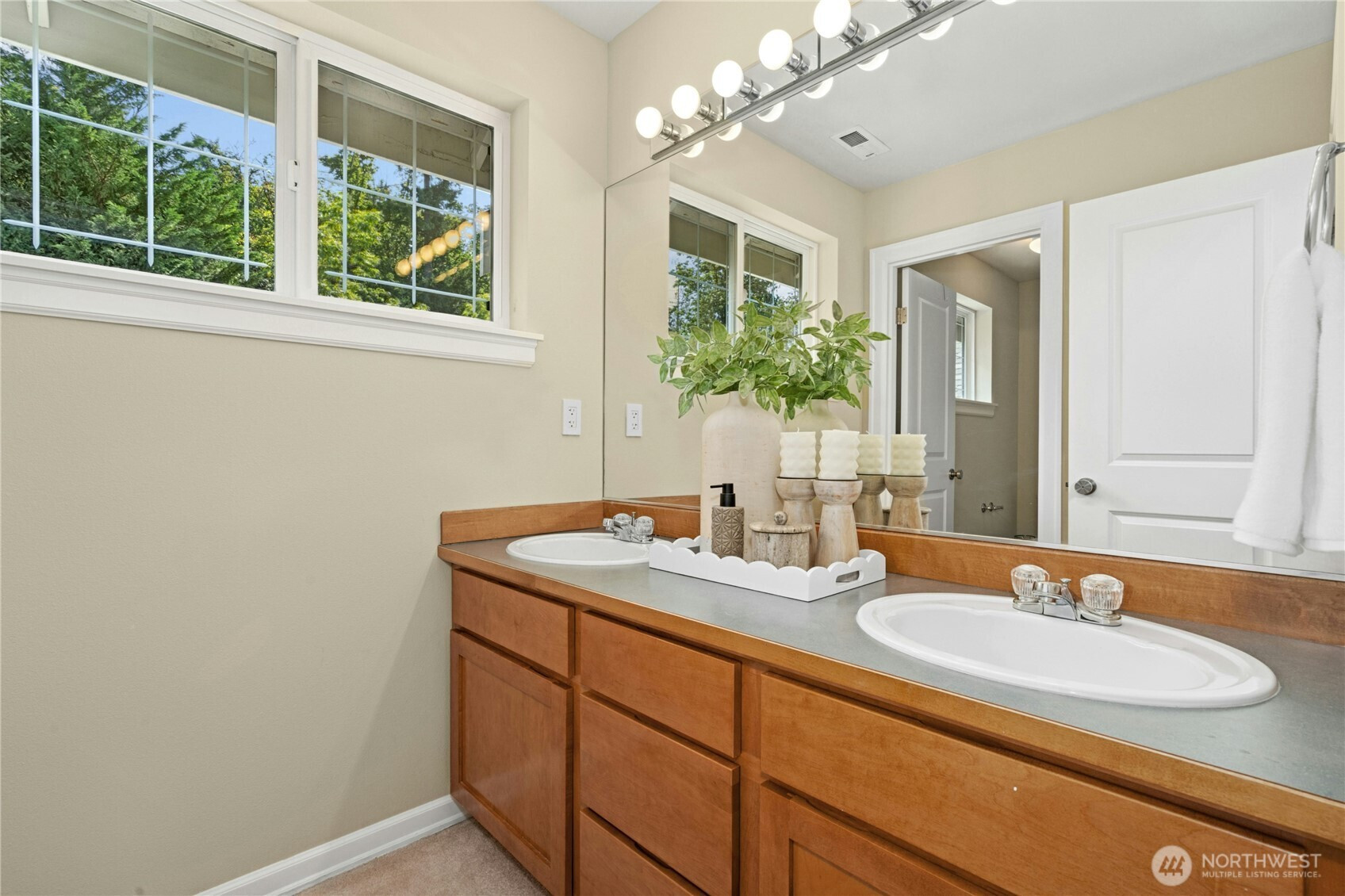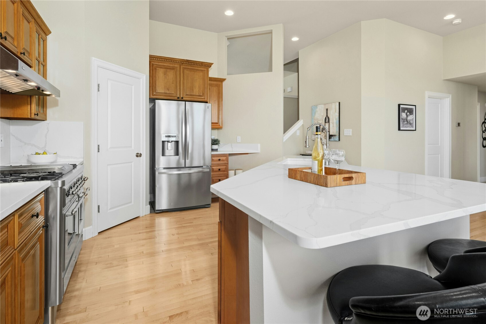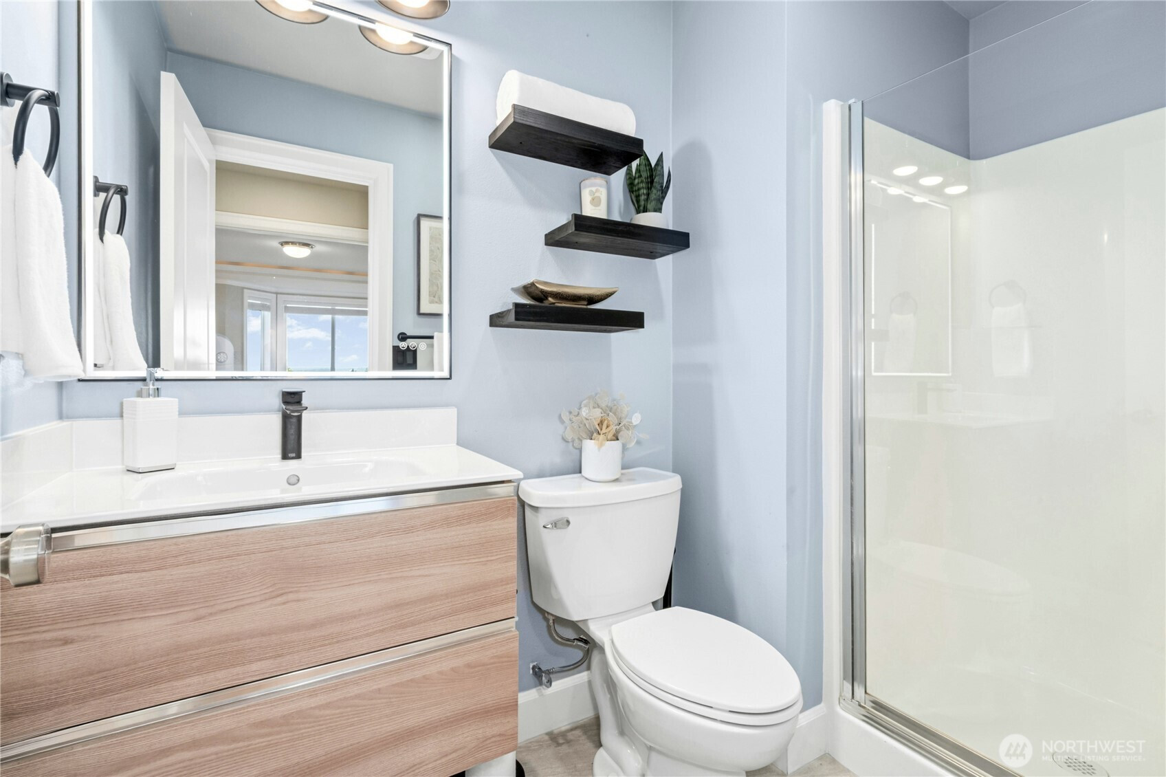 Privately nestled at the top of Woodside at McGarvey Park by Donogh Homes with unmatched livability: MAIN FLOOR OWNER SUITE & 2nd bedroom by ¾ bathroom. Unobstructed VIEWS of sparkling Seattle skyline, Olympics, colorful sunsets, firework shows. Gorgeous kitchen w/warm cider cabinets, new quartz counters, statement 50k BTU Italian range, walk-in pantry. Gather in bonus room upstairs or great room opening to 600sf VIEW deck w/hot tub. Many community parks/trails steps away. NW detailing: rich hues of stacked stone, hardwoods, travertine, quartzite, tall ceilings, classic millwork. 3-car garage, Tesla EVC, A/C, healthy furnace UV filtration. New roof/furnace/paint. Fun, social neighborhood, Summer events, disc golf coming. EAST FACING door!