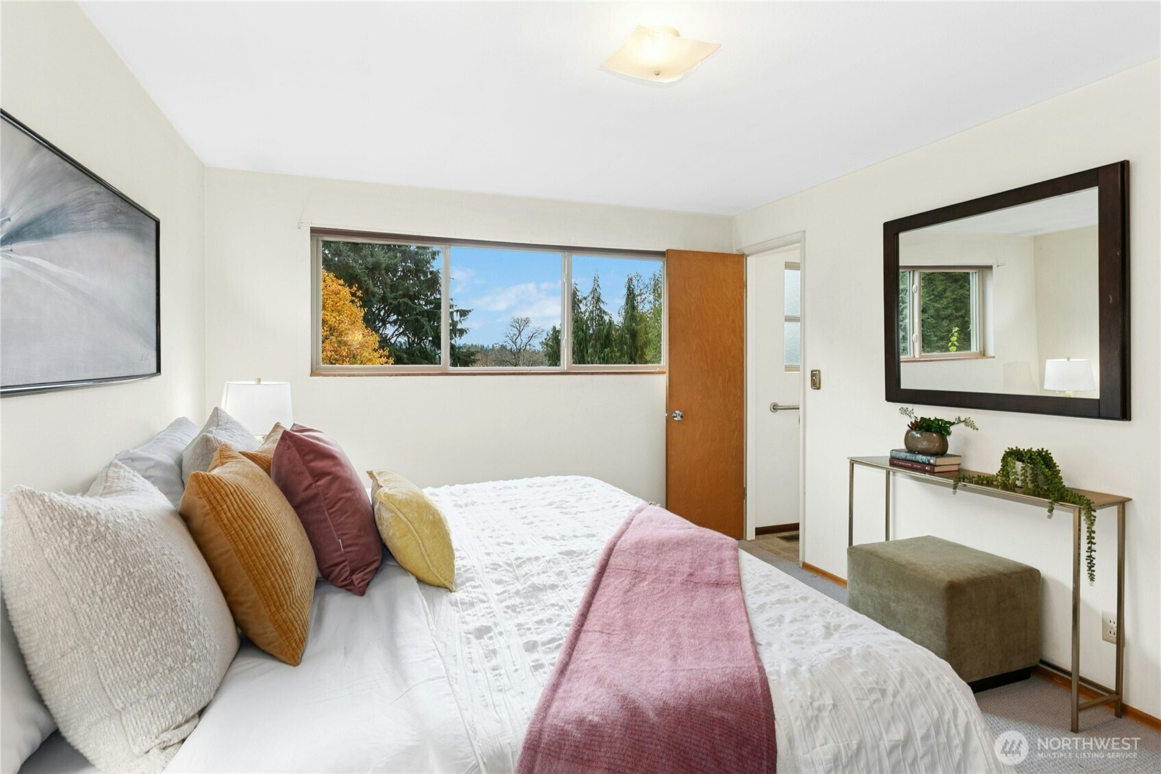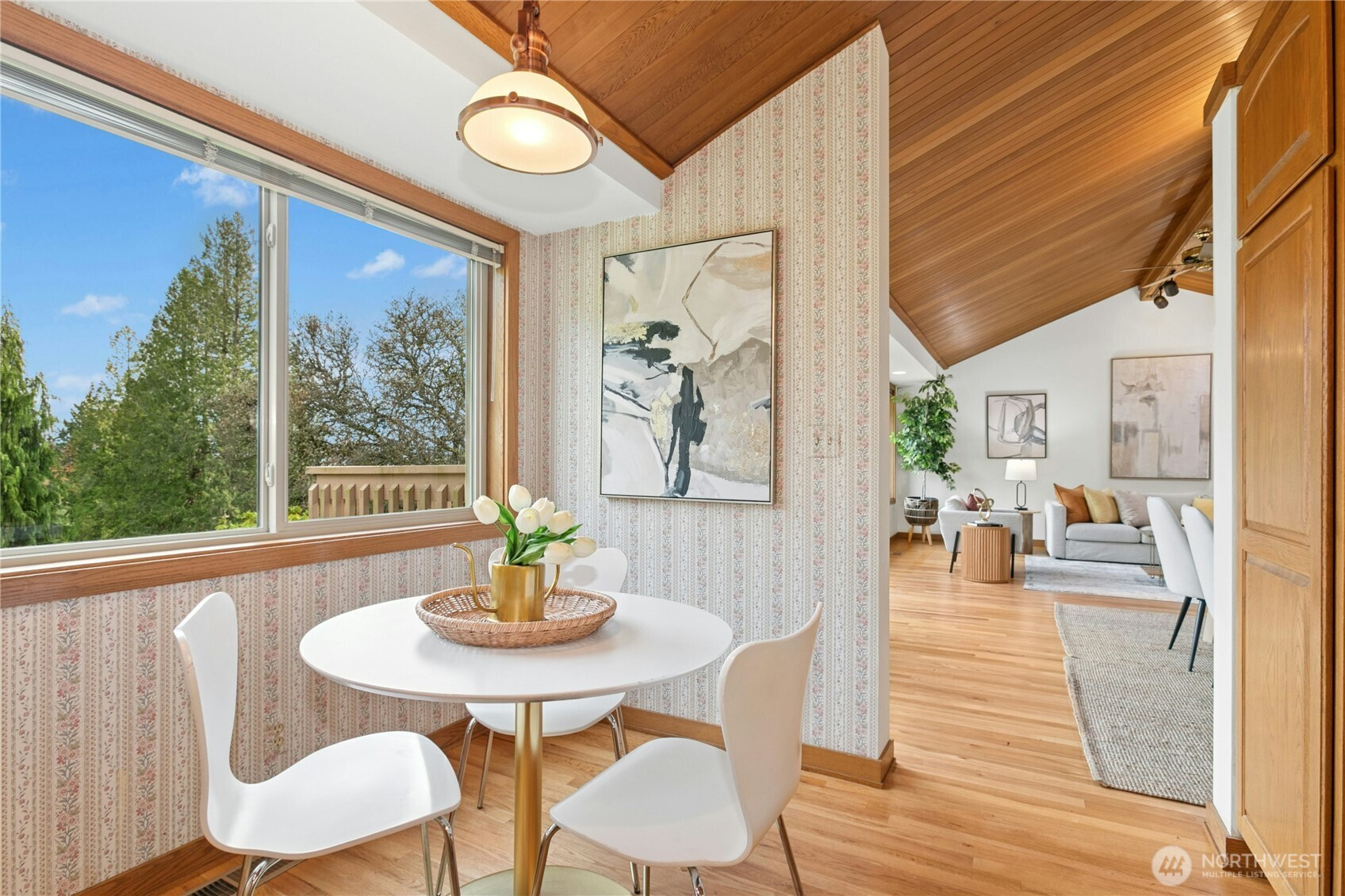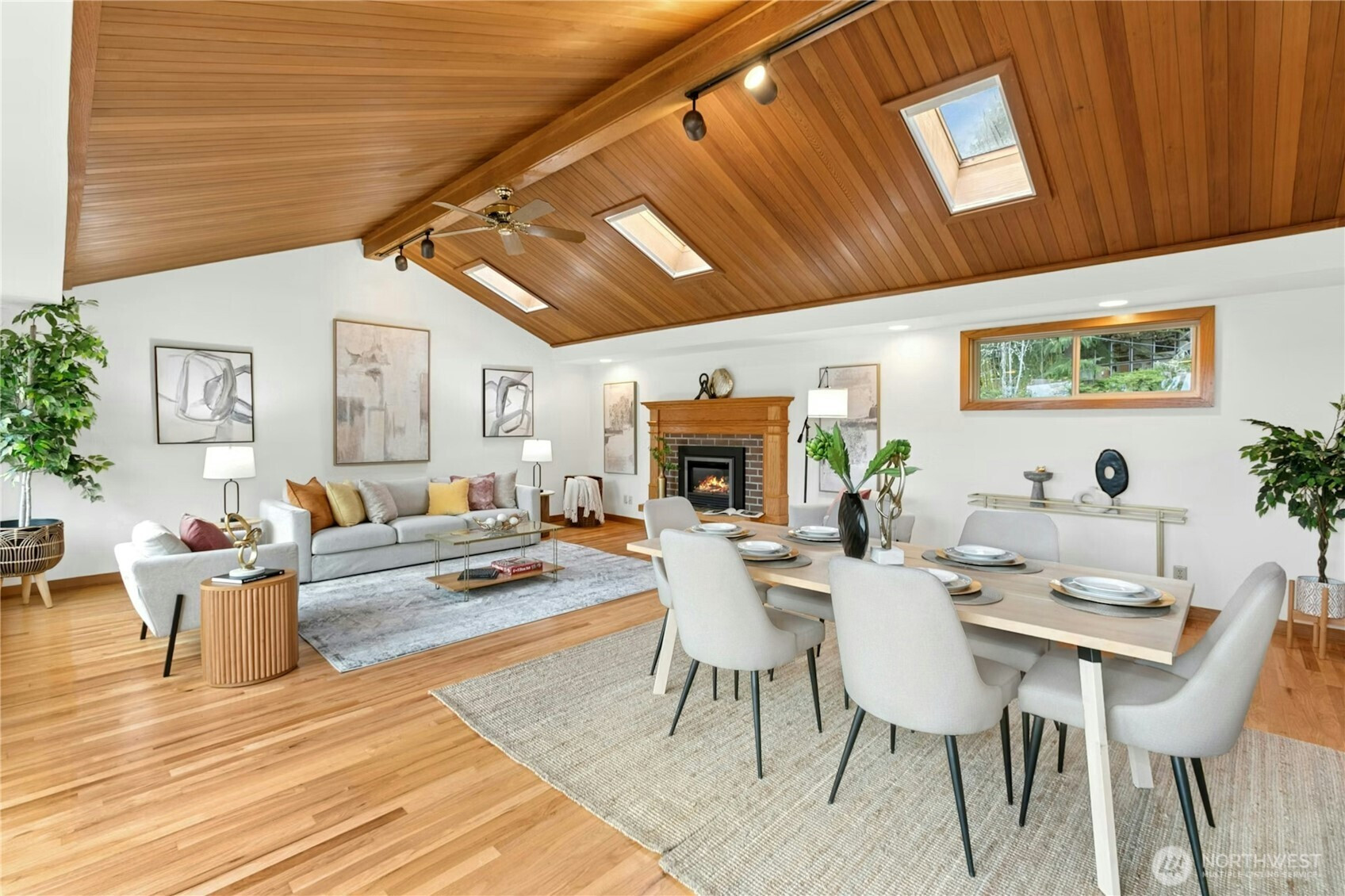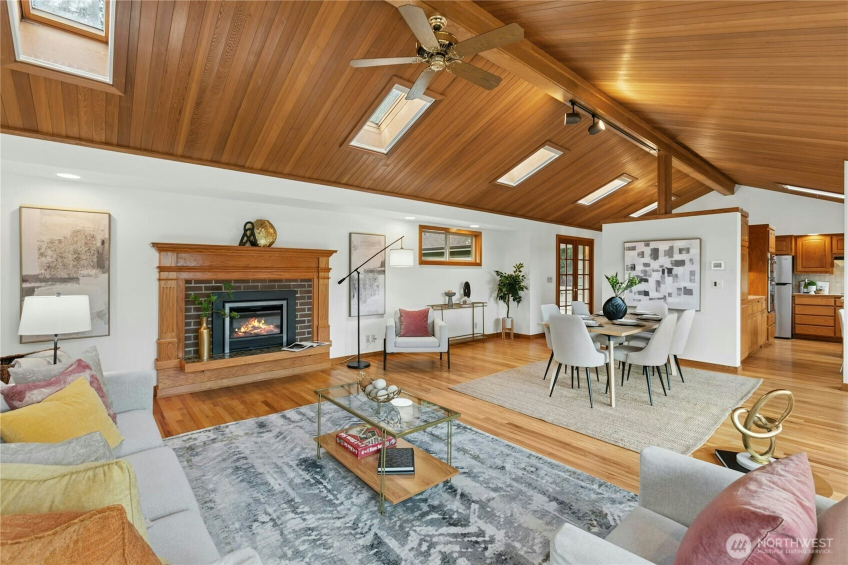 Mid-century character shines in this well-maintained 4BD/2.75BA, 2,170 sq ft home. Updated in 1987 with vaulted ceilings, an expanded kitchen layout, and natural light through skylights. Move-in ready with excellent potential for buyers planning to personalize the kitchen or reimagine the lower level. Enjoy a large entertainment deck overlooking native landscaping, a terraced backyard, and glimpses of mountain views from the yard. The quiet, wooded setting offers privacy and space for gardening and gatherings. Lower level features a separate entry for guests or flexible use. Additional highlights include extensive built-ins, a 10x16 shed, and a sprinkler system, and a security system. 5 min from Town Center, Grace Cole Park. No HOA.