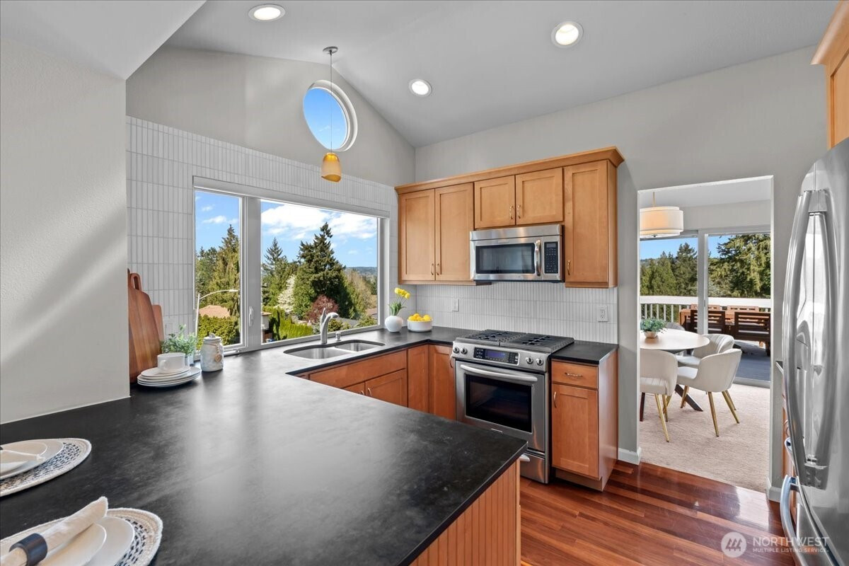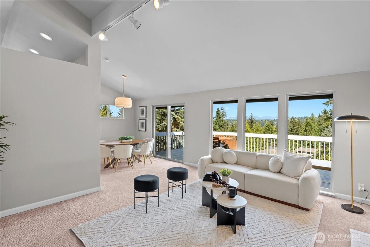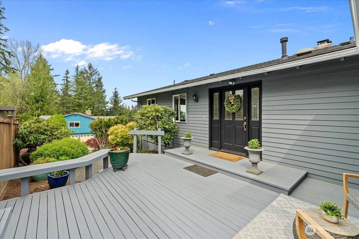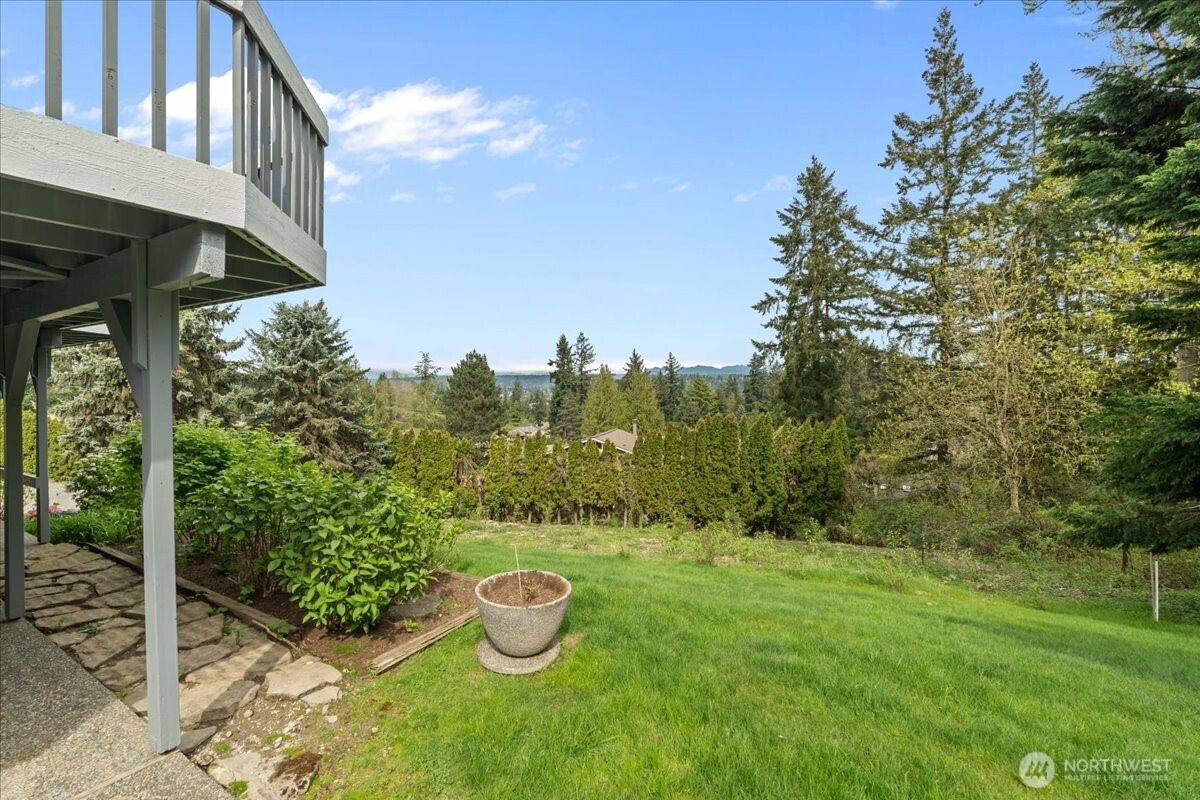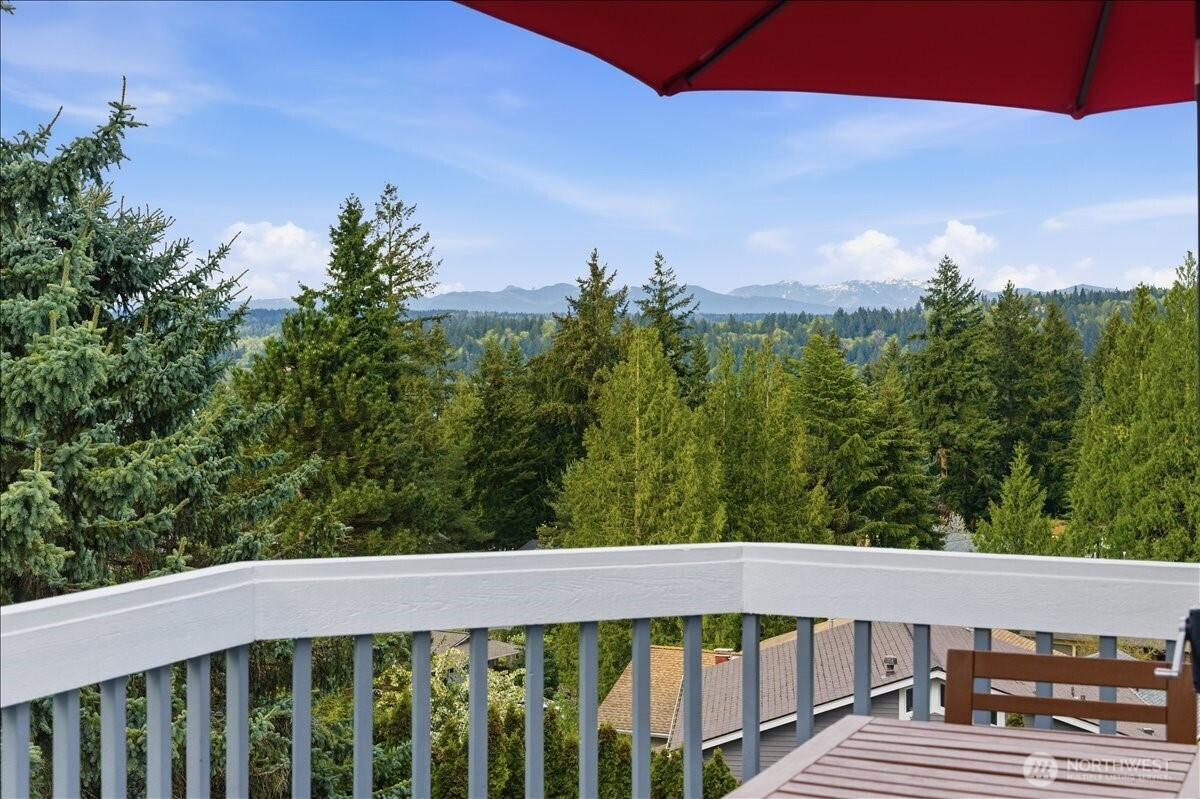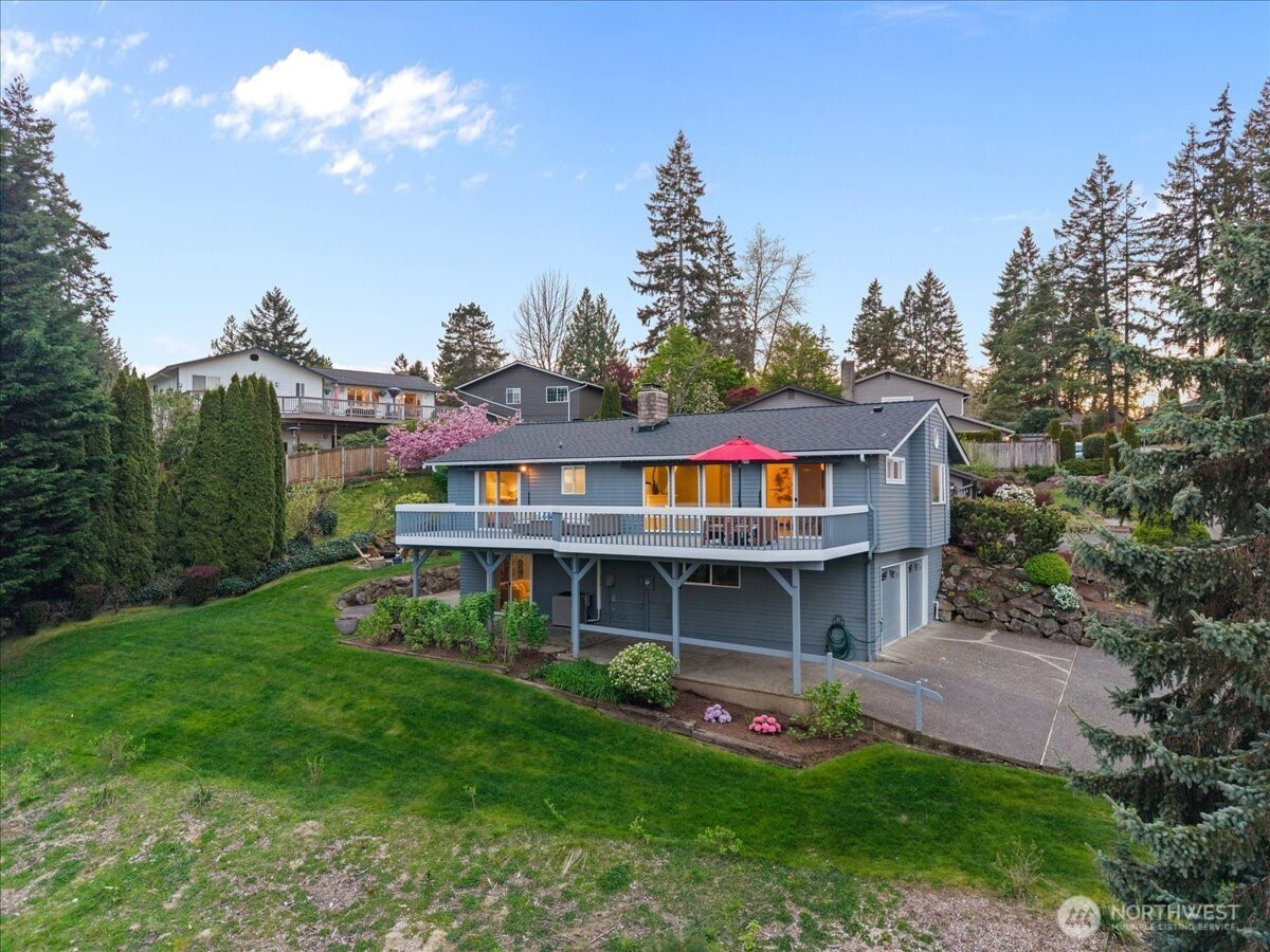 Welcome to this beautifully updated home in a sought-after neighborhood, offering sweeping mountain and territorial views with a partial view of Lake Sammamish. Designed for flexibility and comfort, the main living and dining areas showcase vaulted ceilings and expansive windows, creating a bright and open atmosphere filled with natural light. A spacious east-facing deck extends the living space outdoors, ideal for enjoying the stunning surrounding scenery and watching soaring eagles while relaxing or entertaining. Recent updates enhance both function and style, including a brand new roof (2025), new sewer/water/gas lines, A/C, new interior paint, exterior paint (2020), new lower-level carpet, updated lighting, and removal of popcorn ceilings. Wake up to a beautiful view from the primary suite, complete with a fully remodeled bathroom and two closets. All three remodeled bathrooms excude timeless elegance, custom touches and heated floors. The lower level provides a private, flexible space with a bonus room, large guest bedroom, ¾ bath, 2nd laundry room and level entry access, providing versatile living for short or long term guests. Located adjacent to a city open space for privacy and quiet. Nearby you can explore the 28-acre Ardmore Park with playground and trails or Idylwood Park on Lake Sammamish. Nearby to major Bellevue & Redmond employers, including less than a mile to Microsoft and easy transit options including bus and light rail. Seller pre-inspection available.