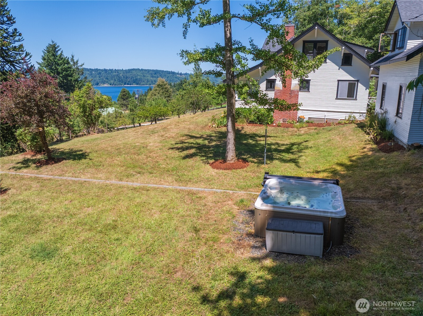 Classic Westside farmhouse with panoramic views of Colvos Passage and stunning Olympic Mountain sunsets. Enjoy views from every floor, the expansive sitting porch, large BBQ deck, or the hot tub. Original millwork and built-ins throughout blend timeless charm and recent renovations bring modern updates. Set on 9+ acres with mature orchard and producing blueberry bushes, apple, pear, & cherry trees, plus heritage grape vines as well as walking trails into the hills. Detached 2-car garage with a 580+ sq ft unfinished studio upstairs—ready for renovation/DADU/art studio. Major 2021–24 upgrades: new roofs, septic, kitchen, both bathrooms, appliances, floors, electrical, plumbing, & more. Wired-in generator and water filtration system included!