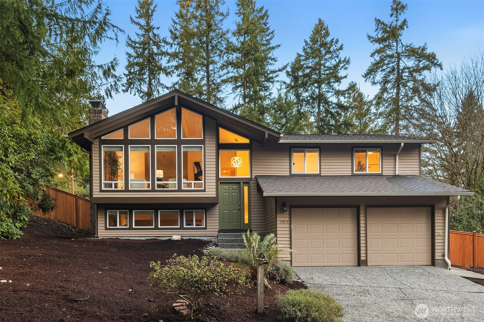 Beautifully remodeled residence on a quiet dead-end street bordering Ardmore Park and the Bellevue Trail System. Nearly every inch of this home has been thoughtfully updated to combine modern comfort with timeless appeal. The stunning living room boasts vaulted ceilings, a wall of windows that floods the space with natural light, and a cozy wood-burning fireplace, seamlessly connects to the spacious dining area and a deck overlooking the fully fenced backyard. The upgraded kitchen features new quartz countertops, ample cabinetry, a built-in breakfast bar, and SS appliances. Upstairs, the primary suite includes a newly remodeled ¾ bath, accompanied by two additional bedrooms and a newly remodeled full hallway bath. The lower level offers a generous family room with a fireplace and sliding door to the outdoors, a 4th bedroom, and a renovated ¾ bath, ideal for guests or multi-generational living. Additional Recent upgrades include: new roof, gutters, and gutter covers, new gas furnace, new LVP flooring, new carpet in upstairs bedrooms, new double-pane windows and sliding doors, new window blinds, fresh interior and exterior paint, new fencing, new interior and closet doors with locks, updated light fixtures, new electric switches and outlets, and a new hot water tank (2024). Award-winning Bellevue School District. Just minutes to Microsoft, downtown Bellevue, and Redmond, with nearby trails and parks right outside your door.