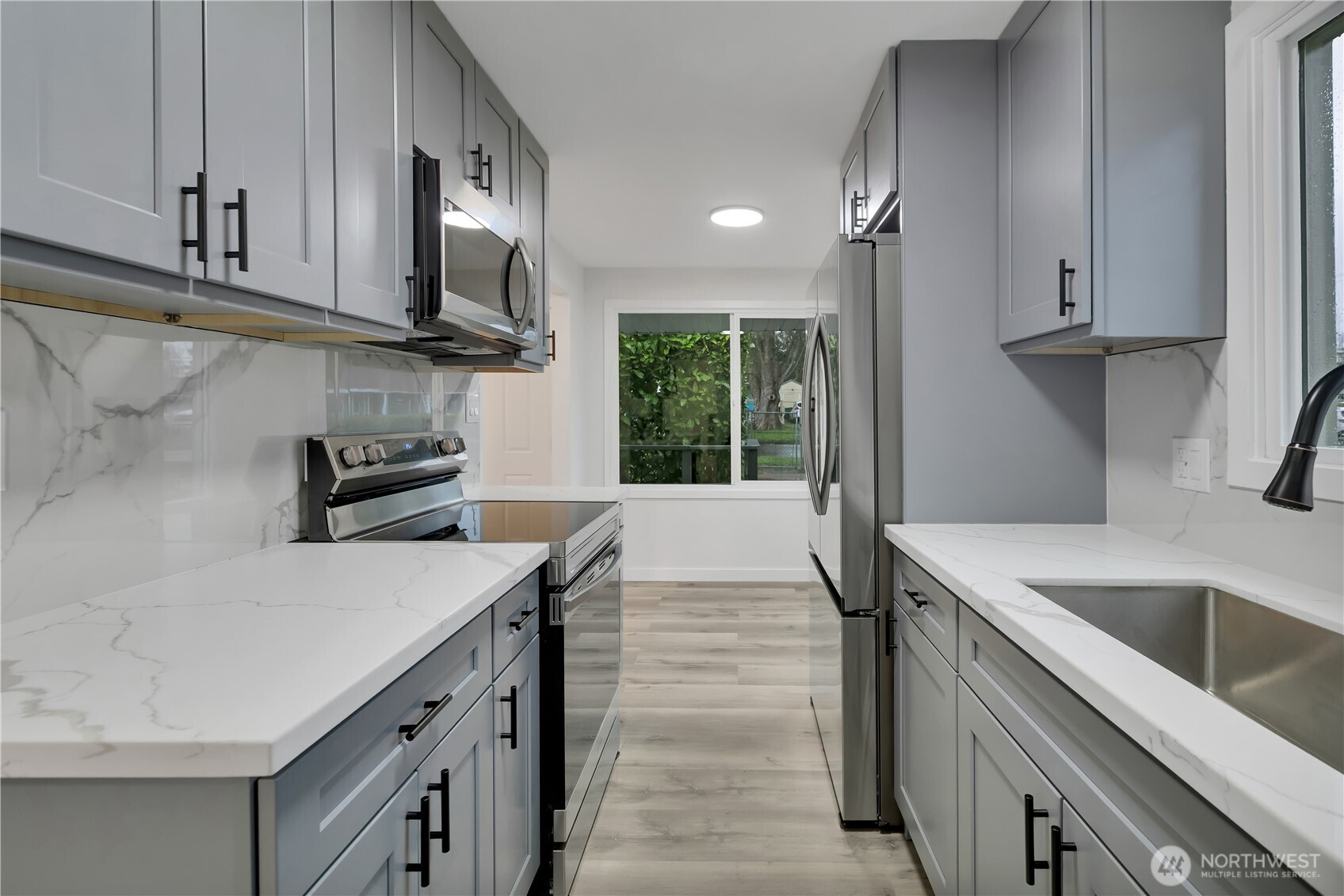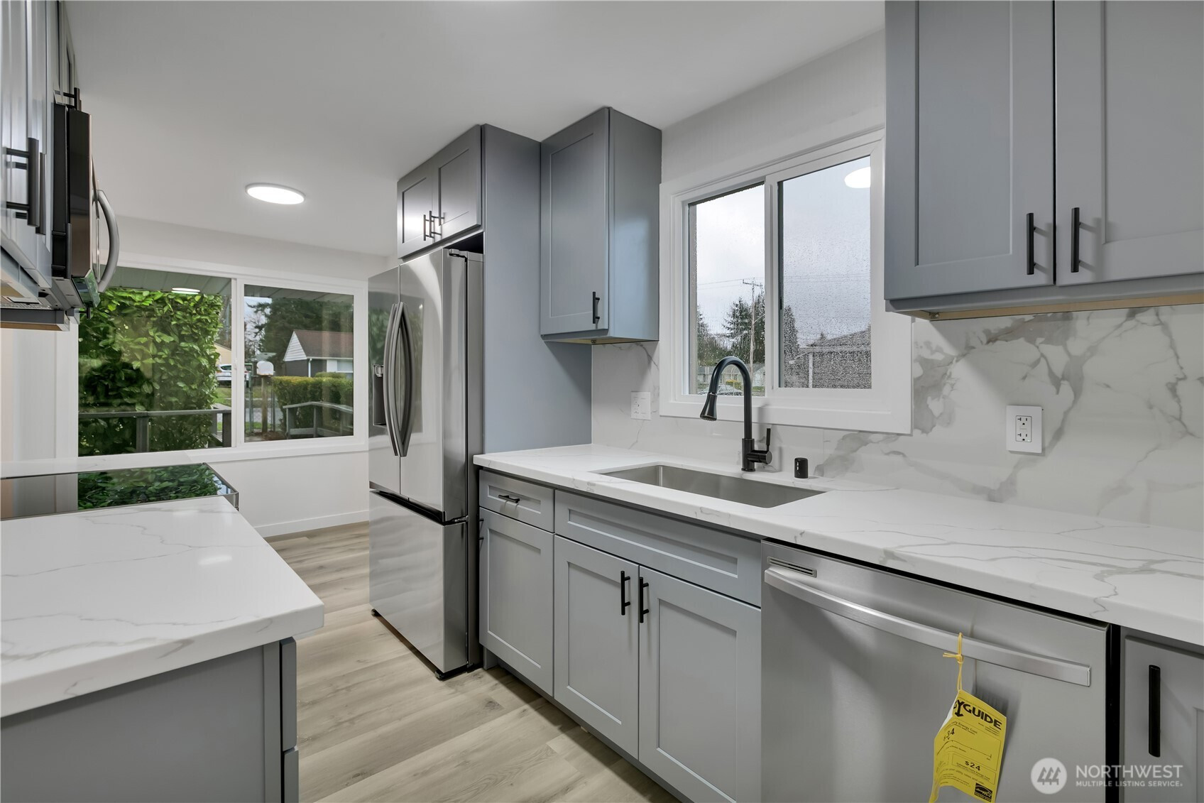 Beautifully Updated 3-Bed home with ADU potential! Step inside this fully refreshed home featuring new luxury vinyl flooring, designer tile work in the bathrooms, and a gorgeous new kitchen with custom cabinetry, quartz countertops, and stainless-steel appliances. The spacious, partially finished basement offers great ceiling height and is already roughed-in—perfect for adding your personal touch or creating an ADU/mother-in-law suite with its own separate entrance. Also, potential for a DADU. Enjoy a private, fully fenced backyard and a detached garage ideal for parking or additional storage. New electrical panel. Conveniently located near freeways, shopping, restaurants, and excellent schools—this home offers both comfort and opportunity!