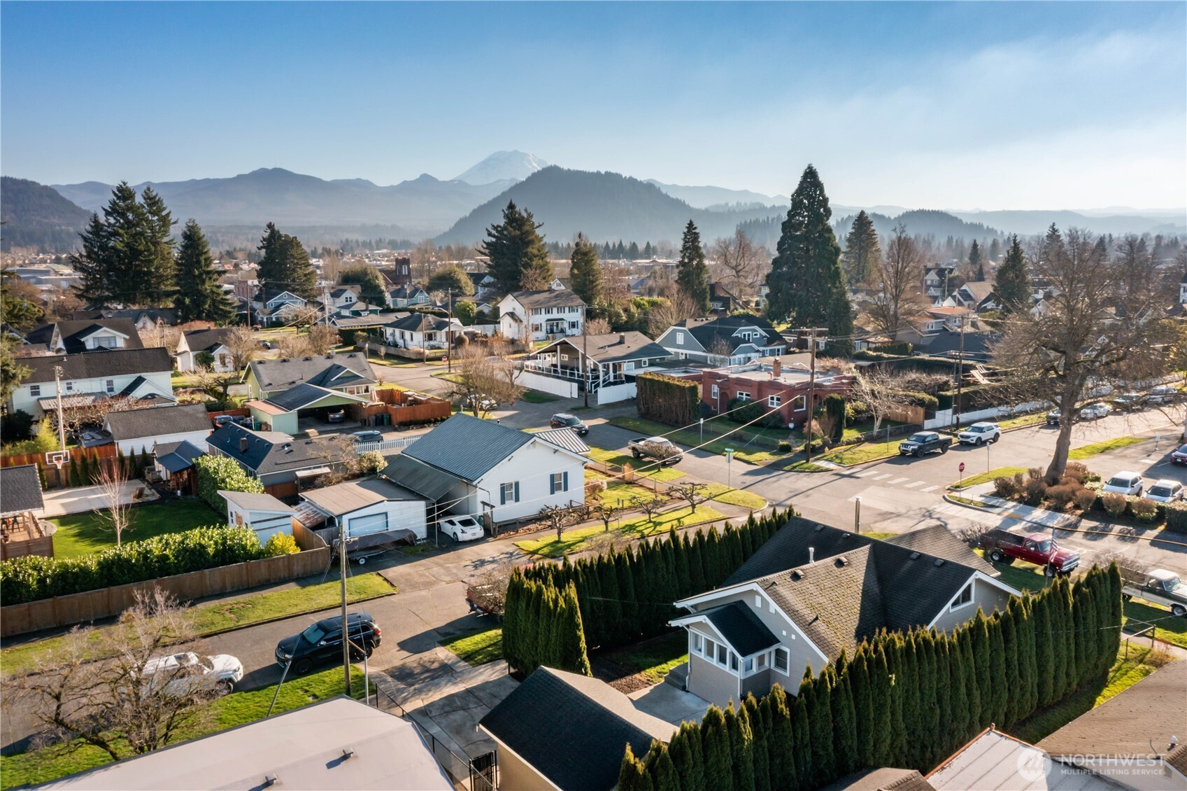 Charming 1920s Craftsman on a fully fenced corner lot, offering timeless character and modern versatility. This three-bedroom, two-bath home features a bonus room upstairs, perfect for guests, office, or creative space. The fully finished basement includes a utility room and a flexible entry area ideal for a workshop, additional storage, or extra refrigeration/freezers. Mature trees surround the property, creating exceptional privacy, especially from the outdoor patio. A single-car garage adds convenience. Enjoy walkable access to town, shops, and everyday amenities, along with a peekaboo view of Mount Rainier from the classic covered front porch. A rare blend of privacy, location, and Craftsman charm.