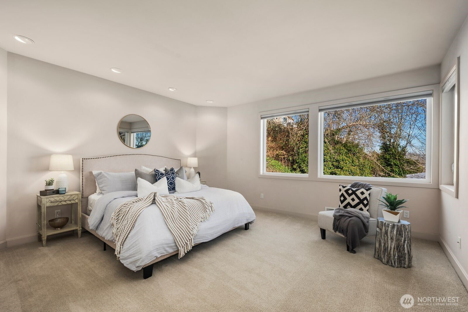 Stunning 3,337 SF modern Art Deco home with 4 bedrooms and 2.5 baths, showcasing sweeping views of downtown Seattle, Puget Sound, and the Cascade Mountains. Light-filled living spaces feature floor-to-ceiling windows, new Milgard windows, custom blinds, fresh interior paint throughout, and gas fireplaces. Thoughtful upgrades include new A/C, electrical panel, water heater, Sub-Zero refrigerator, kitchen backsplash, fiber-optic internet, rooftop safety railing, and many more. Enjoy multiple private decks, a relaxing rooftop deck view, two-car garage, and a luxurious five-piece primary suite. Unbeatable location just around the corner from Alki Beach and the water taxi to downtown Seattle. A rare blend of design, views, and lifestyle!