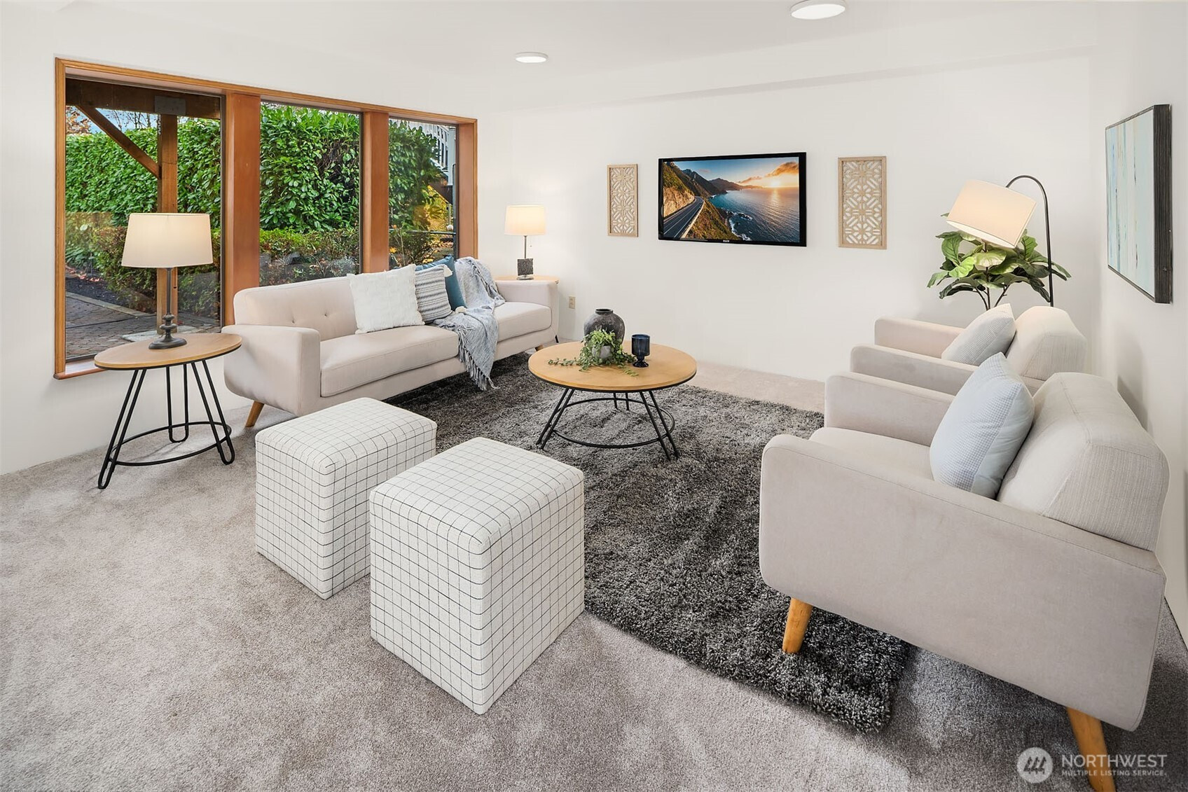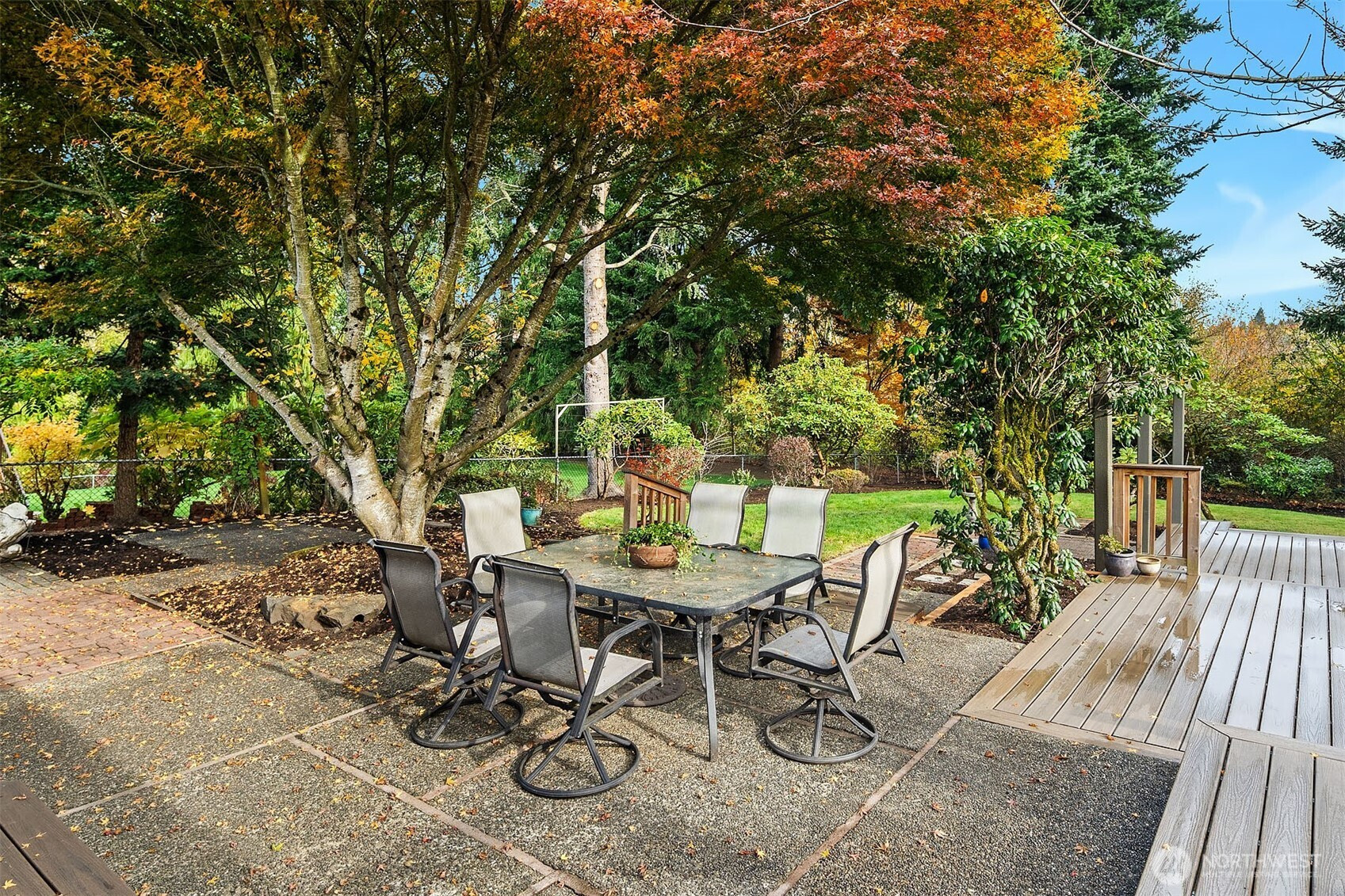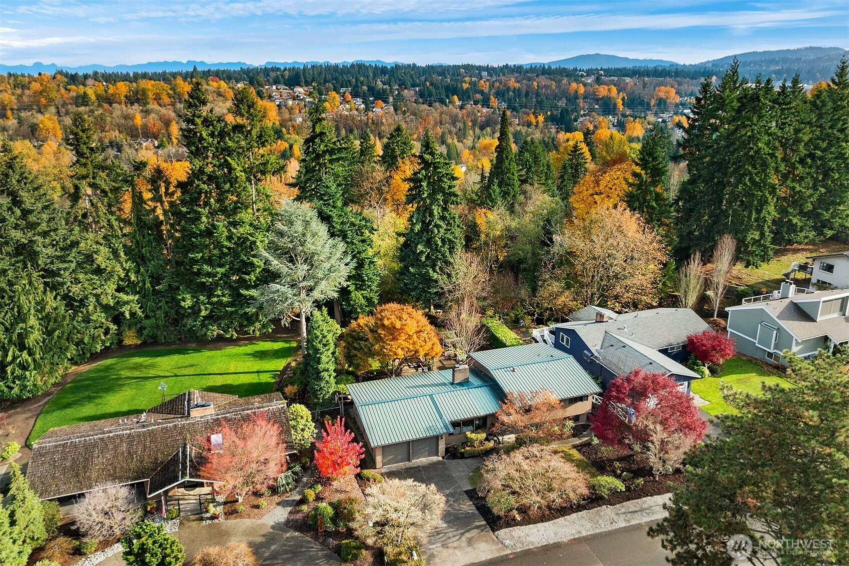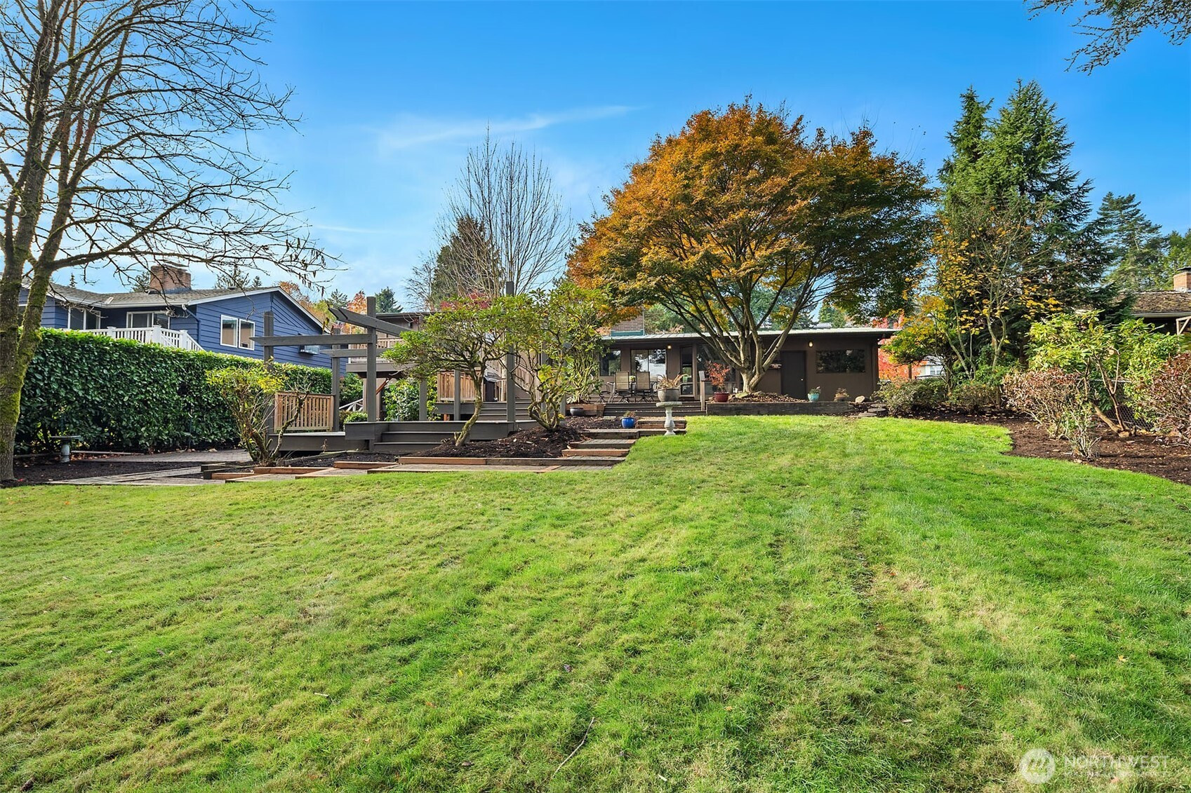 This classic Pacific Northwest home, set on a quiet street in Bellevue’s cherished Woodridge neighborhood, welcomes you with slate tile and vaulted ceilings. An exposed beam, wood accents, and a floor-to-ceiling stone gas fireplace warm the living room. Enjoy views of the incredible backyard with established shrubs, paver patios, all-weather decks, garden beds, and a trellis from the kitchen and dining room. The primary suite is clad in hardwoods with French doors to the upper deck. The lower level has a spacious family room. Recent updates include fresh paint inside and out, new LVP flooring, and carpet. The home backs to Woodridge Open Space. Woodridge Elementary is nearby. Located just moments to downtown Bellevue or Factoria.
