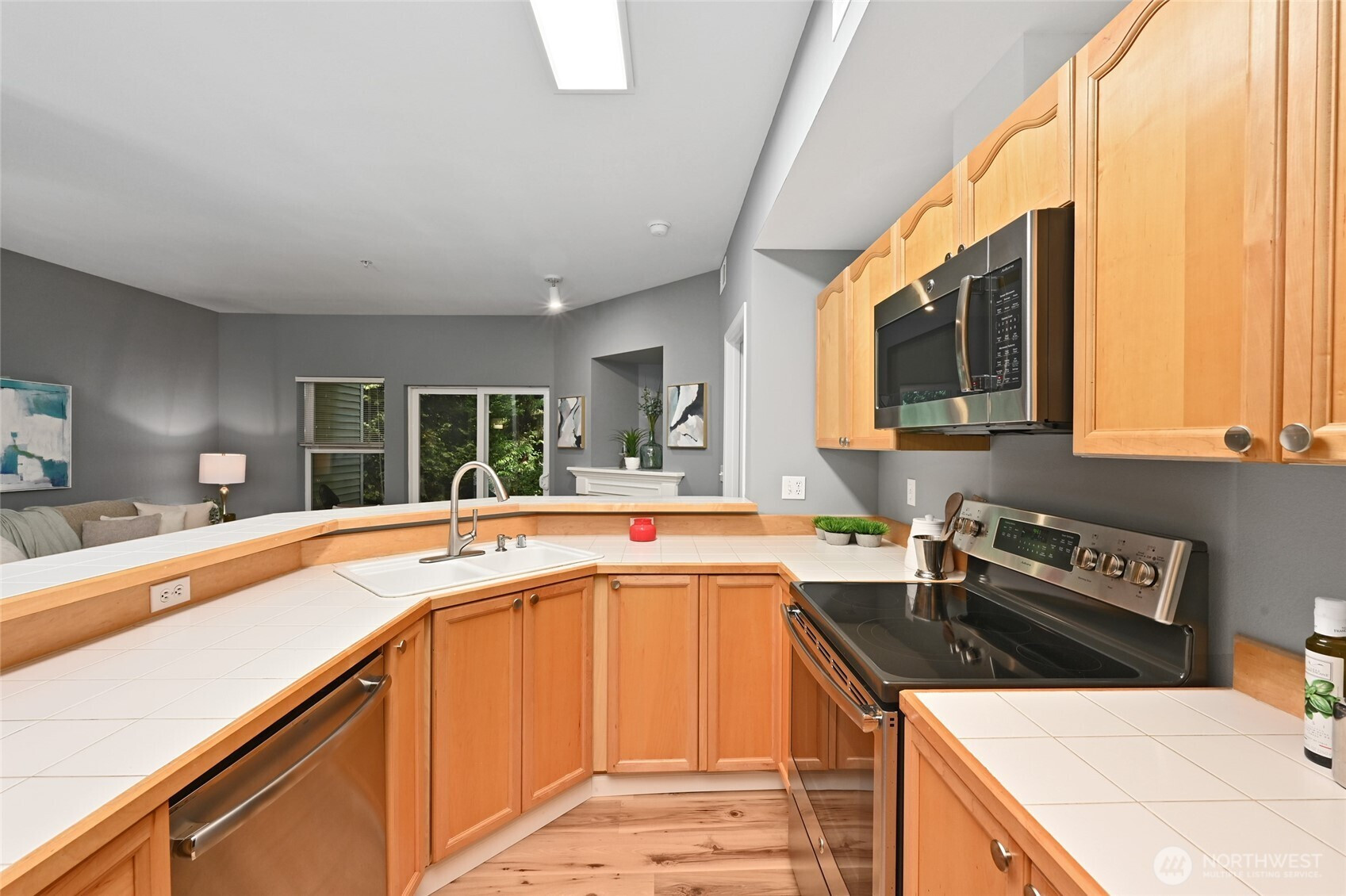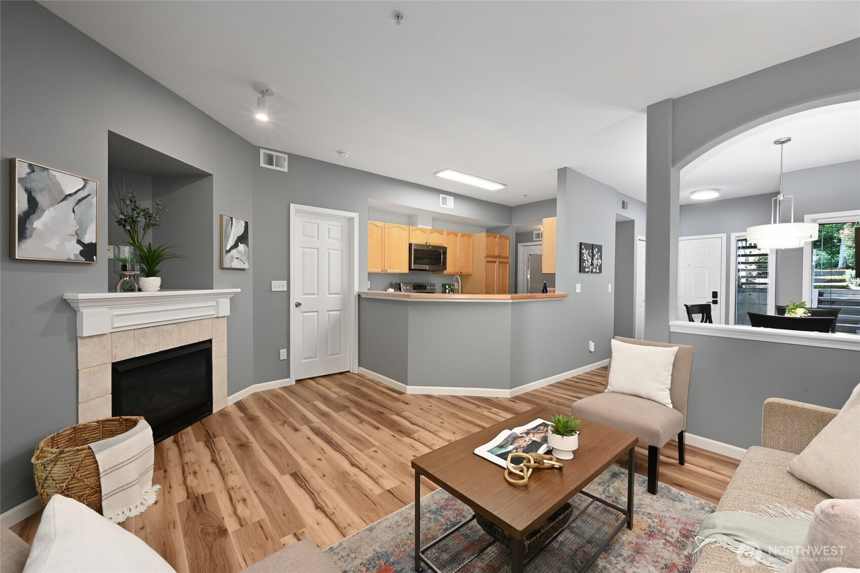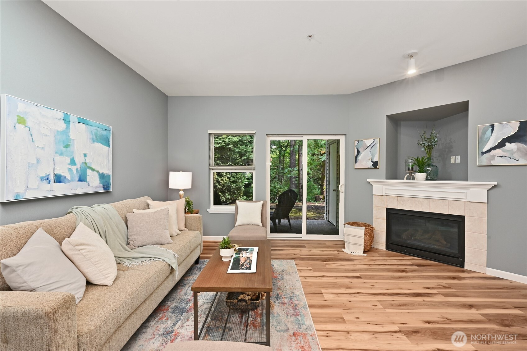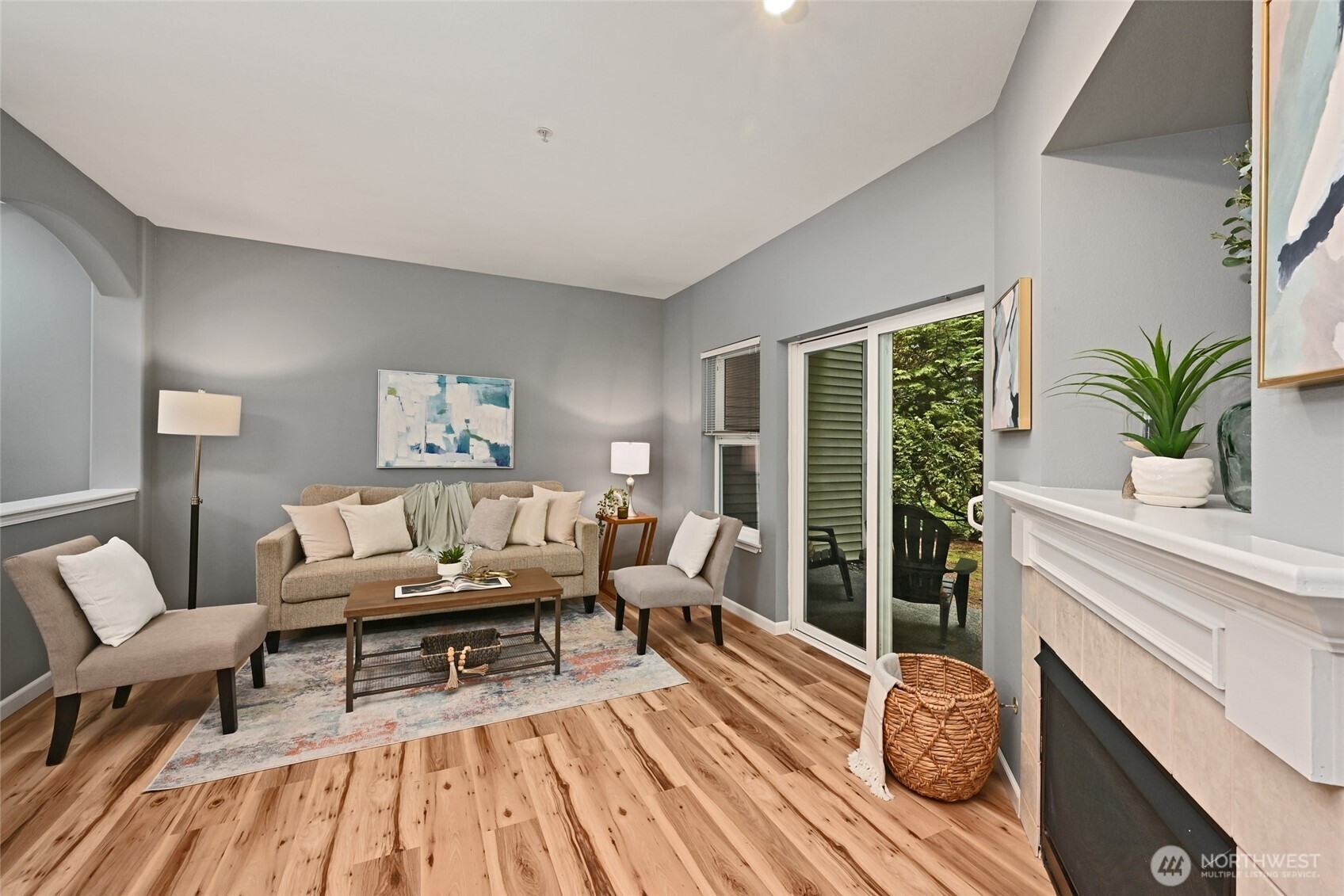 Wonderfully updated, 2 bed/1.75 bath, ground floor condo in desirable Woodinview. New floors, paint, 9 Ft ceilings, Maple kitchen cabinets, ample counter space with eating bar. Adjoining dining and living room with gas fireplace. Primary suite with large Walk-in closet, 3/4 bath. Includes all appliances, plus washer and dryer. Enjoy your next barbeque on the peaceful patio facing the greenbelt. Private garage, play area, sports court and Northshore School District. Great location near downtown Woodinville, Bothell, Totem Lake, wineries, Burke-Gilman and Sammamish River Trails. Easy access to highways and transit. Come make this gem your own!