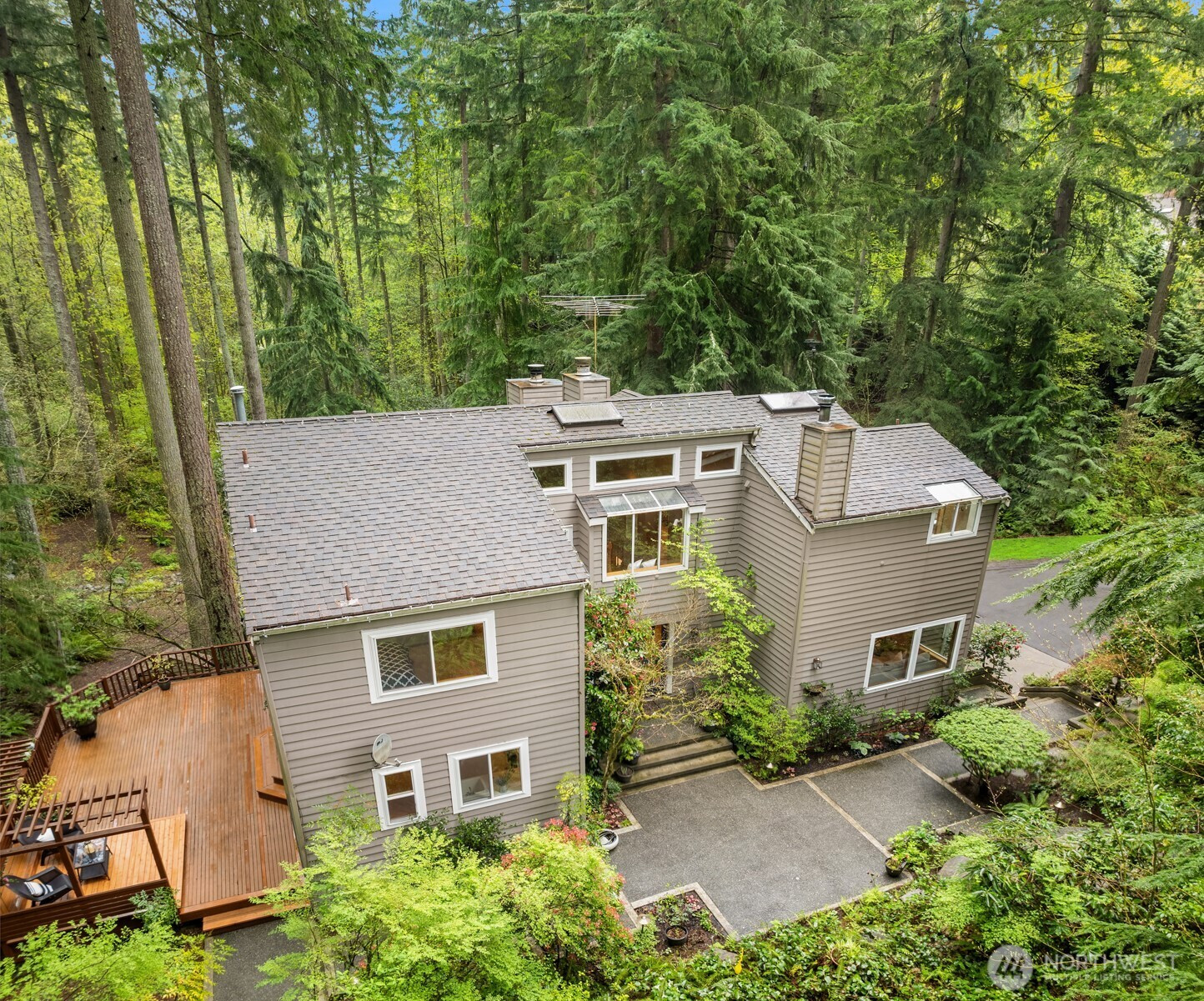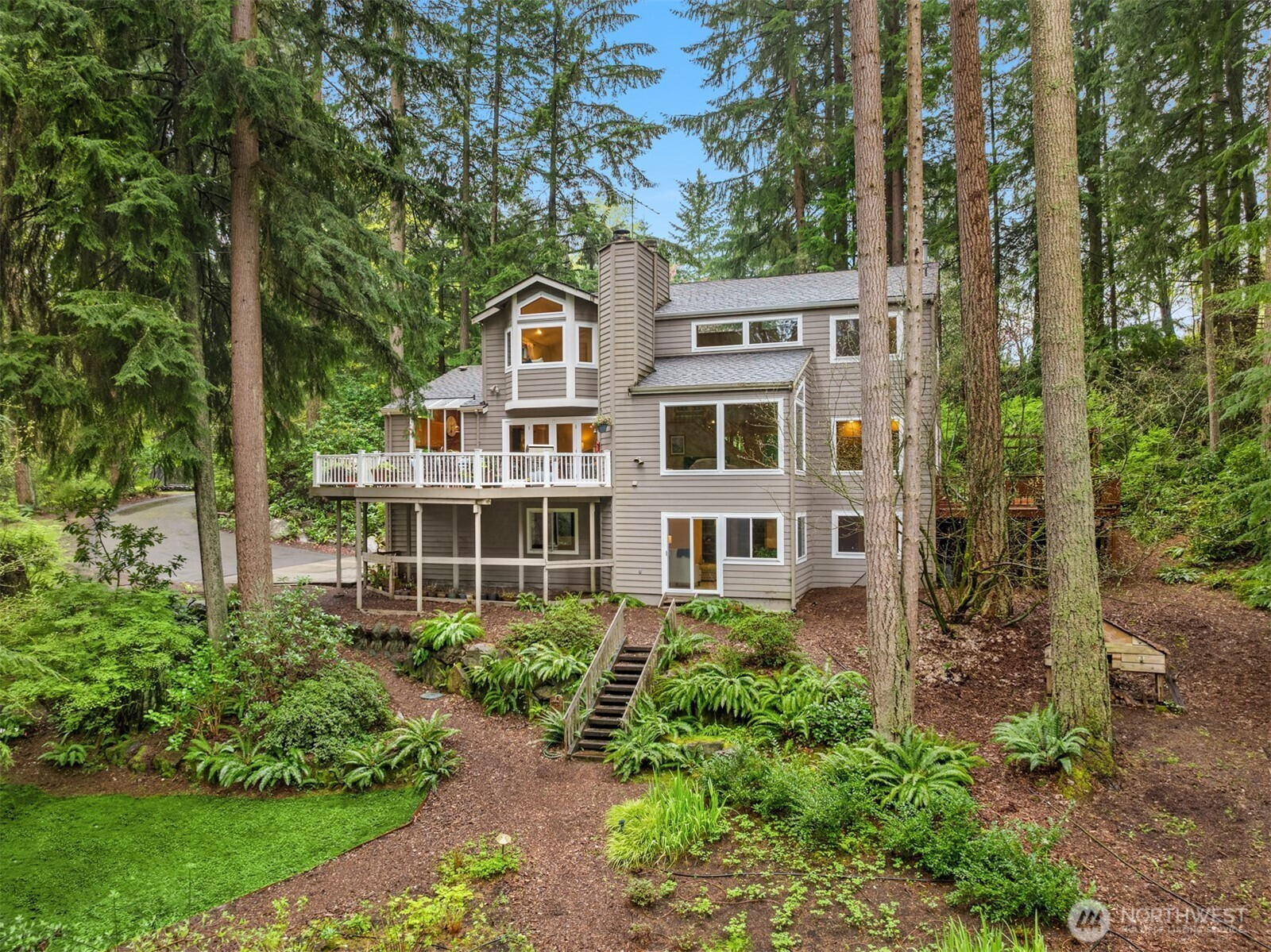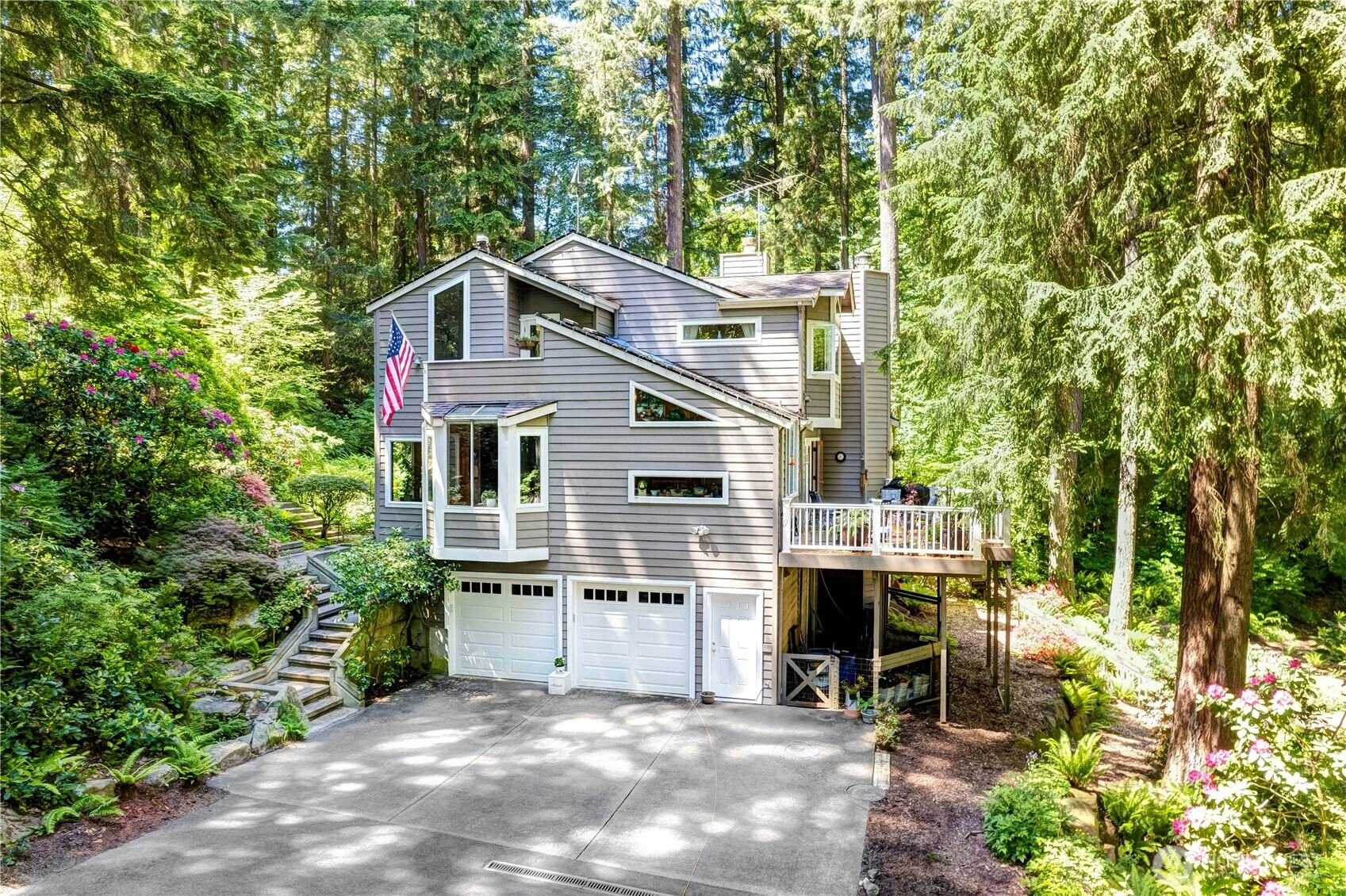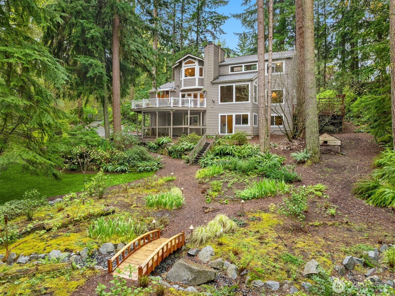 Architecturally striking Woodinville acreage home. Nestled on a quiet dead end lane in one of the most desirable locations in all of the Hollywood Hill community, this captivating NW contemporary style residence is now available for the first time ever on the open market. Lovingly maintained by original owners, this custom residence offers soaring ceilings, exposed beams & walls of glass overlooking lush garden areas & peaceful woodlands. The sundrenched interior offers open concept gathering spaces with formal living & dining areas, executive office, chef’s kitchen with breakfast nook & adjacent family room. The spacious upper level boasts the convenience of 3 BRs & 2 BAs including a sumptuous primary suite with cozy fireplace, private veranda & luxurious 5-piece bath. The expansive daylight basement provides the perfect setting for guests with additional BR, full bath, huge bonus room, unfinished storage space & oversized 2 car garage w/workshop. This 5 acre estate style property provides exceptional privacy & incredible outdoors spaces including multiple entertainment decks, sports court for pickleball or basketball, greenhouse, professionally designed landscaping & storybook garden areas with mature plantings. Coveted location in the award-winning Northshore School District, directly adjacent to the Pipeline Trail for miles of recreational opportunities, just mins from Woodinville Wine Country, Sammamish Bike Trail, popular concerts & vibrant shopping/dining experiences.