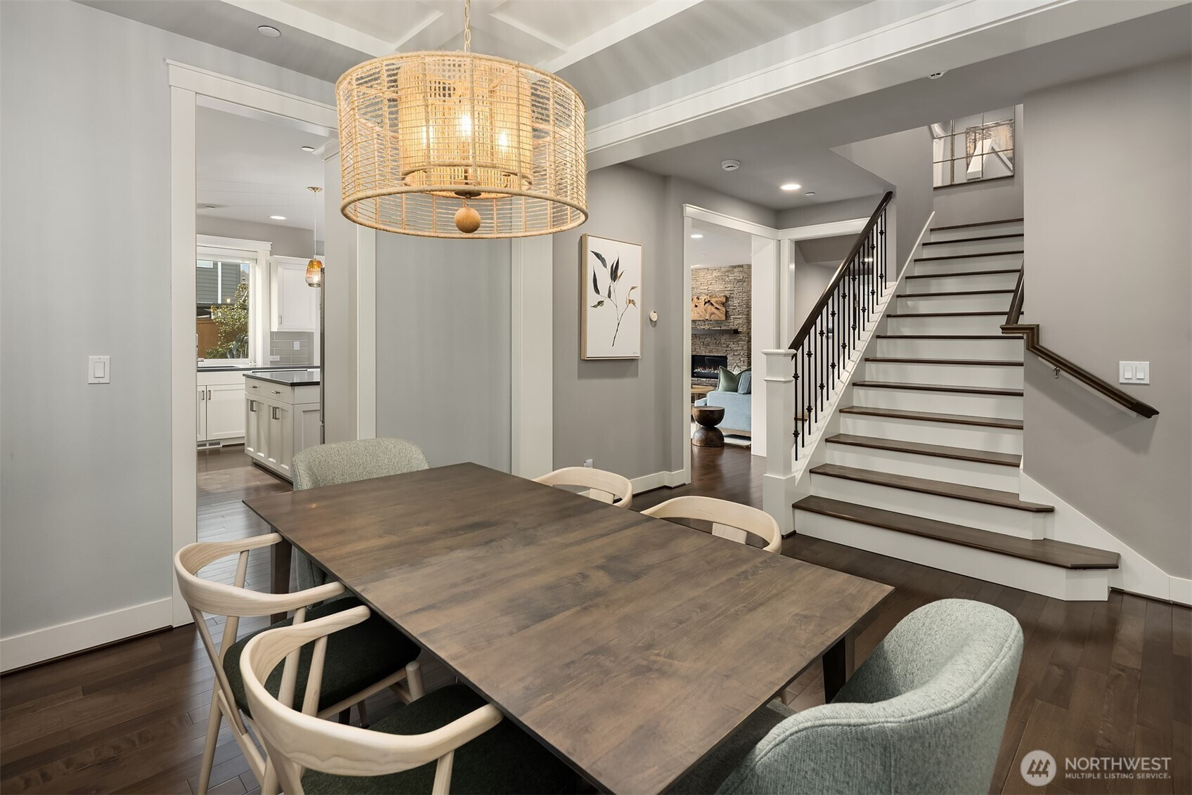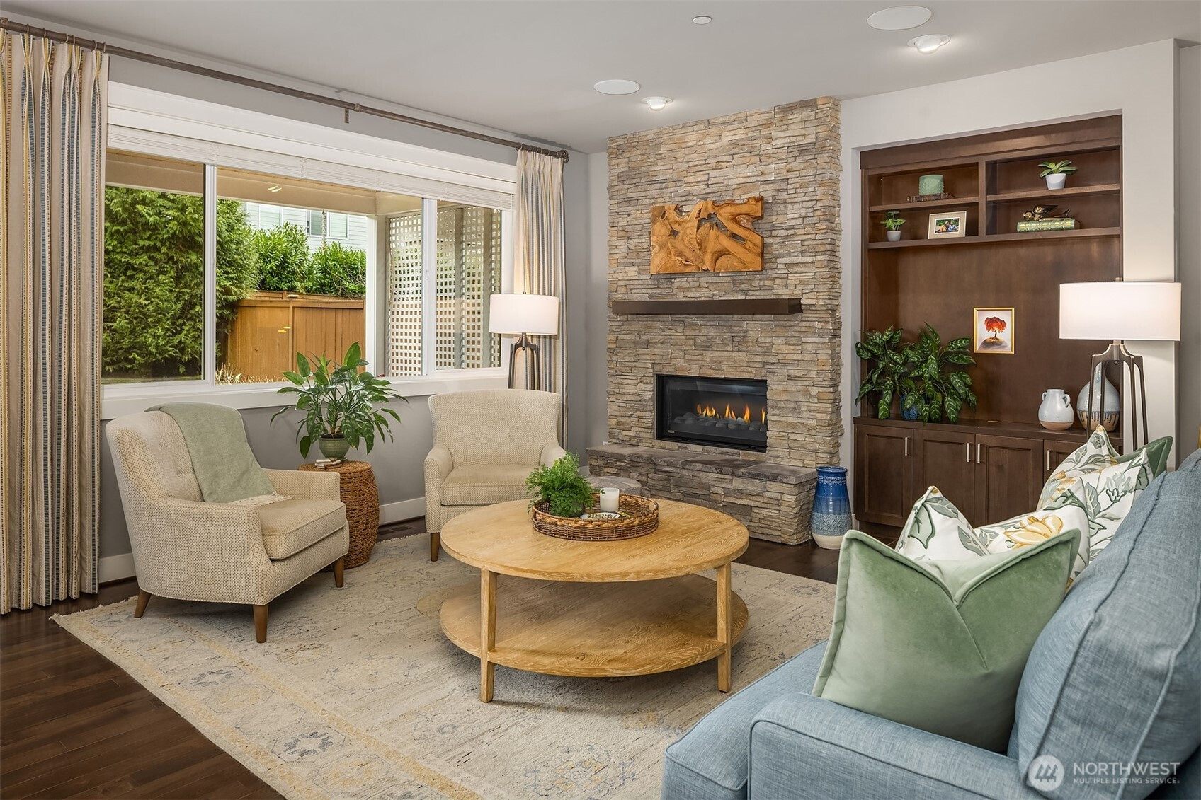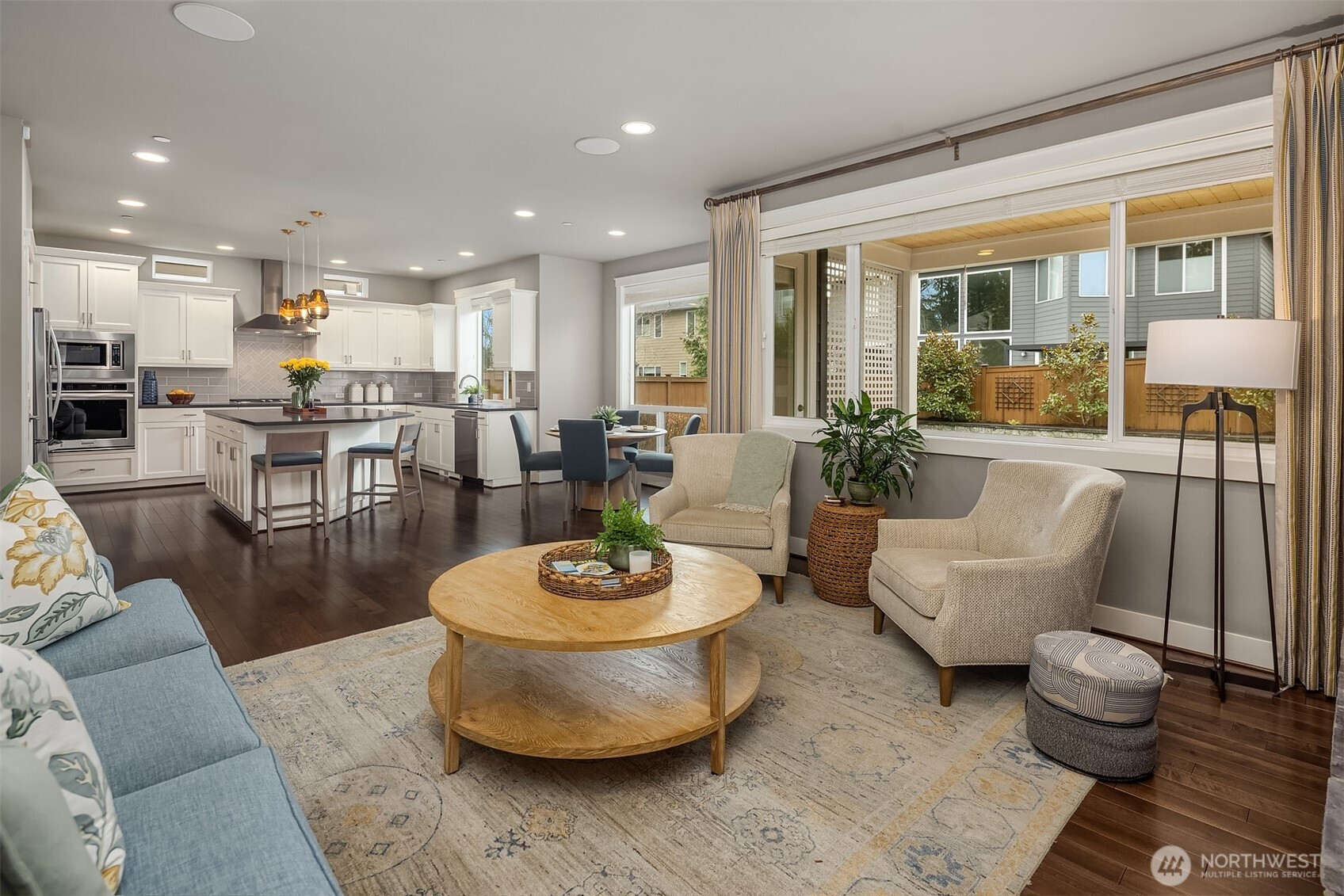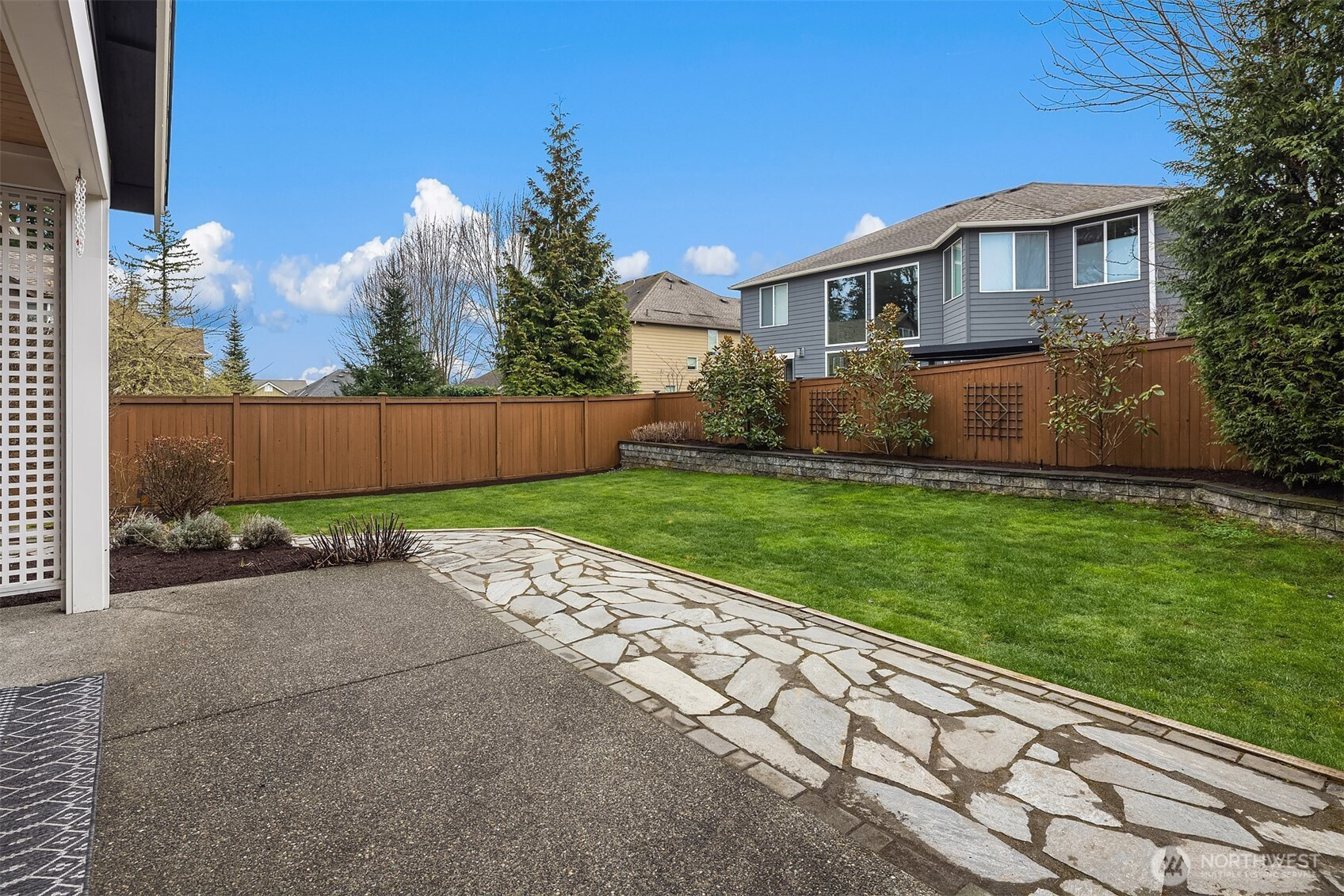 Welcome home to this impeccable Rick Burnstead residence, filled with natural light throughout and equipped with central air conditioning for year round comfort. The large south-facing backyard is beautifully landscaped and features a covered patio and elegant stone pathway—perfect for relaxing, entertaining, or play. The warm and inviting great room flows seamlessly into the kitchen, showcasing a large center island, white cabinetry, quartz countertops, and stainless-steel appliances. A main-floor den/office with a closet offers an ideal work-from-home space or potential fifth bedroom. Beautiful hardwood flooring runs throughout the home, including solid maple floors on the upper level that were added just a few years ago. The spacious primary suite features a spa-like ensuite and a generous walk-in closet with custom California Closets built-ins. A large bonus room is ready for movie nights or game days, while three additional bedrooms provide ample closet space. The garage includes durable epoxy flooring and large, sturdy storage racks. The community offers a neighborhood play park and scenic trails, all conveniently located just minutes from Clara Barton Elementary School and major Eastside employers.