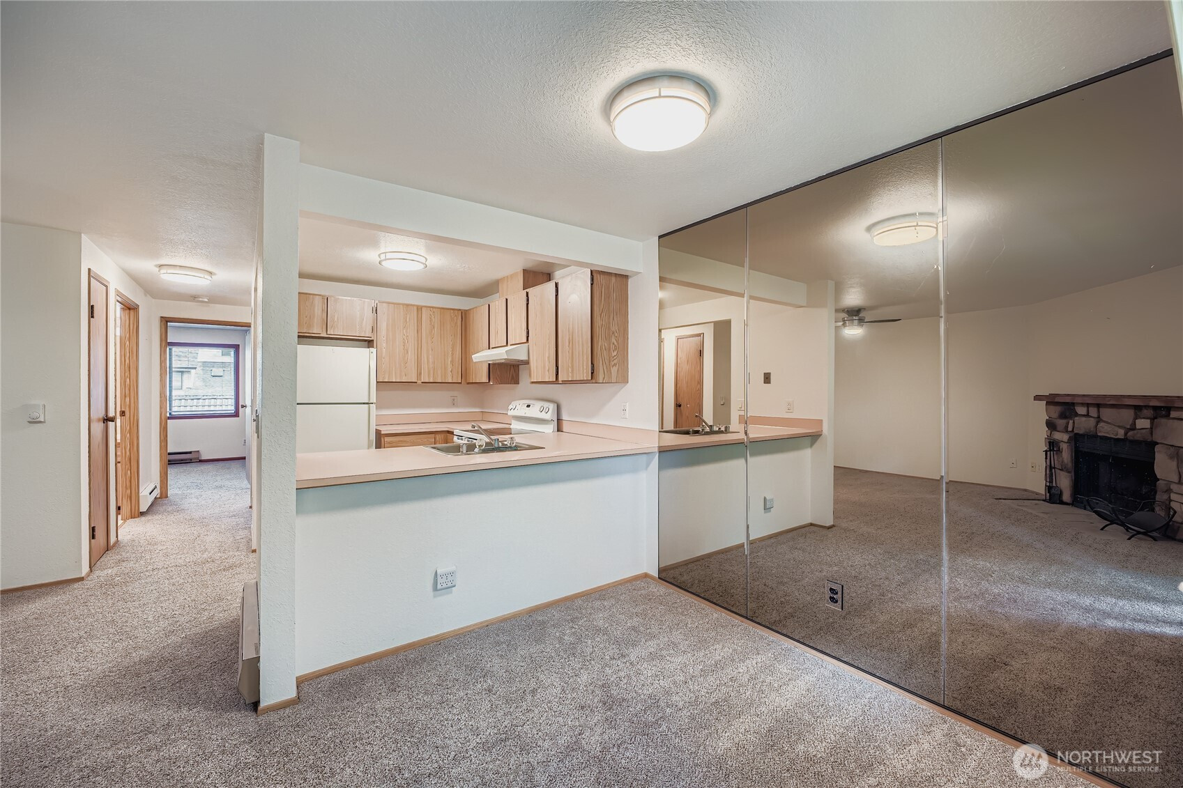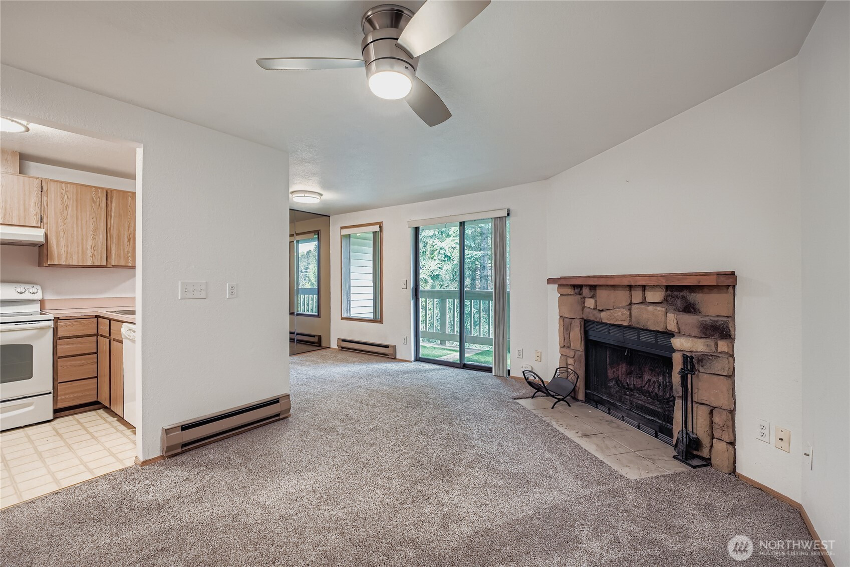Exceptional value and prime location converge in this spacious, top-floor condo! Enjoy the peace that comes with no neighbors above you & a view of trees out your patio. Highly functional layout & a warm wood-burning fireplace. While move-in ready, this is a rare opportunity to purchase at an accessible price point and customize the interior to your exact taste and style, allowing you to build immediate equity. The condo includes 1 assigned carport parking space and ample guest parking. Pet friendly & perfectly located- you're just minutes from transit, I-405, 167, and Sea-Tac. Below the rental cap, this condo offers great potential for both homeowners and savvy investors seeking an unbeatable entry point! Welcome home.