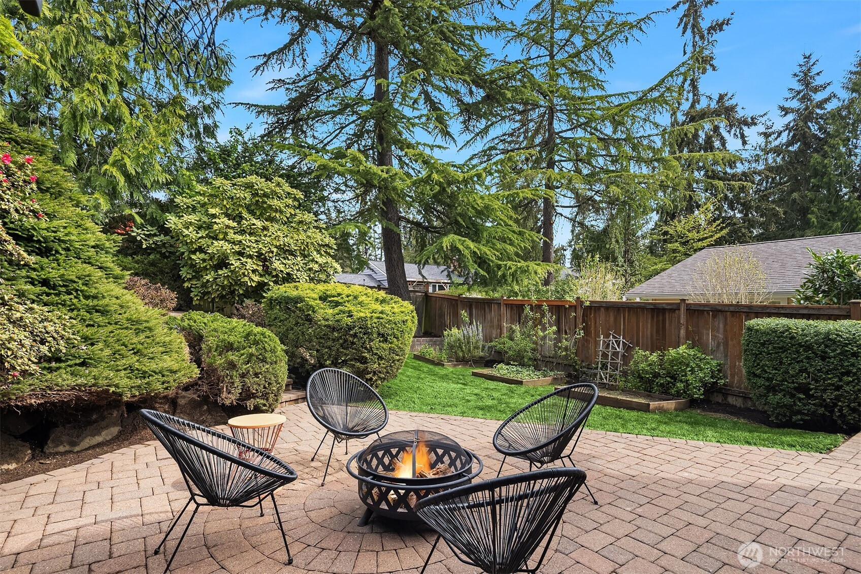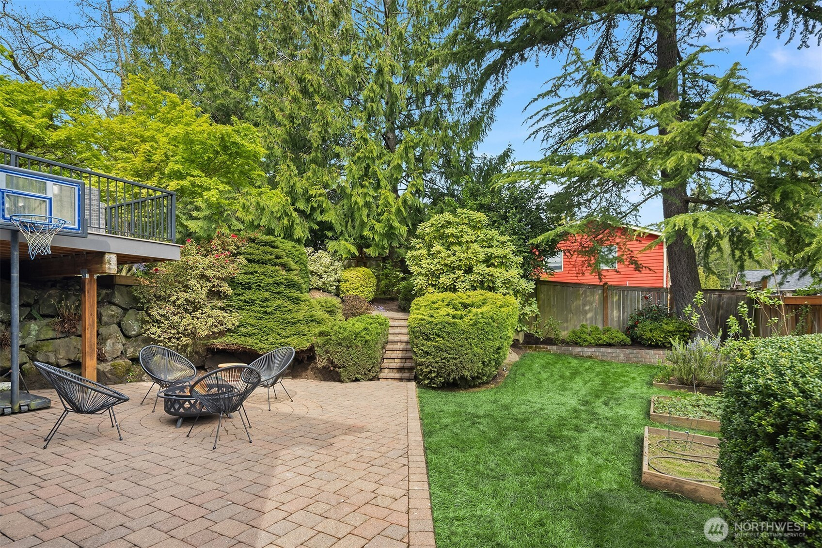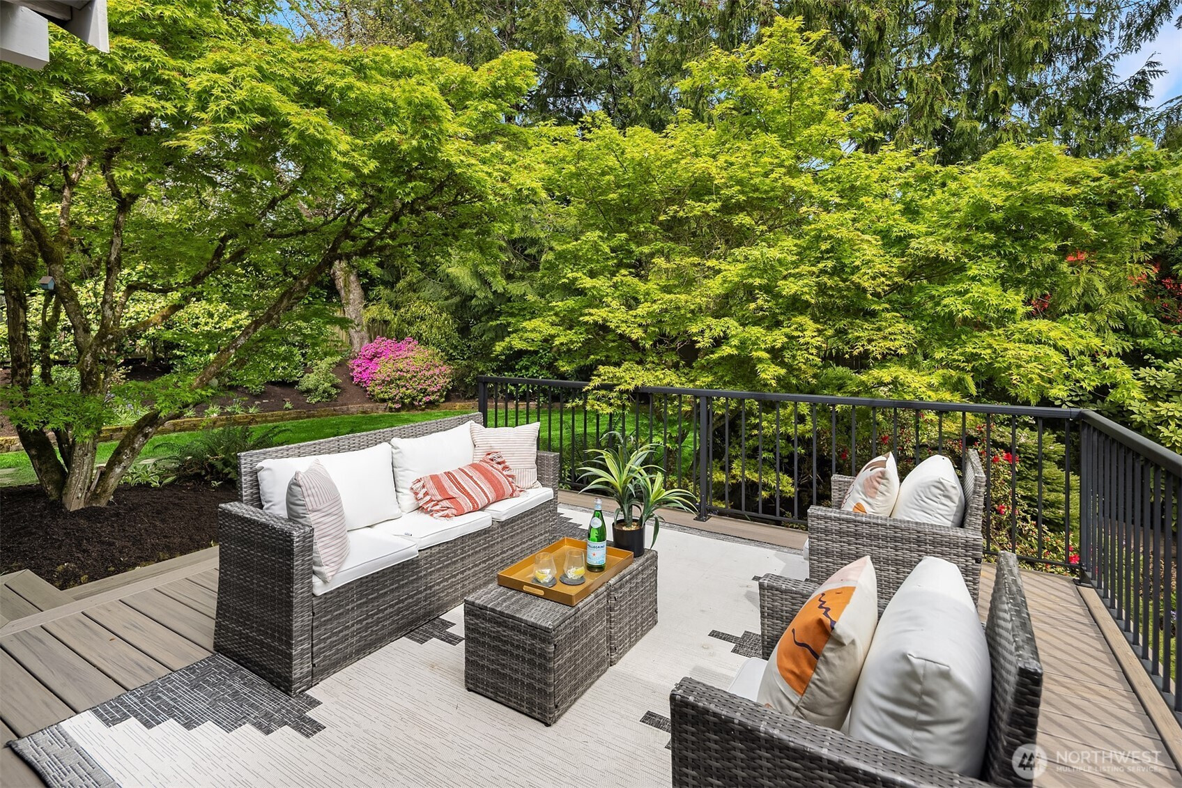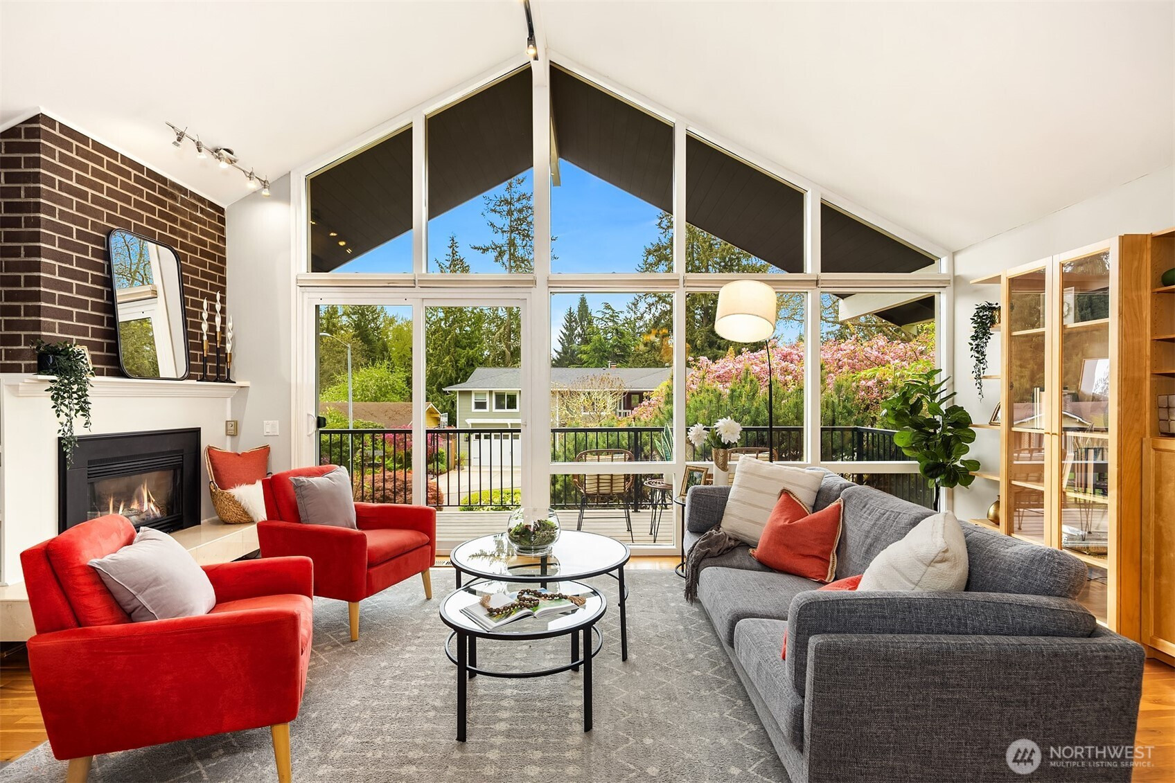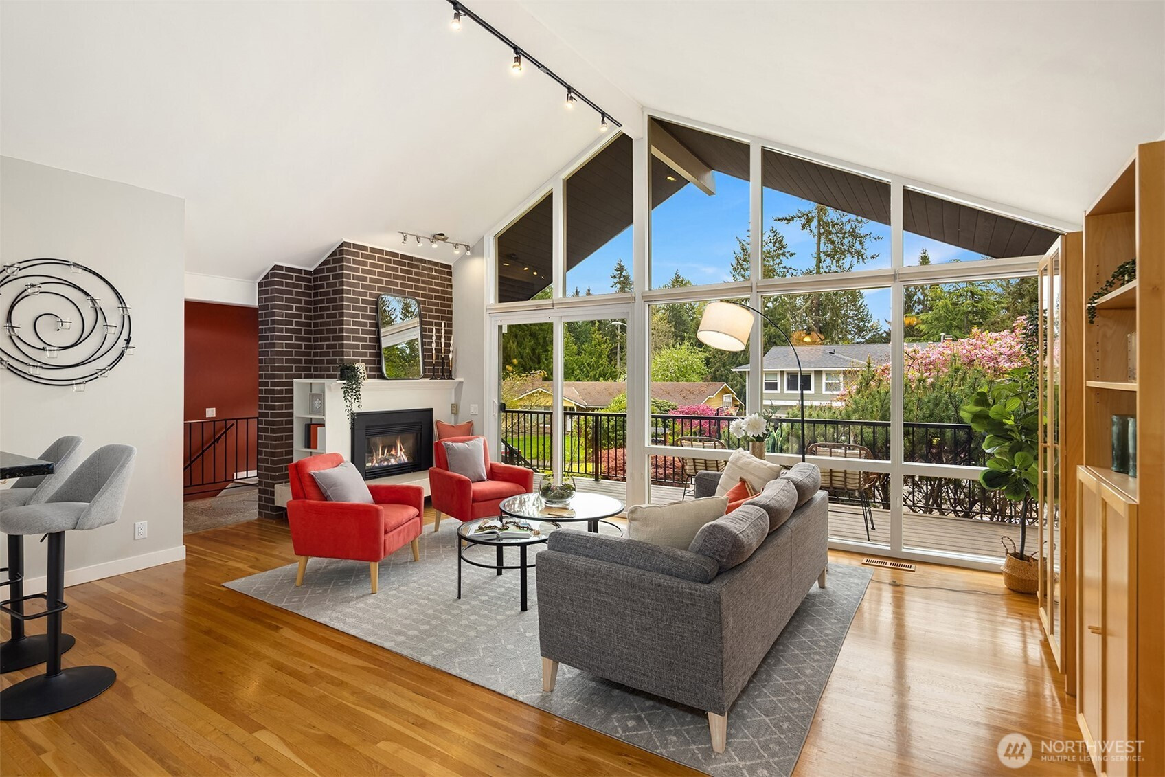 Sunlit 2-story home with a mid-century vibe in the Bretton Wood community of Bellevue sits on a beautifully landscaped parklike lot. Formal living area off the entry features a vaulted ceiling and south-facing, floor-to-ceiling windows that illuminate the interior with natural light. Modern kitchen with built-in breakfast nook and abundant cabinet space opens to a newer deck overlooking a true backyard retreat. Spacious primary bedroom with dual closets and an ensuite bath. Two additional bedrooms and a full bath complete the upper level. Lower level recreation room with MIL potential includes a kitchen, dedicated office space, a full bath and fourth bedroom with private entry. Fully fenced rear yard offers expansive garden and patio space, surrounded by mature landscaping & fruit trees bursting with perennial color, making it incredibly peaceful and private. Thoughtful improvements include A/C, solid-core interior doors, surround sound and a brand-new roof. Access to the highly sought-after Bennett Elementary & Interake High schools and nearby Tam O'Shanter Park. Minutes to Microsoft, shopping and light rail. A true gem, don't wait!
