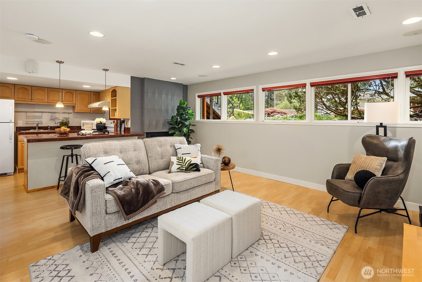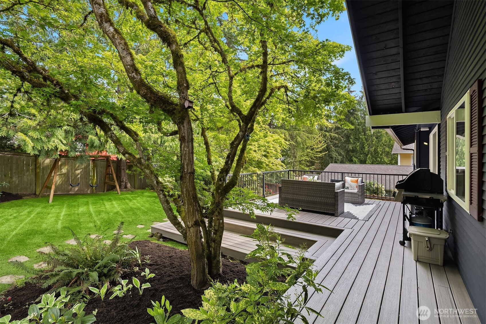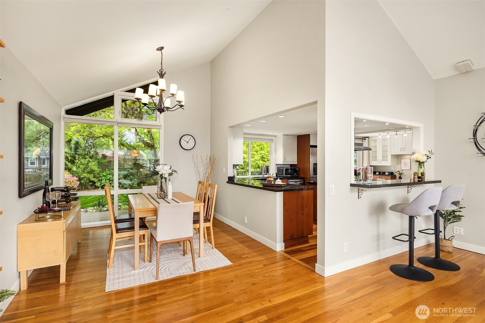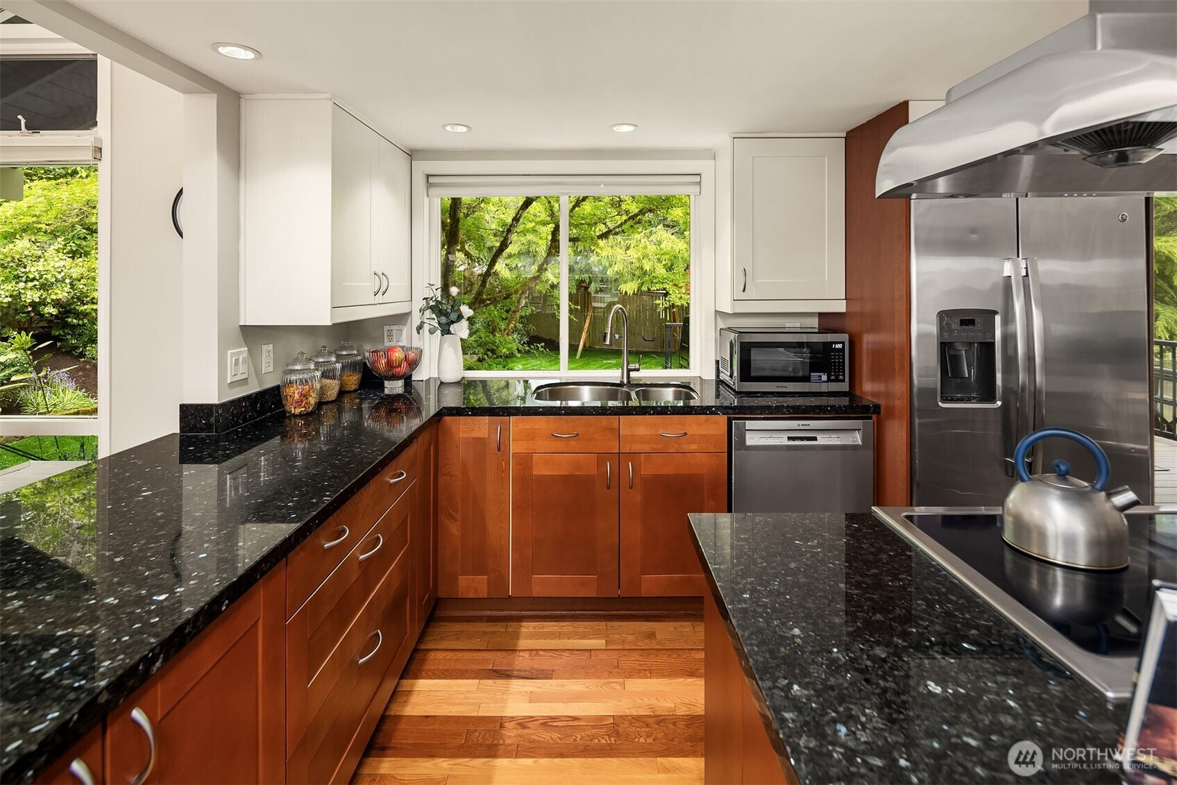 Sunlit 2-story home with a mid-century vibe in the Bretton Wood community of Bellevue sits on a beautifully landscaped parklike lot. Formal living area off the entry features a vaulted ceiling and south-facing, floor-to-ceiling windows that illuminate the interior with natural light. Modern kitchen with built-in breakfast nook and abundant cabinet space opens to a newer deck overlooking a true backyard retreat. Spacious primary bedroom with dual closets and an ensuite bath. Two additional bedrooms and a full bath complete the upper level. Lower level recreation room with MIL potential includes a kitchen, dedicated office space, a full bath and fourth bedroom with private entry. Fully fenced rear yard offers expansive garden and patio space, surrounded by mature landscaping & fruit trees bursting with perennial color, making it incredibly peaceful and private. Thoughtful improvements include A/C, solid-core interior doors, surround sound and a brand-new roof. Access to the highly sought-after Bennett Elementary & Interake High schools and nearby Tam O'Shanter Park. Minutes to Microsoft, shopping and light rail. A true gem, don't wait!