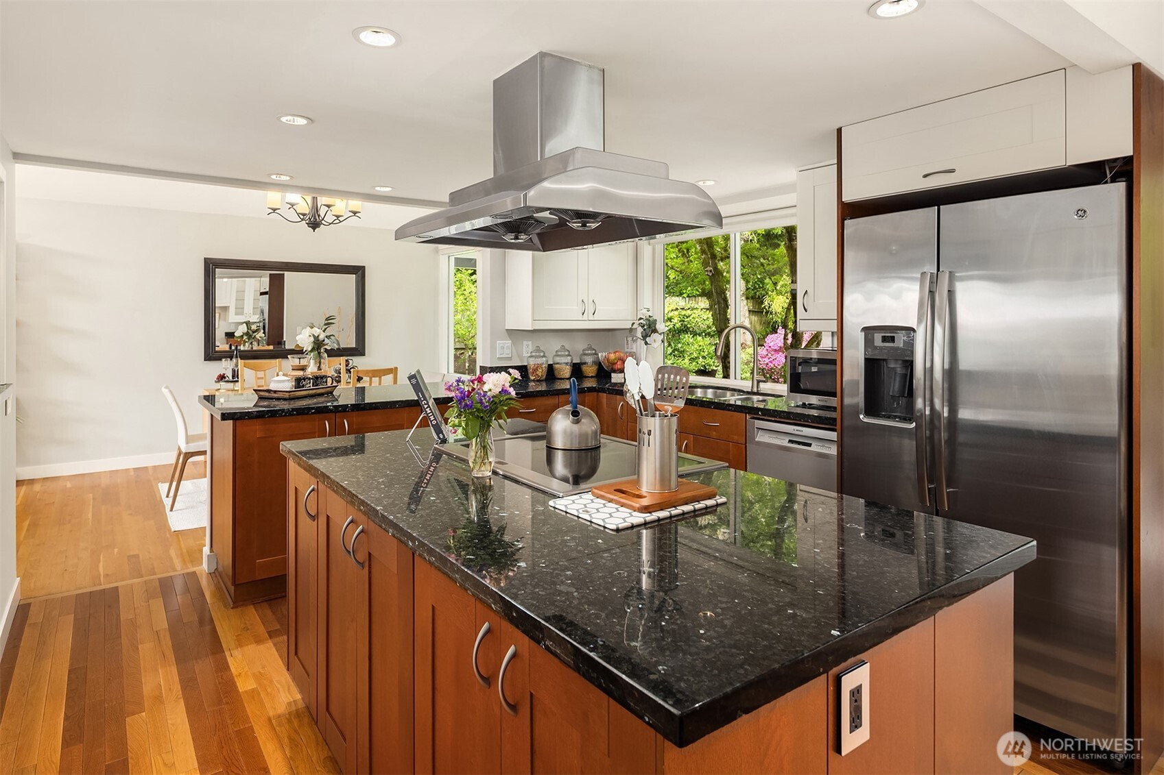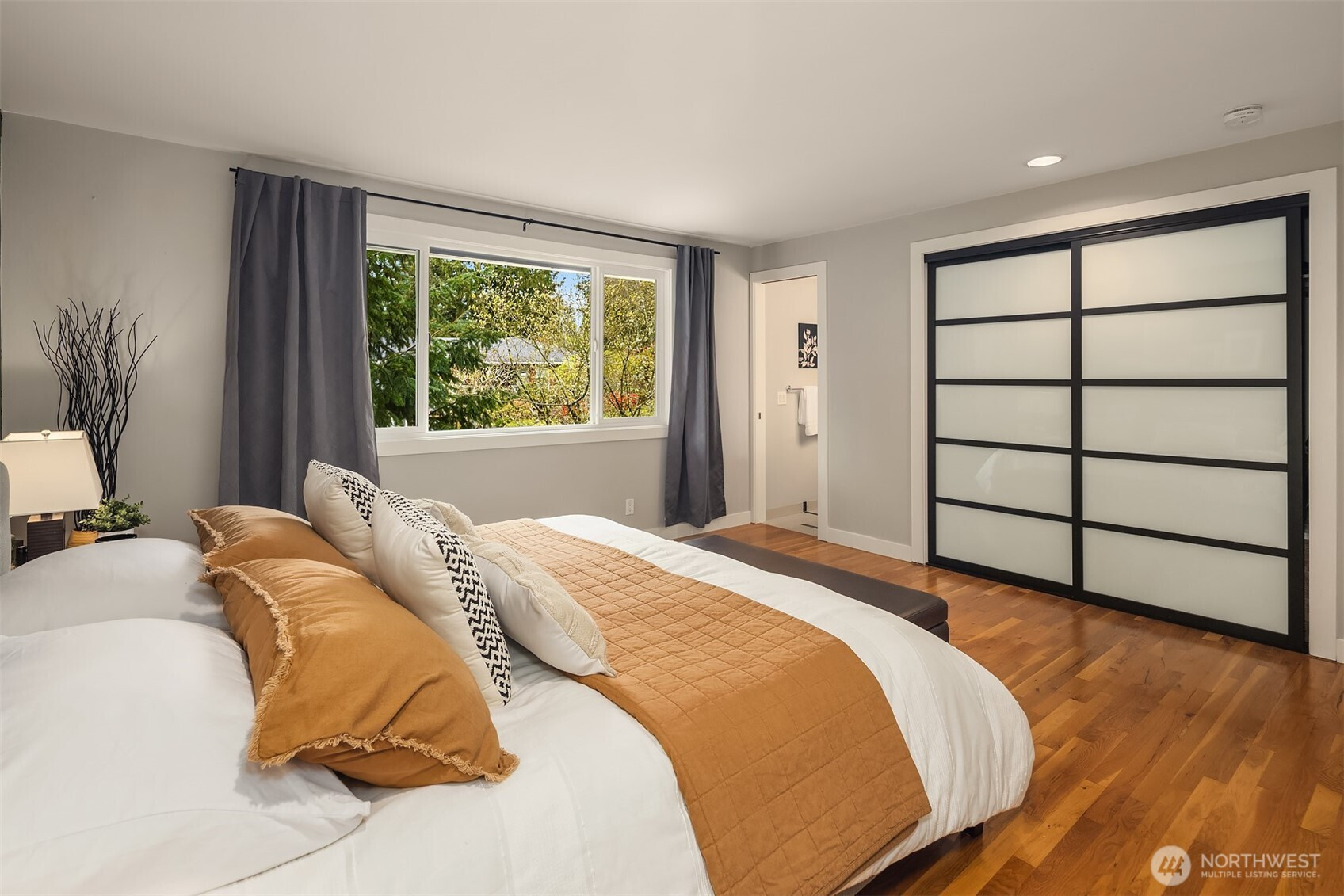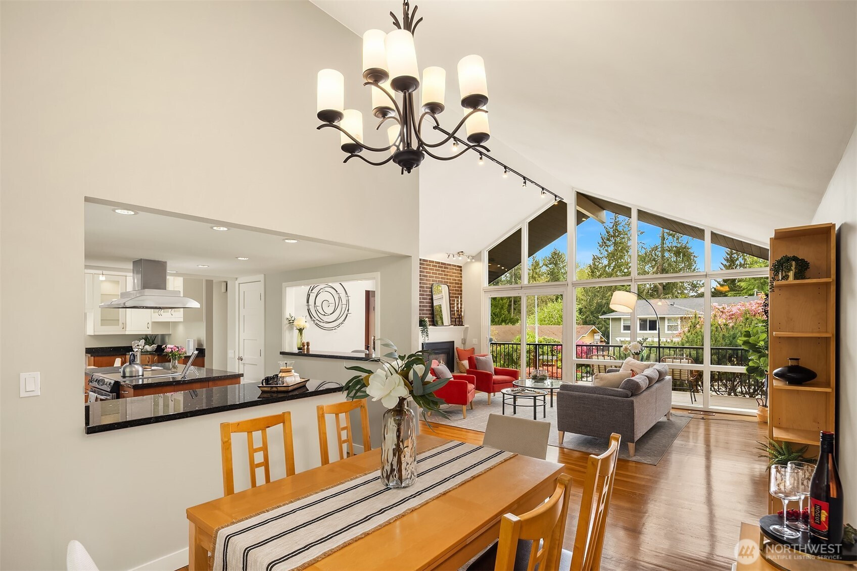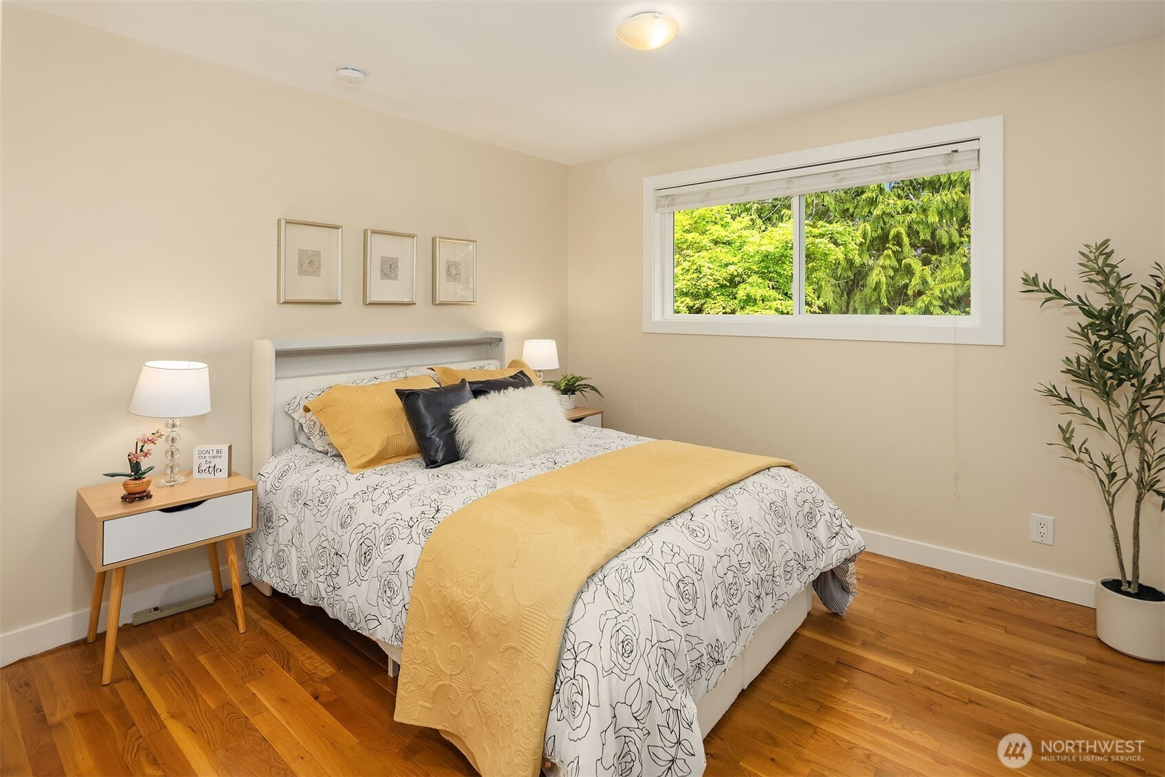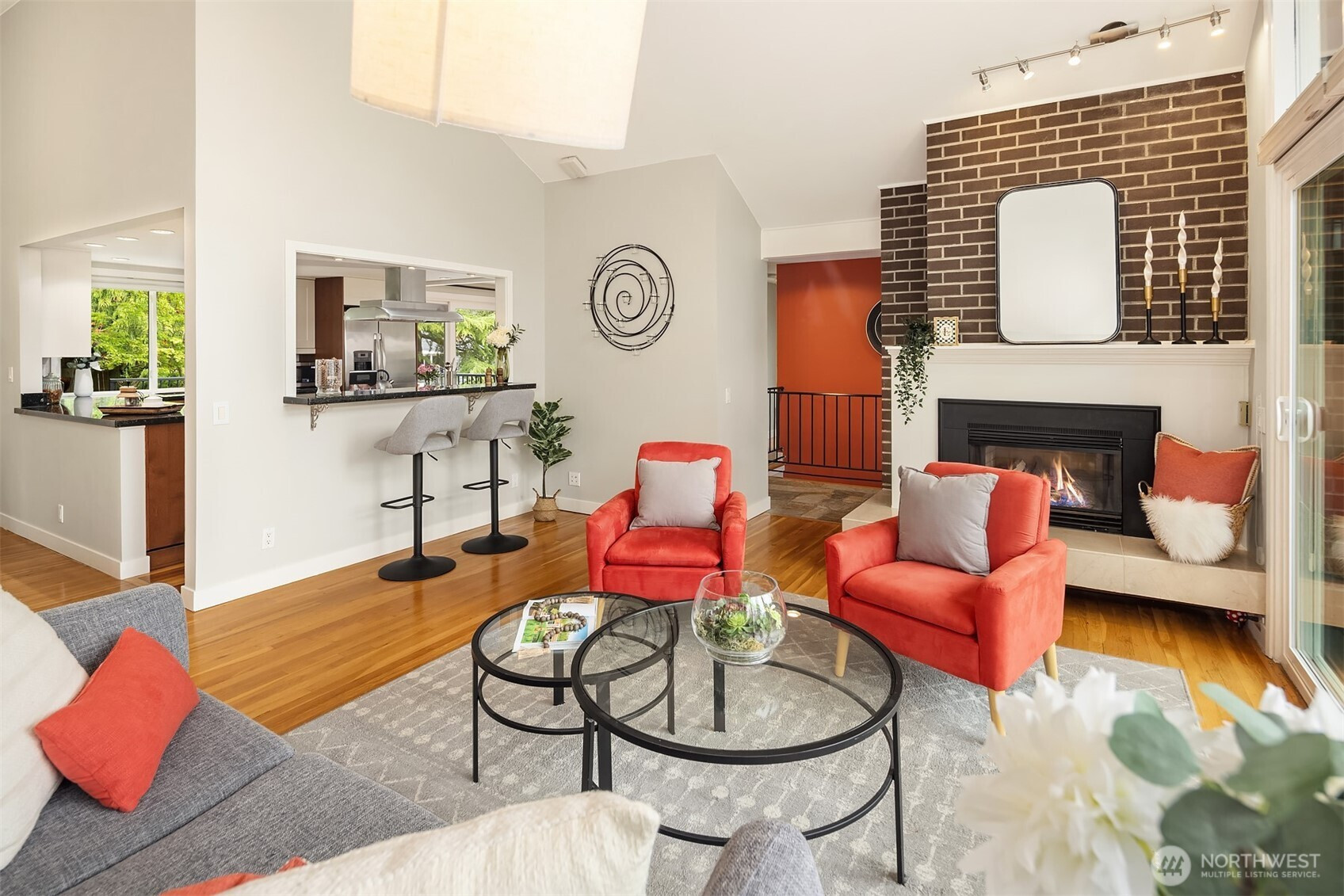 Sunlit 2-story home with a mid-century vibe in the Bretton Wood community of Bellevue sits on a beautifully landscaped parklike lot. Formal living area off the entry features a vaulted ceiling and south-facing, floor-to-ceiling windows that illuminate the interior with natural light. Modern kitchen with built-in breakfast nook and abundant cabinet space opens to a newer deck overlooking a true backyard retreat. Spacious primary bedroom with dual closets and an ensuite bath. Two additional bedrooms and a full bath complete the upper level. Lower level recreation room with MIL potential includes a kitchen, dedicated office space, a full bath and fourth bedroom with private entry. Fully fenced rear yard offers expansive garden and patio space, surrounded by mature landscaping & fruit trees bursting with perennial color, making it incredibly peaceful and private. Thoughtful improvements include A/C, solid-core interior doors, surround sound and a brand-new roof. Access to the highly sought-after Bennett Elementary & Interake High schools and nearby Tam O'Shanter Park. Minutes to Microsoft, shopping and light rail. A true gem, don't wait!