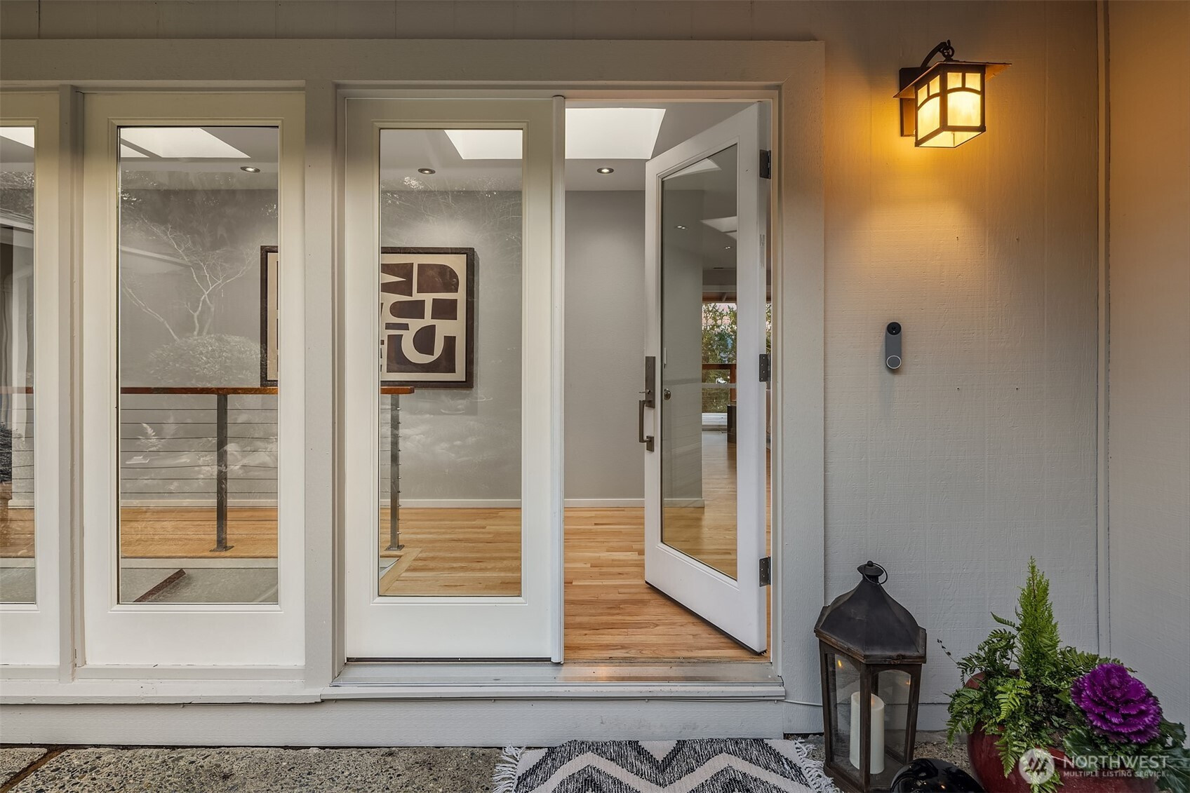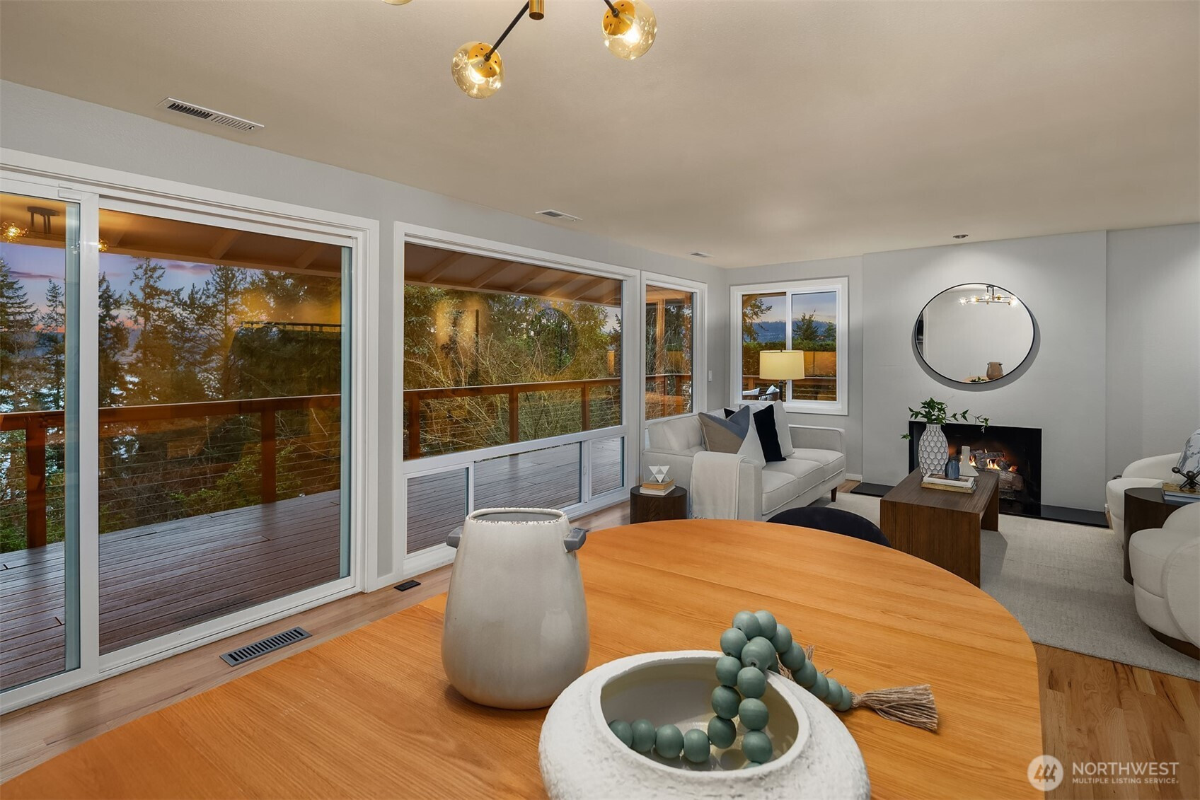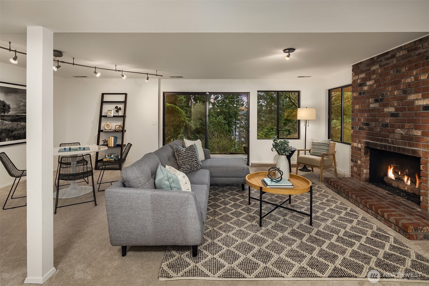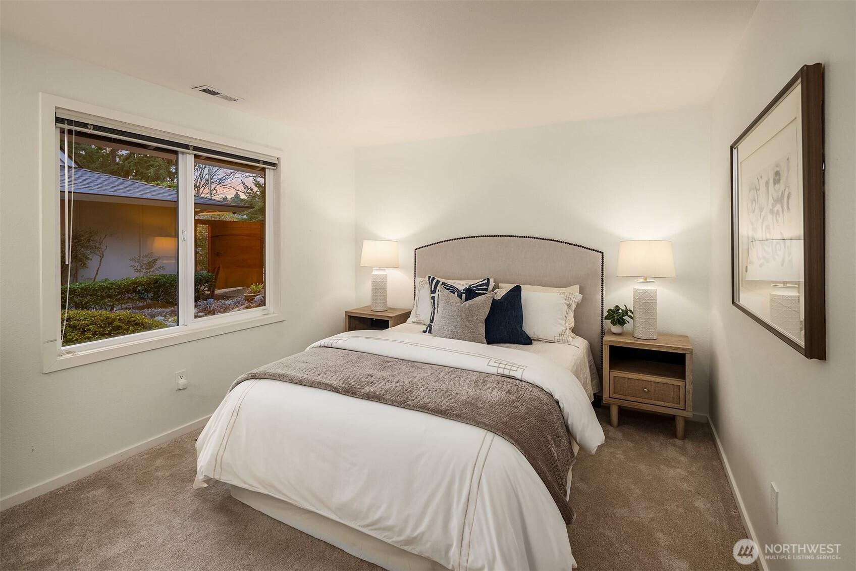 Expansive 3600 squ ft Renovated Lake Sammamish View Rambler w/Lower Level in Bellevue. 1/3 acre private retreat w/modern luxuries & functional living. Primary Bdrm on the main w/ensuite, spa-like double shower & walk in closet + 2nd bd/office & bath. Restored hardwood floors, lush carpet, wrap around large windows w/updated kitchen, SS appliances, beverage/coffee bar, open dining & living w/gas fireplace. LL has 2 Spacious bdrms w/ large closets & bath + office/laundry areas. Family/game room w/gas fp + extra 300 squ ft for (theater/gym/pilates/play). Additl features include: Interior/exterior Paint in 2025, Full solar panel system for energy efficiency, Tesla charger & top-tier whole house security. Mature landscaped grounds w/tranquil water feature in private courtyard & separate gazebo area wired for hot tub~ Award-winning Bellevue Schools, Interlake High & Bennett Elementary. Min to 520/I-90, MSFT, Amazon, Lk Samm Parks & Trails