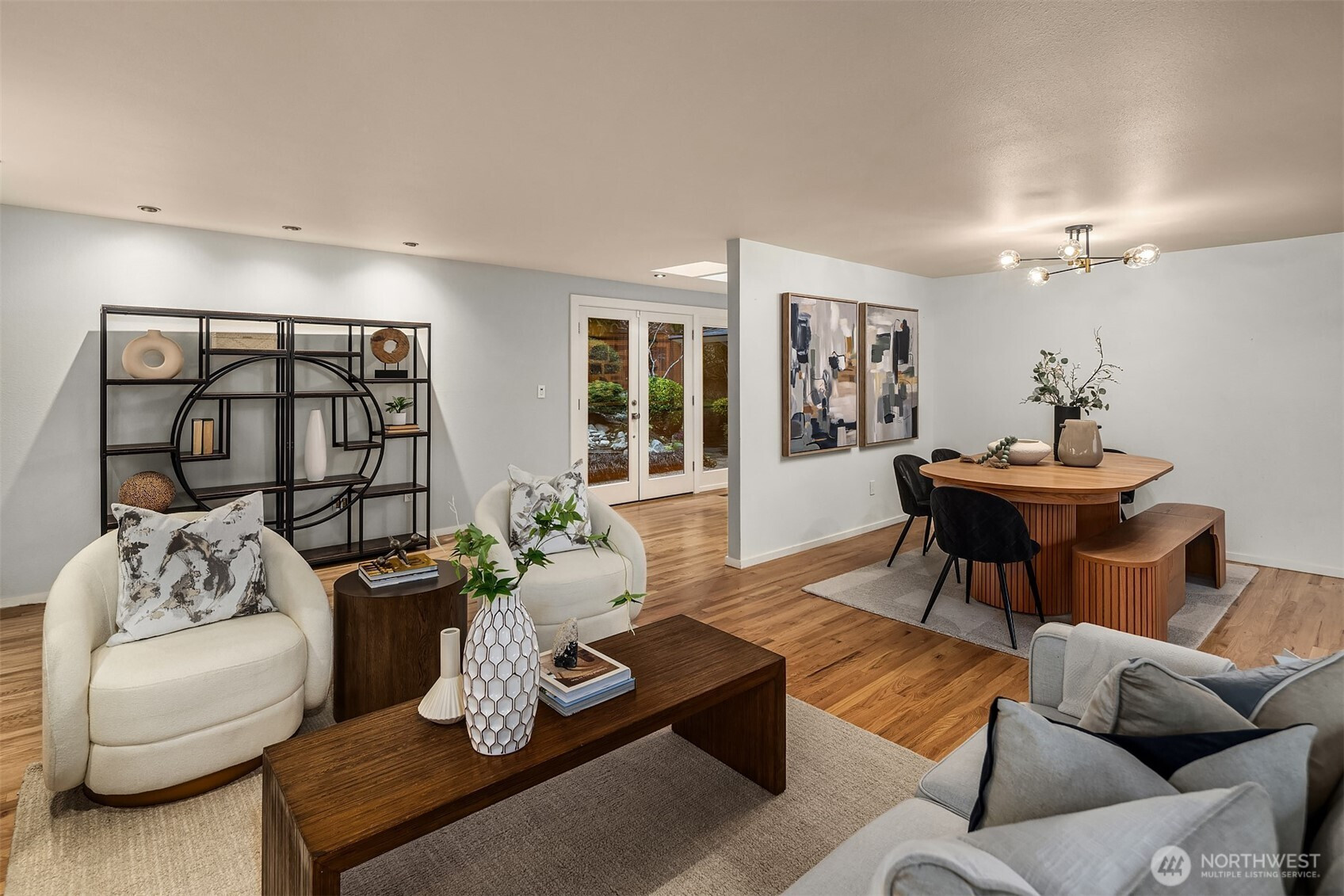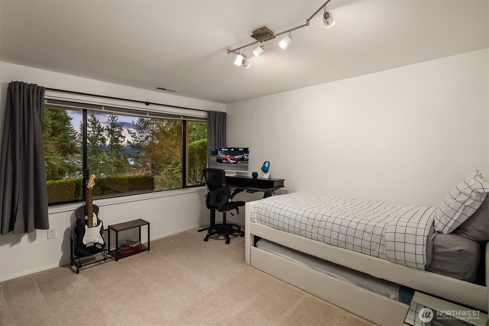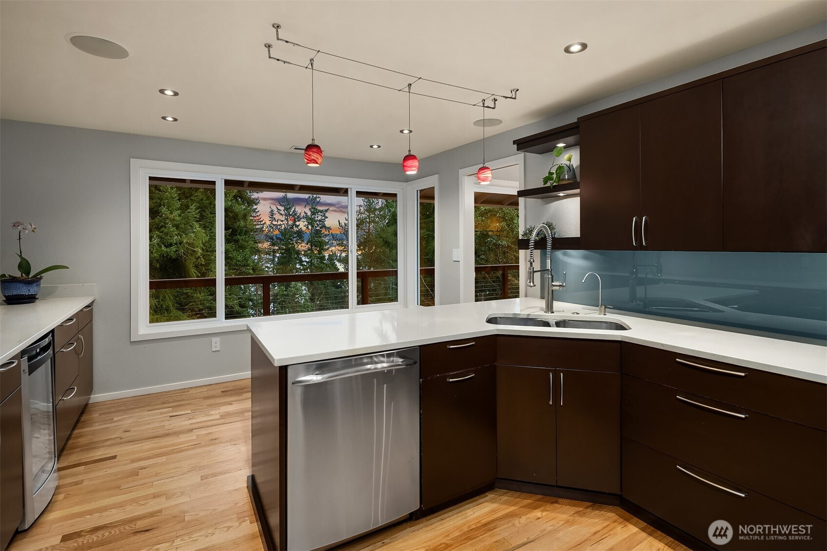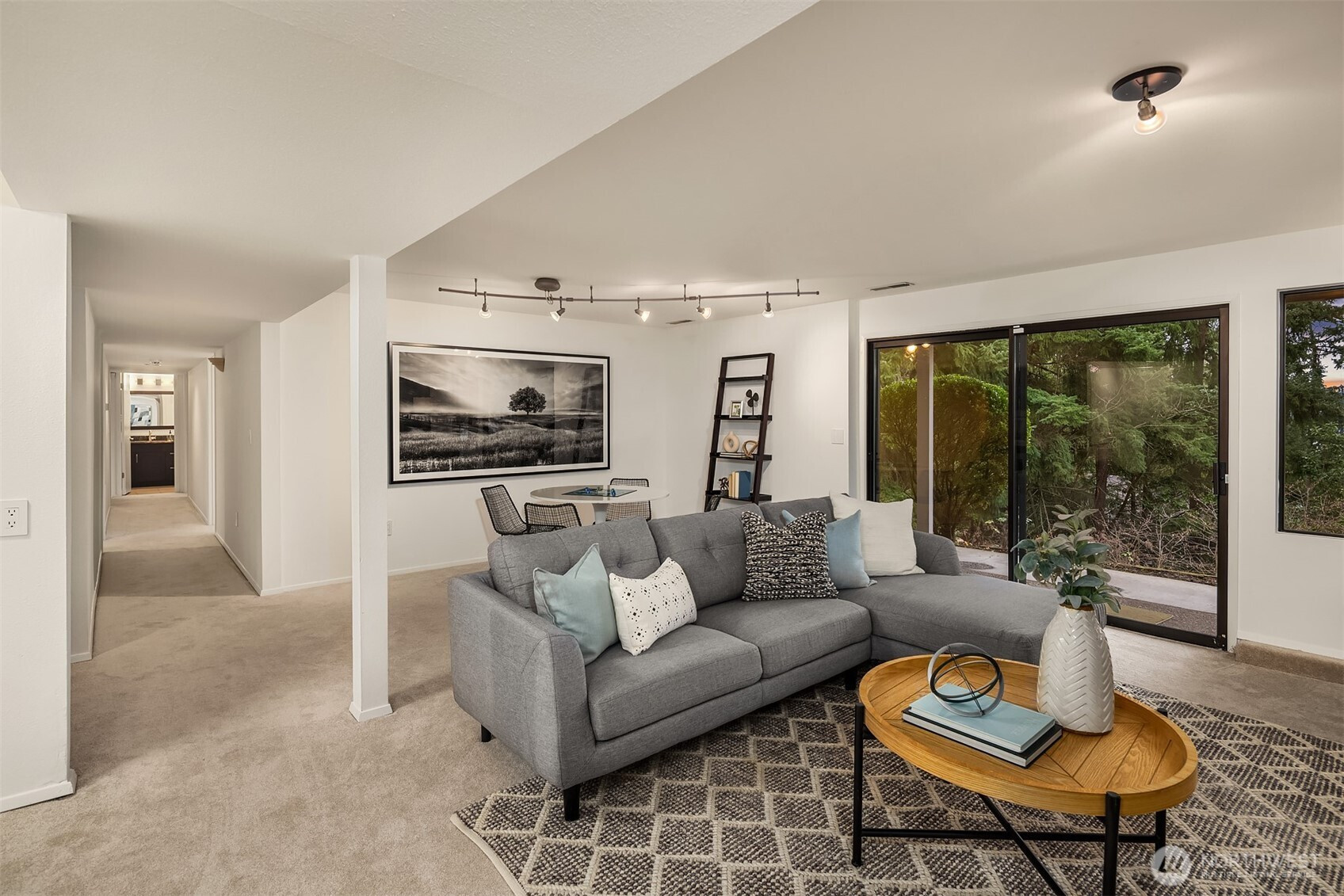 Expansive 3600 squ ft Renovated Lake Sammamish View Rambler w/Lower Level in Bellevue. 1/3 acre private retreat w/modern luxuries & functional living. Primary Bdrm on the main w/ensuite, spa-like double shower & walk in closet + 2nd bd/office & bath. Restored hardwood floors, lush carpet, wrap around large windows w/updated kitchen, SS appliances, beverage/coffee bar, open dining & living w/gas fireplace. LL has 2 Spacious bdrms w/ large closets & bath + office/laundry areas. Family/game room w/gas fp + extra 300 squ ft for (theater/gym/pilates/play). Additl features include: Interior/exterior Paint in 2025, Full solar panel system for energy efficiency, Tesla charger & top-tier whole house security. Mature landscaped grounds w/tranquil water feature in private courtyard & separate gazebo area wired for hot tub~ Award-winning Bellevue Schools, Interlake High & Bennett Elementary. Min to 520/I-90, MSFT, Amazon, Lk Samm Parks & Trails