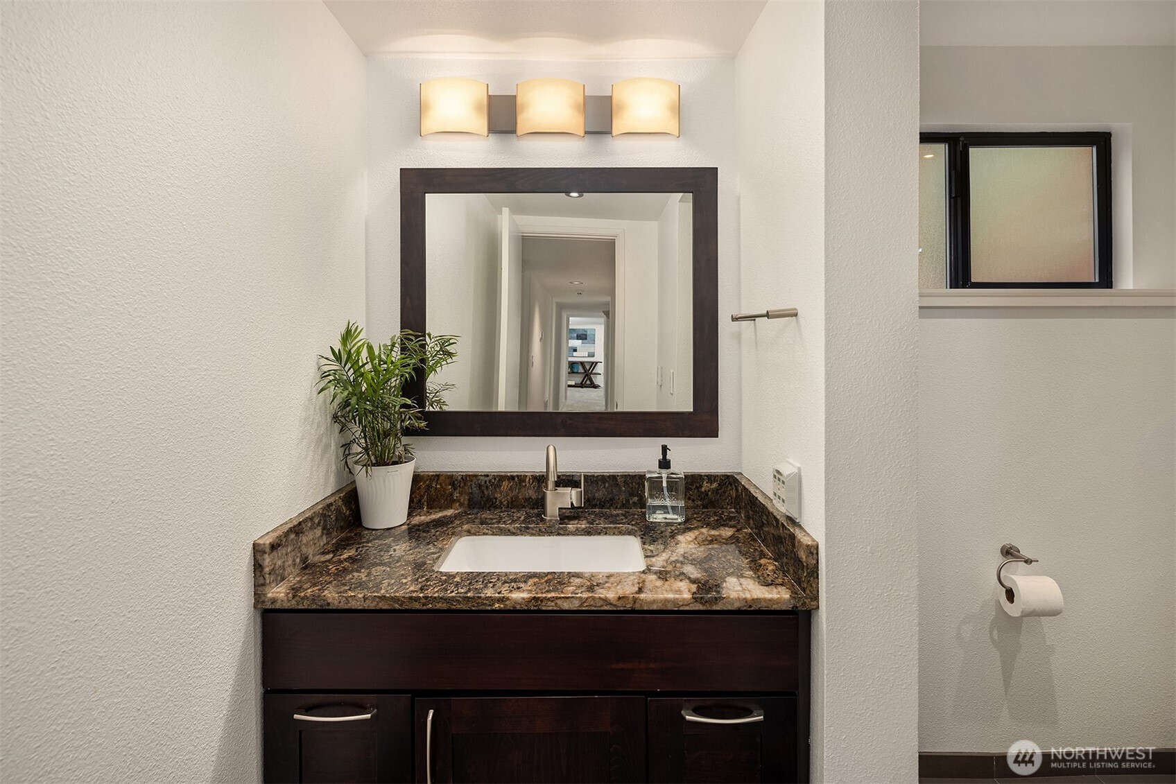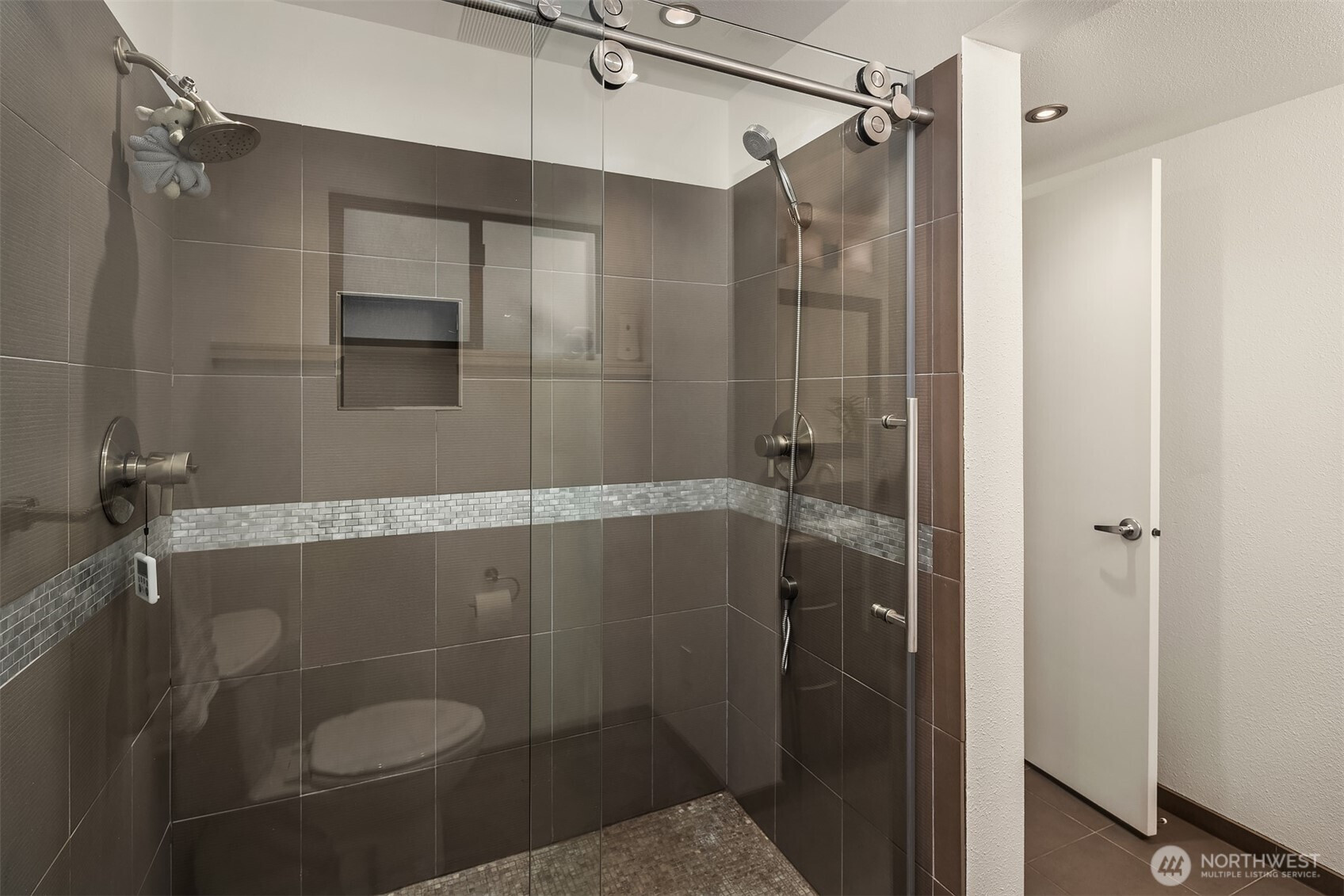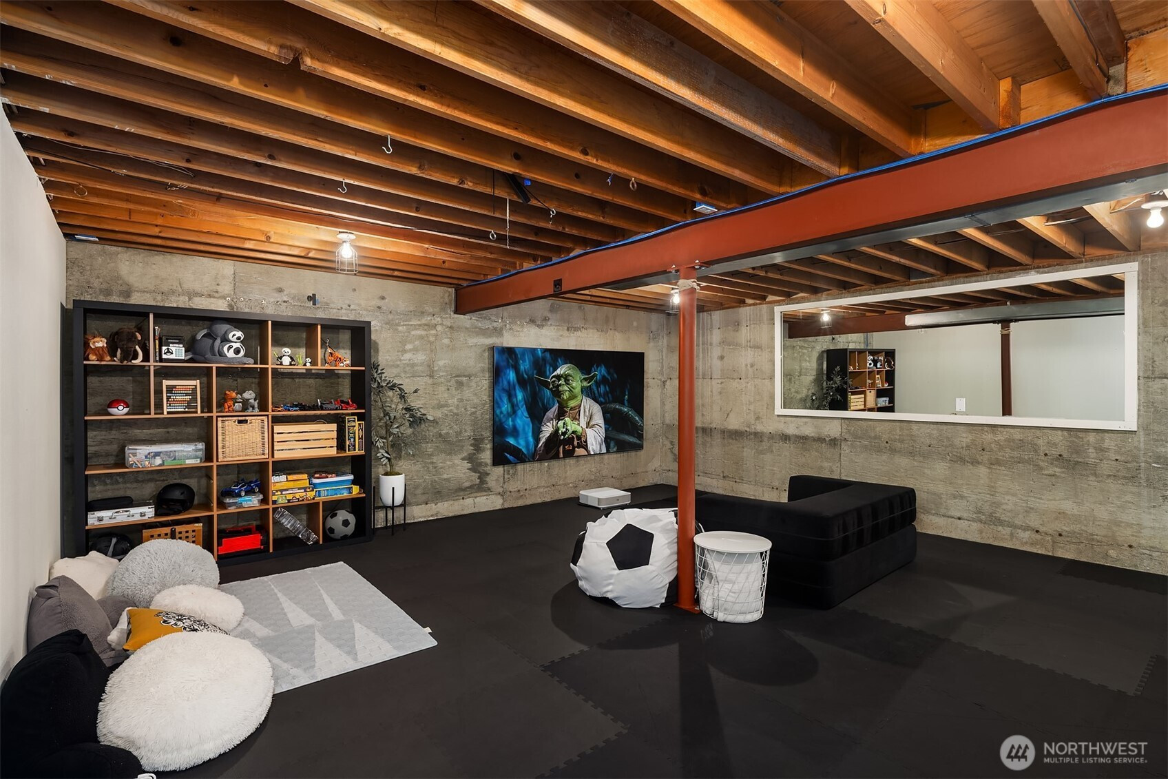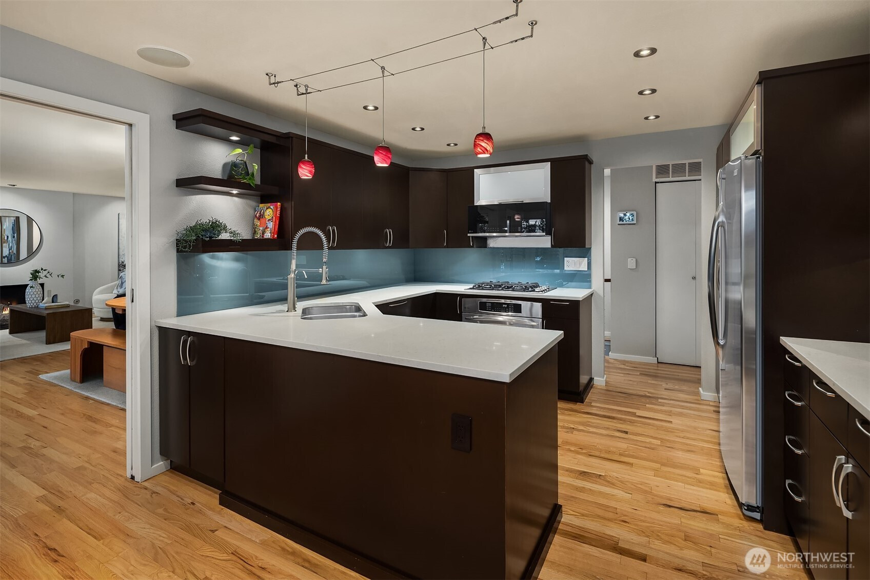 Expansive 3600 squ ft Renovated Lake Sammamish View Rambler w/Lower Level in Bellevue. 1/3 acre private retreat w/modern luxuries & functional living. Primary Bdrm on the main w/ensuite, spa-like double shower & walk in closet + 2nd bd/office & bath. Restored hardwood floors, lush carpet, wrap around large windows w/updated kitchen, SS appliances, beverage/coffee bar, open dining & living w/gas fireplace. LL has 2 Spacious bdrms w/ large closets & bath + office/laundry areas. Family/game room w/gas fp + extra 300 squ ft for (theater/gym/pilates/play). Additl features include: Interior/exterior Paint in 2025, Full solar panel system for energy efficiency, Tesla charger & top-tier whole house security. Mature landscaped grounds w/tranquil water feature in private courtyard & separate gazebo area wired for hot tub~ Award-winning Bellevue Schools, Interlake High & Bennett Elementary. Min to 520/I-90, MSFT, Amazon, Lk Samm Parks & Trails
