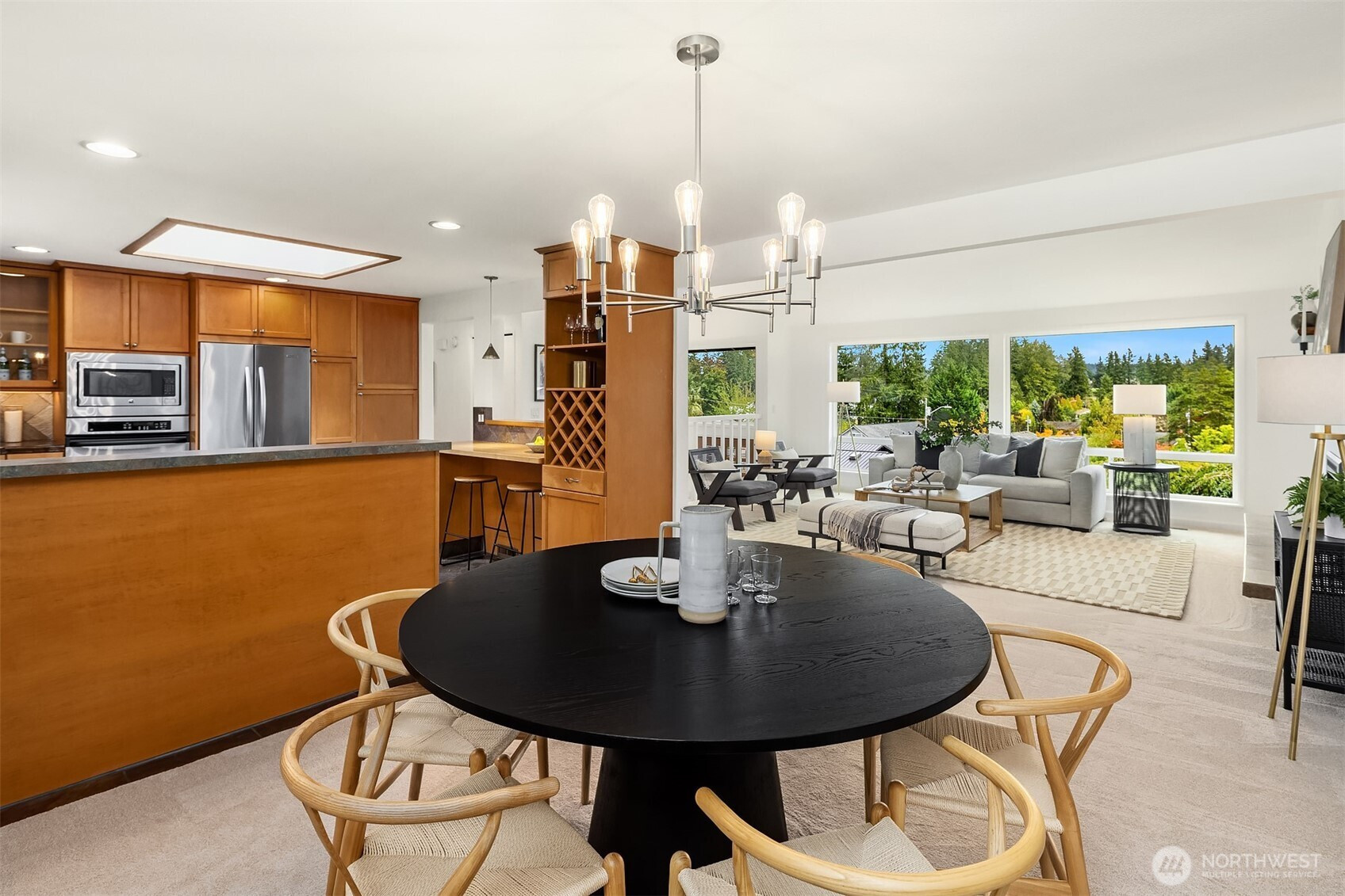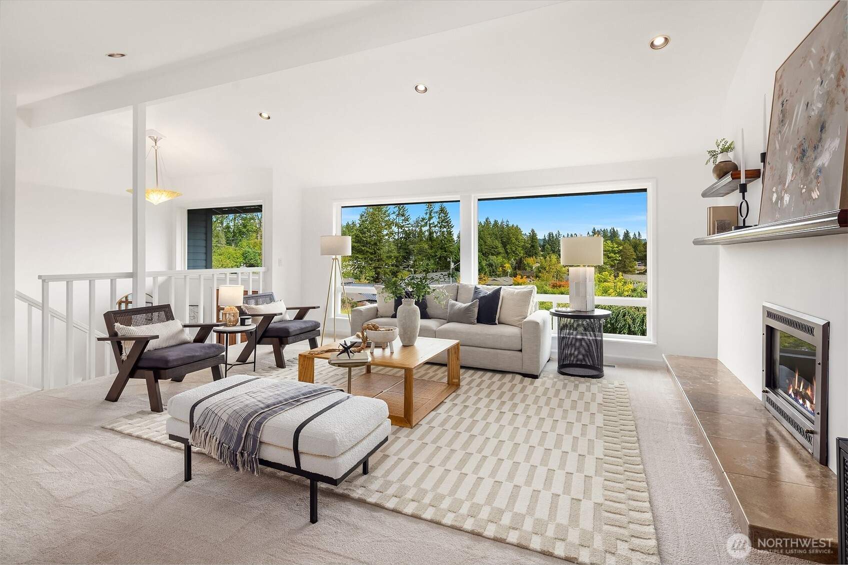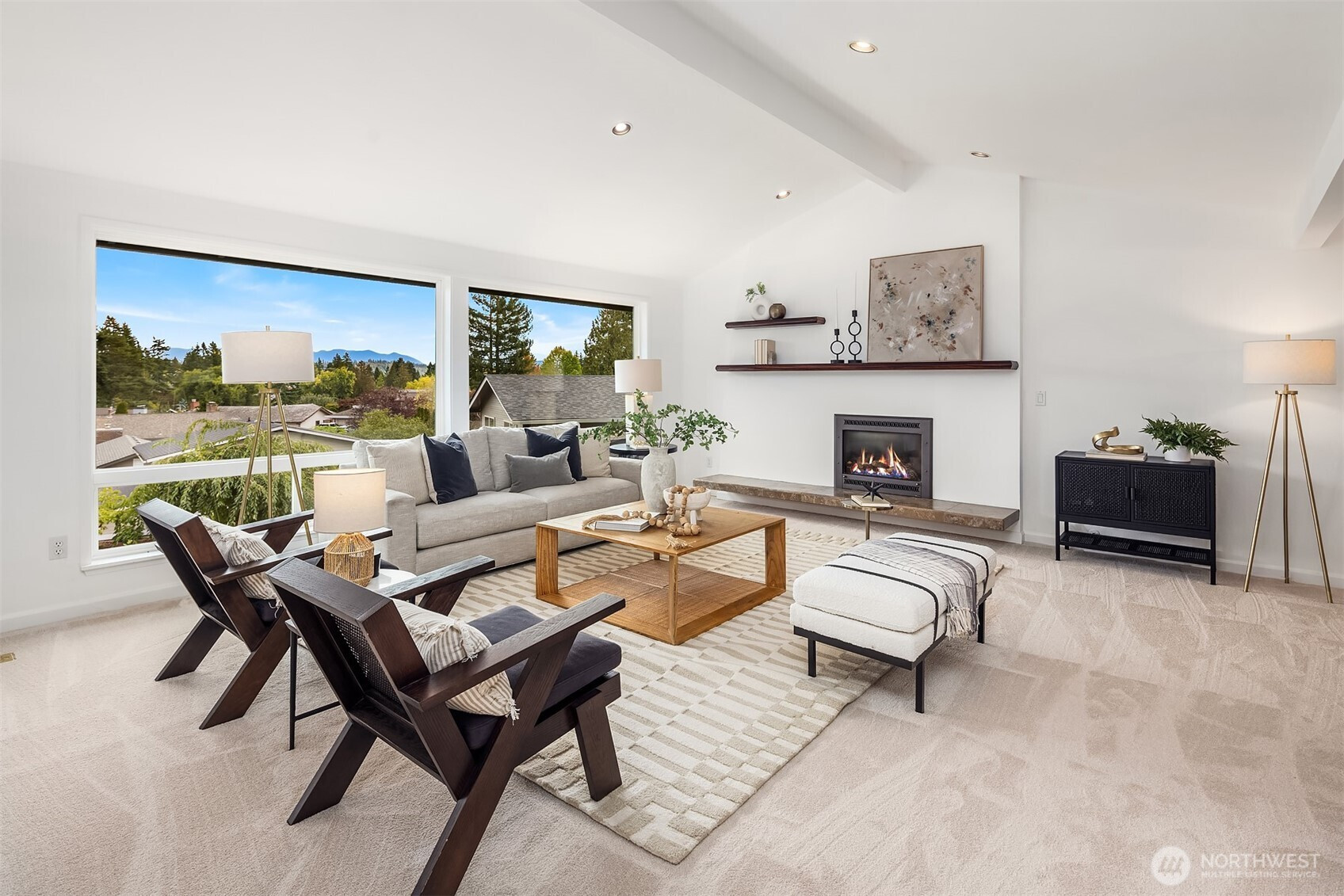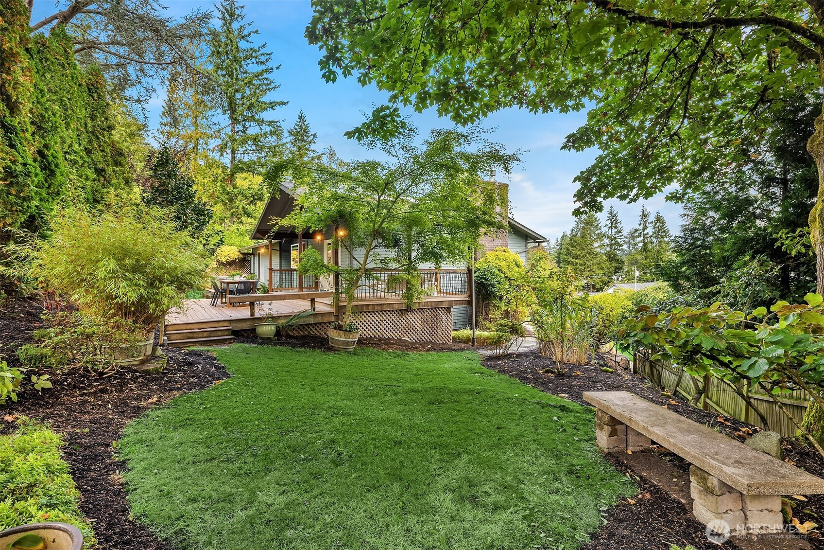 Beautiful Bellevue Home near Microsoft at top of cul de sac, overlooking Tam O'Shanter golf course & Cascade mountains. Functional & Inviting open concept w/vaulted ceilings & double-paned windows creating warm & relaxing spaces. Updated kitchen w/custom wood cabinetry, concrete countertops w/gas cooktop & SS appliances. Great Room w/gas fireplace & dining extend to outdoor wrap-around covered deck w/mature landscaped yard. True Primary Suite on the main w/bath, office & private deck + addit. bdrm & full bath. LL bonus rm + addit. bdrm w/updated ba & laundry. New carpet & paint. Finished extended garage, AC/Heat Pump. Amenities: Golf/Pickleball/Tennis/Swim/ Park/Restaurant/Clubhouse. Bennett Elem/Interlake High/Microsoft/Amazon/520 & I-90