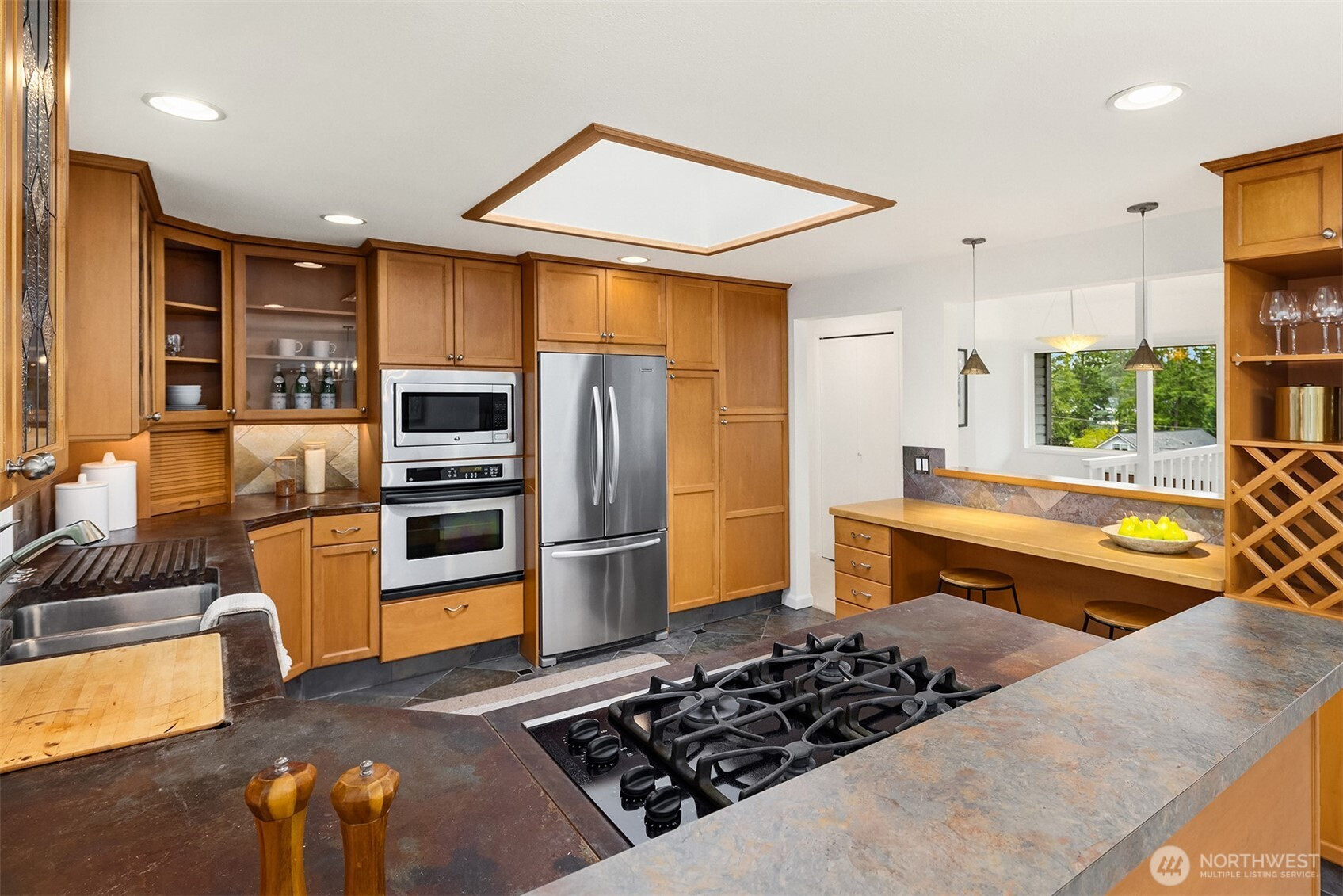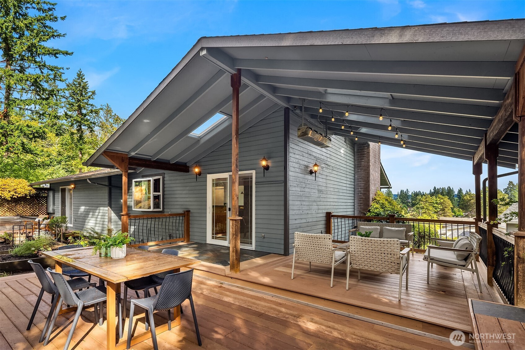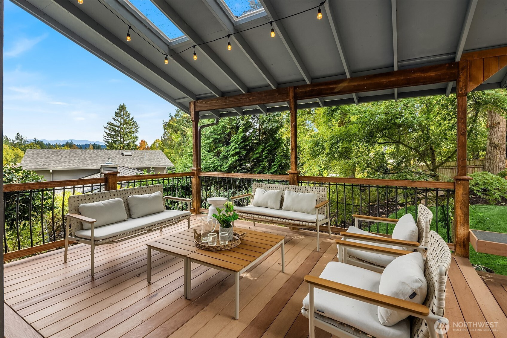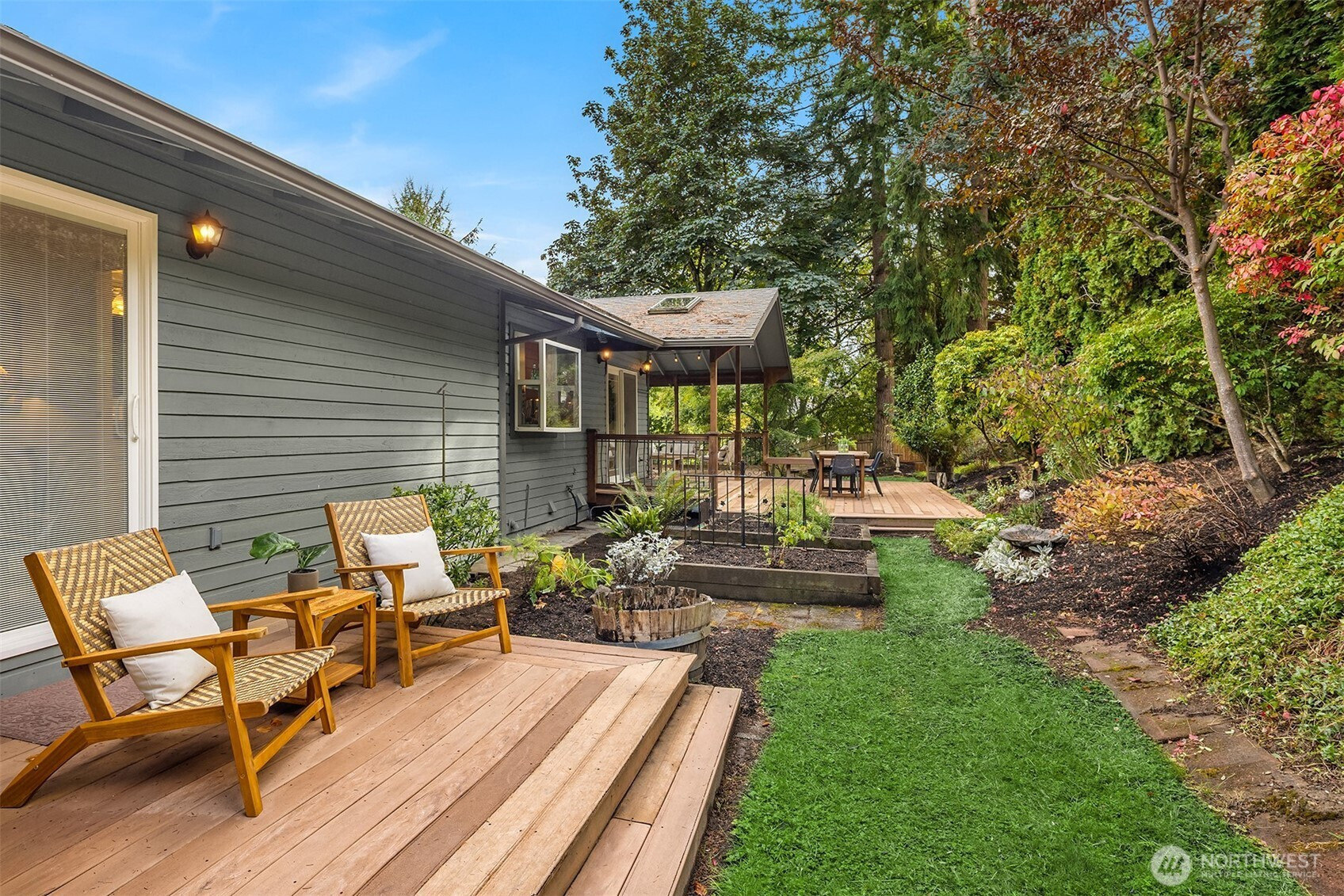 Beautiful Bellevue Home near Microsoft at top of cul de sac, overlooking Tam O'Shanter golf course & Cascade mountains. Functional & Inviting open concept w/vaulted ceilings & double-paned windows creating warm & relaxing spaces. Updated kitchen w/custom wood cabinetry, concrete countertops w/gas cooktop & SS appliances. Great Room w/gas fireplace & dining extend to outdoor wrap-around covered deck w/mature landscaped yard. True Primary Suite on the main w/bath, office & private deck + addit. bdrm & full bath. LL bonus rm + addit. bdrm w/updated ba & laundry. New carpet & paint. Finished extended garage, AC/Heat Pump. Amenities: Golf/Pickleball/Tennis/Swim/ Park/Restaurant/Clubhouse. Bennett Elem/Interlake High/Microsoft/Amazon/520 & I-90