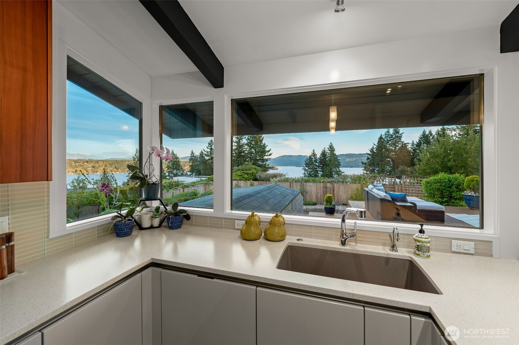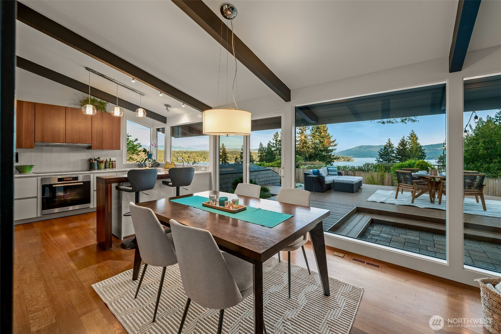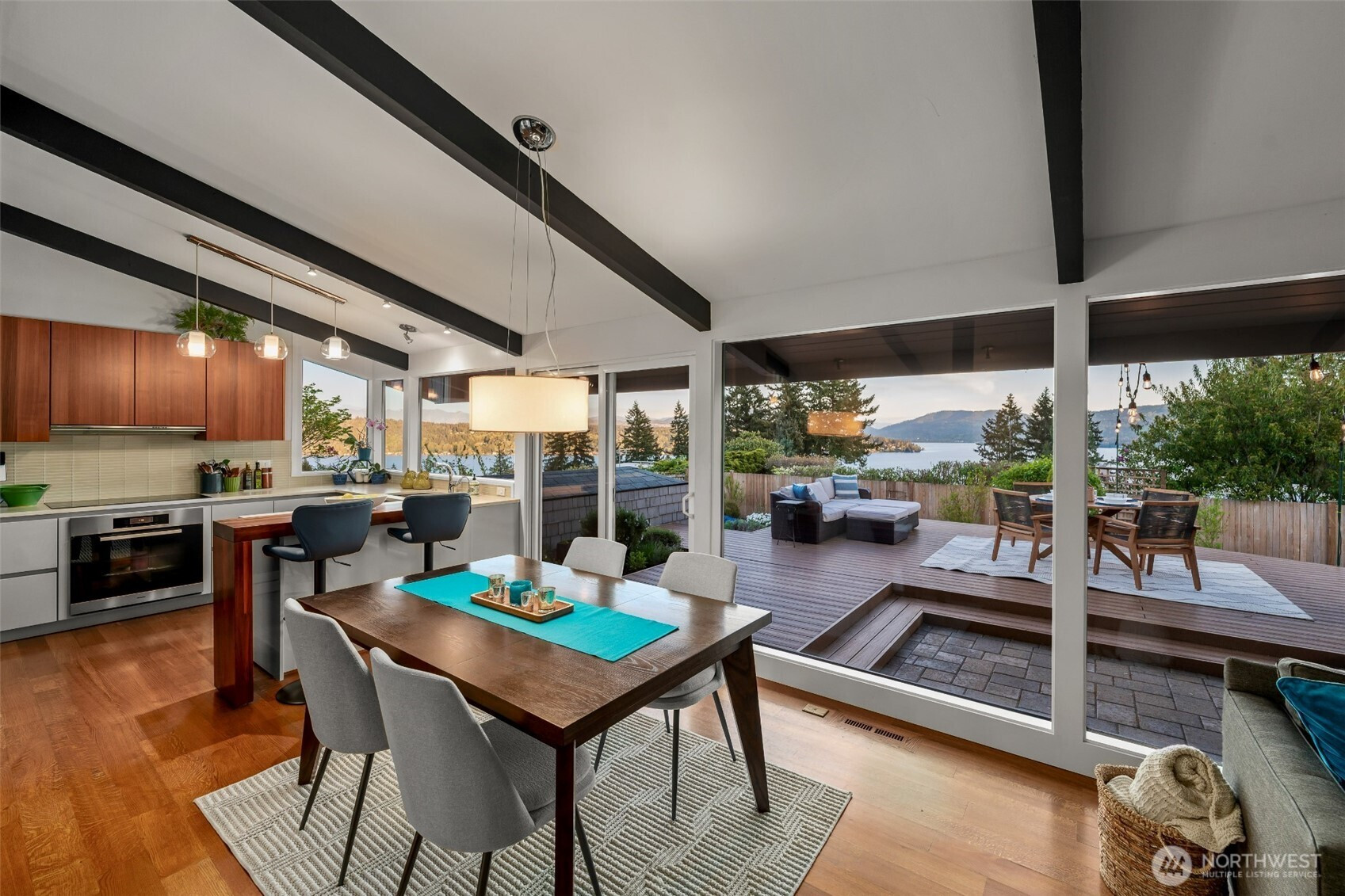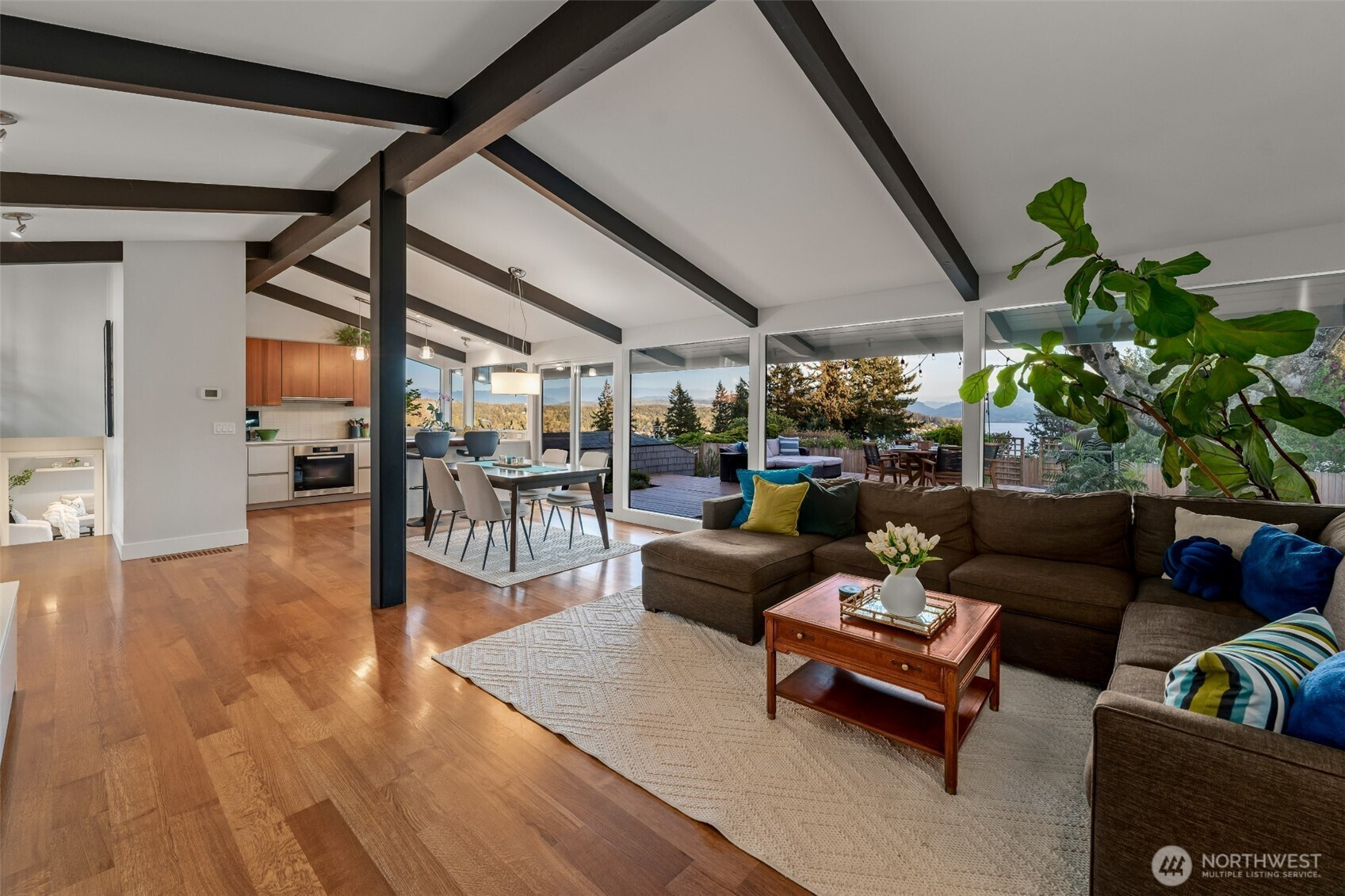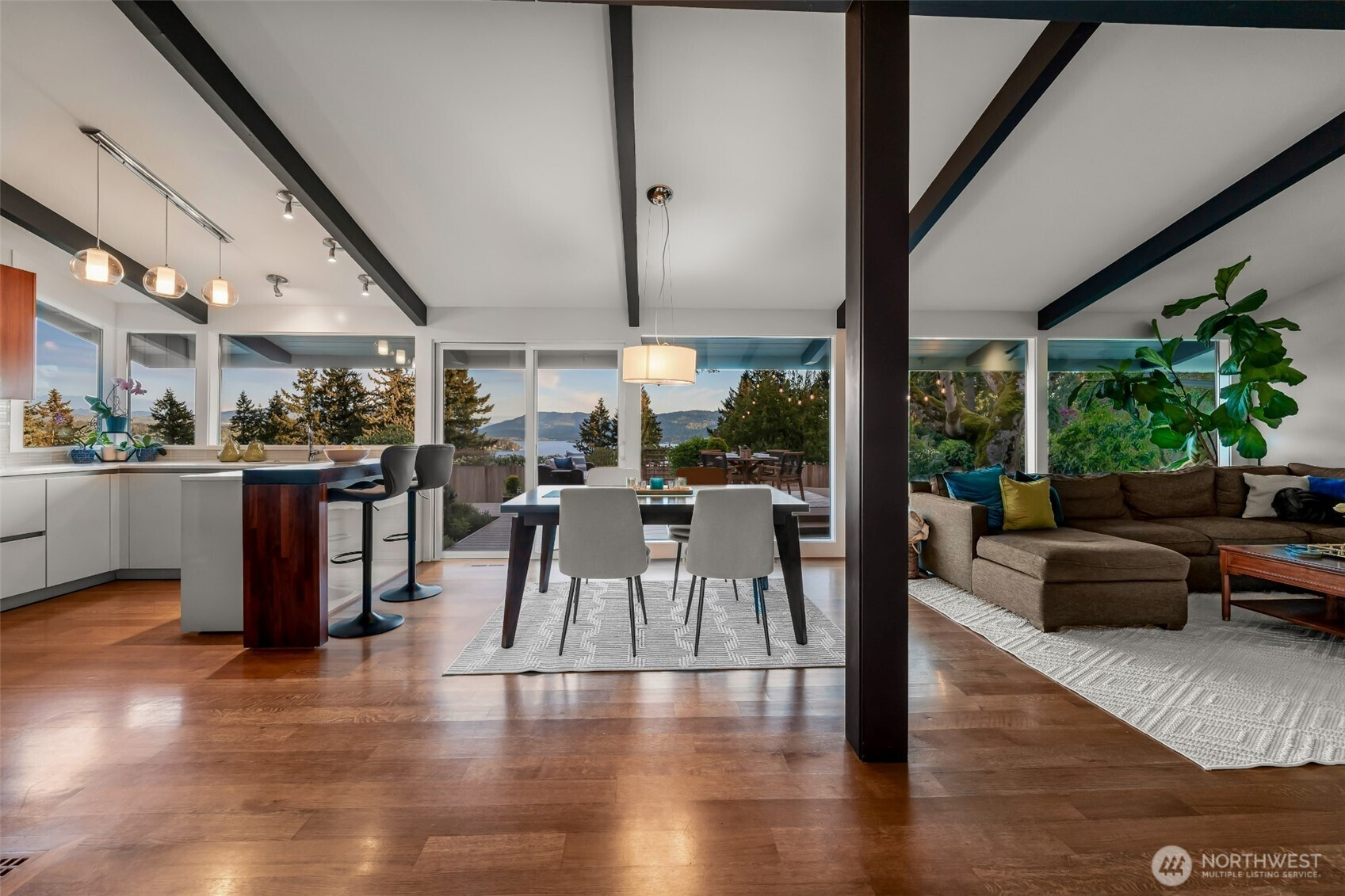 Set on the premier view lot in Bretton Wood, this exceptional, fully updated home offers panoramic Lake Sammamish and Cascade mountain views from every room. Thoughtfully designed with a mid-century modern influence, the home features vaulted ceilings with striking exposed beams and expansive walls of windows that fill the space with natural light. Beautiful hardwood floors run throughout the main living areas, and the updated kitchen flows effortlessly to a spacious view deck, creating seamless indoor outdoor living and dining, enhanced by central A/C for year round comfort. The private lot spans over 1/4 acre, offering a peaceful, serene setting with room to entertain, garden, or unwind. The lower level includes a large additional living space that also enjoys lake views, a rare and special feature. High quality updates throughout, including a durable metal roof and large two car garage. Pre inspected for buyer confidence. Quiet neighborhood street just minutes to top rated Bennett Elementary, Microsoft, and major Eastside amenities. A rare opportunity to own one of Bretton Wood’s most sought after properties.