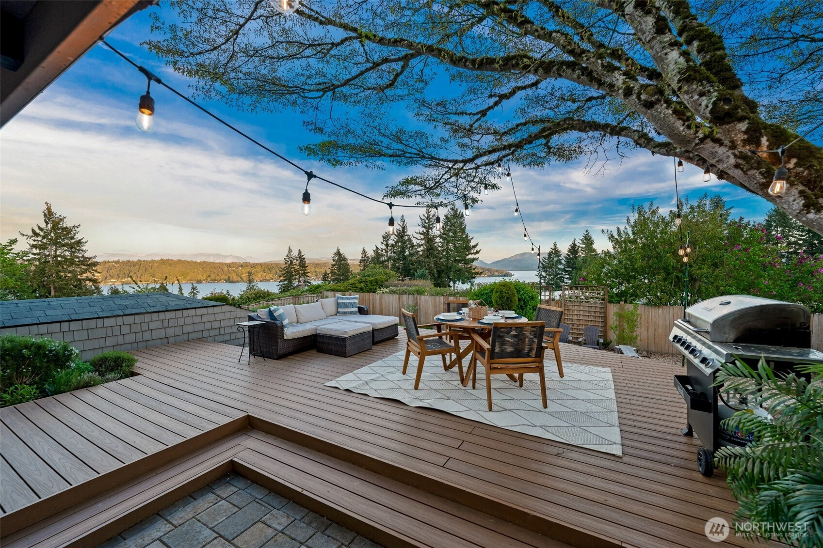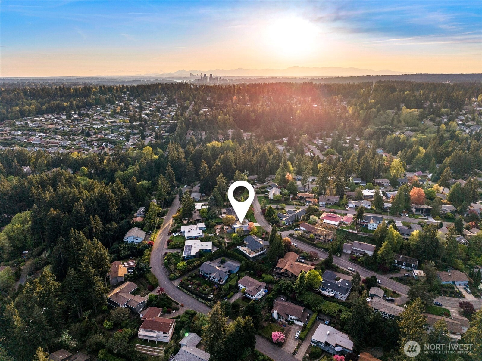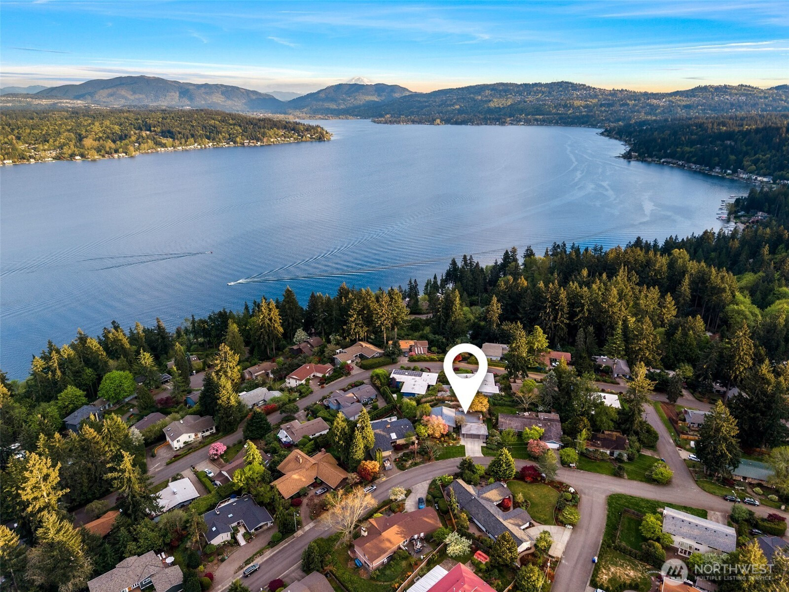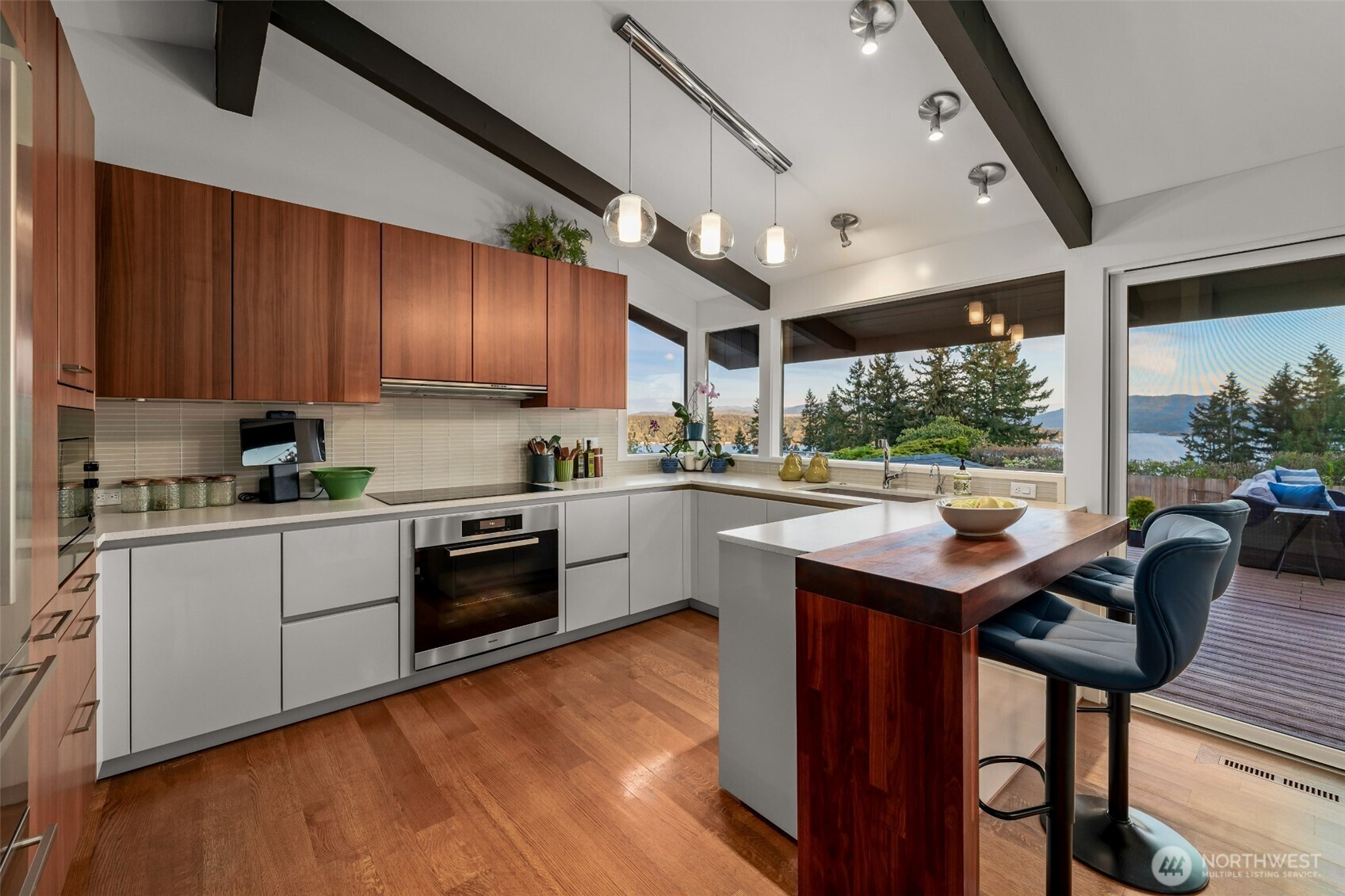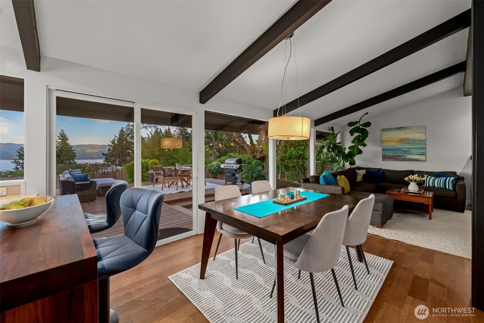 Set on the premier view lot in Bretton Wood, this exceptional, fully updated home offers panoramic Lake Sammamish and Cascade mountain views from every room. Thoughtfully designed with a mid-century modern influence, the home features vaulted ceilings with striking exposed beams and expansive walls of windows that fill the space with natural light. Beautiful hardwood floors run throughout the main living areas, and the updated kitchen flows effortlessly to a spacious view deck, creating seamless indoor outdoor living and dining, enhanced by central A/C for year round comfort. The private lot spans over 1/4 acre, offering a peaceful, serene setting with room to entertain, garden, or unwind. The lower level includes a large additional living space that also enjoys lake views, a rare and special feature. High quality updates throughout, including a durable metal roof and large two car garage. Pre inspected for buyer confidence. Quiet neighborhood street just minutes to top rated Bennett Elementary, Microsoft, and major Eastside amenities. A rare opportunity to own one of Bretton Wood’s most sought after properties.