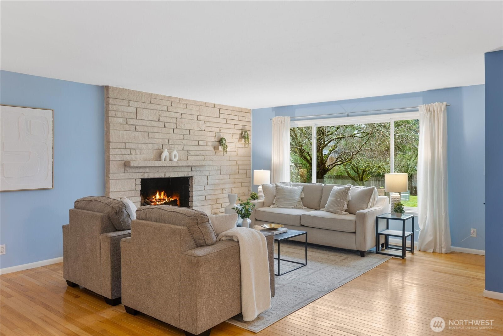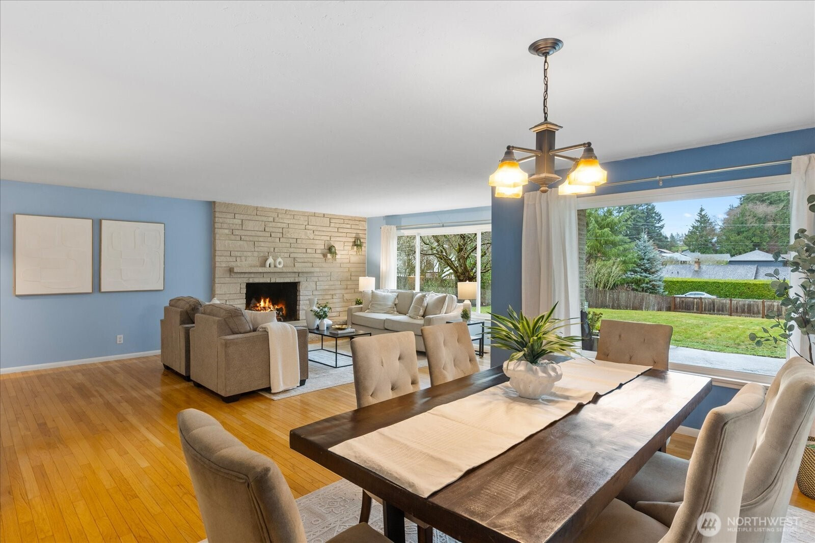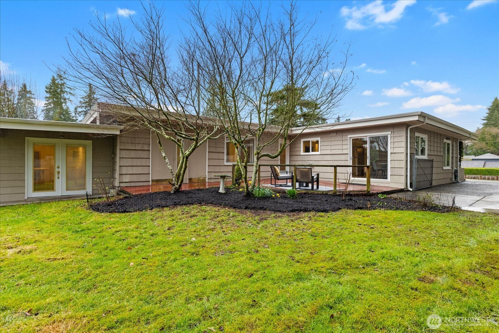 Tucked back off of a quiet street, this mid-century modern rambler offers space, privacy, and endless possibility. Set on a huge, 18,000sqft fully fenced lot surrounded by fruit trees, flowering shrubs and edible berries. This home is filled with natural light and serene views from every window. Spacious living and dining areas center around a cozy wood-burning fireplace—ideal for gathering or quiet evenings in. The refreshed kitchen features new LVT flooring, all new appliances, and space for a breakfast nook overlooking the peaceful patio and visiting wildlife. Enjoy year-round comfort with new mini-splits throughout providing efficient heating and cooling from room to room. Newly installed TPO (Thermoplastic Polyolefin) roof complete with added insulation for peace of mind. With its NR3 zoning, the expansive lot offers exciting DADU or future build potential (buyer to verify). Large shop/studio with electric heat and a two-car garage add versatility for hobbies, storage, or creative space. Conveniently located near sought-after Boeing Creek Park and Sunset Park and within the Shoreline School District. A rare opportunity to live, expand, and create your vision. This home has been pre-inspected and sewer scoped.