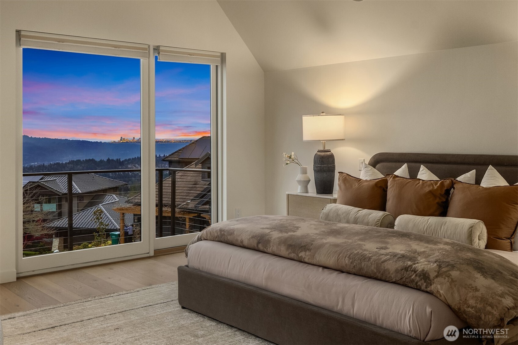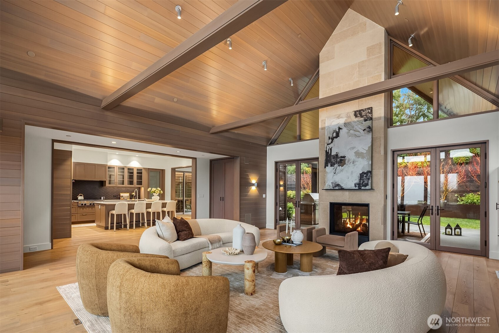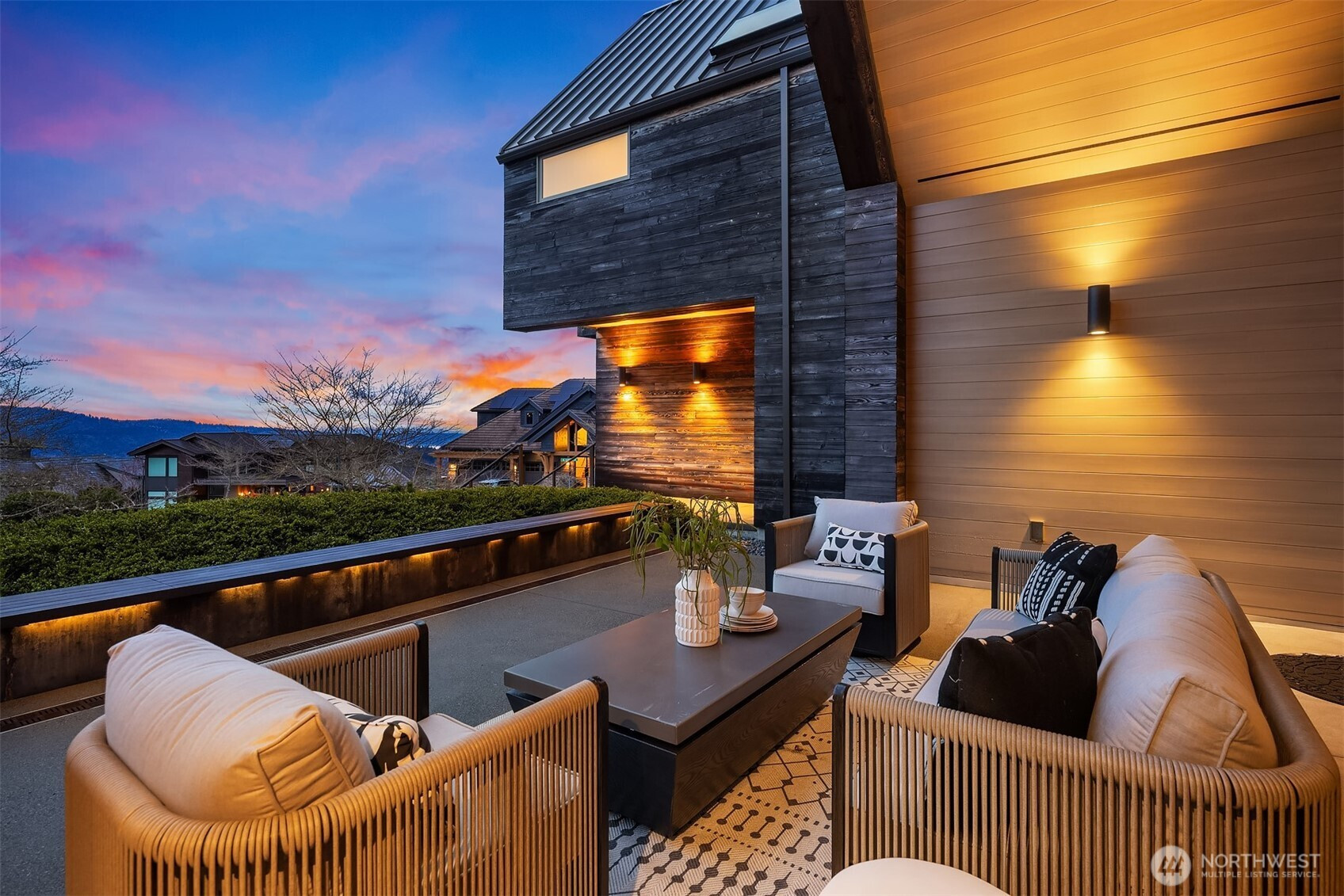 Prestigious, award-winning architecture crowning the Harrison neighborhood in Issaquah Highlands: This stunning, corner lot residence, designed by Adams Architecture was recognized by the AIA as a “Home of Distinction: Gabled Elegance". German influences helped craft this modern, twin-gabled A-frame into a contemporary work of art. Upon entering, natural elegance takes center stage with premium white oak flooring, organic materials, and bespoke craftsmanship throughout. The heart of the home features a Chef's kitchen with expansive quartz counters and temperature-controlled wine room. Family room boasts impressive vaulted cedar ceiling and a stunning stone indoor/outdoor fireplace. Designed for entertaining, formal outdoor living spaces frame picturesque views of the Olympic Mountains and Seattle skyline, while the Eastern terrace offers a tranquil retreat against a lush greenbelt. Upstairs, the Primary suite offers vaulted ceiling, glorious western views, a large custom closet, and spa-inspired bath with wet room. Two additional large bedrooms and a bonus room sit on the upper level. A lower-level guest suite is perfect for hosting. The exterior materials are low-maintenance and renewable; the standing-seam metal roof and charred shou sugi ban siding will age gracefully over time. The expansive, flat driveway doubles as your own private pickleball court. Experience this home in person to truly capture its beauty, design, and elegance.