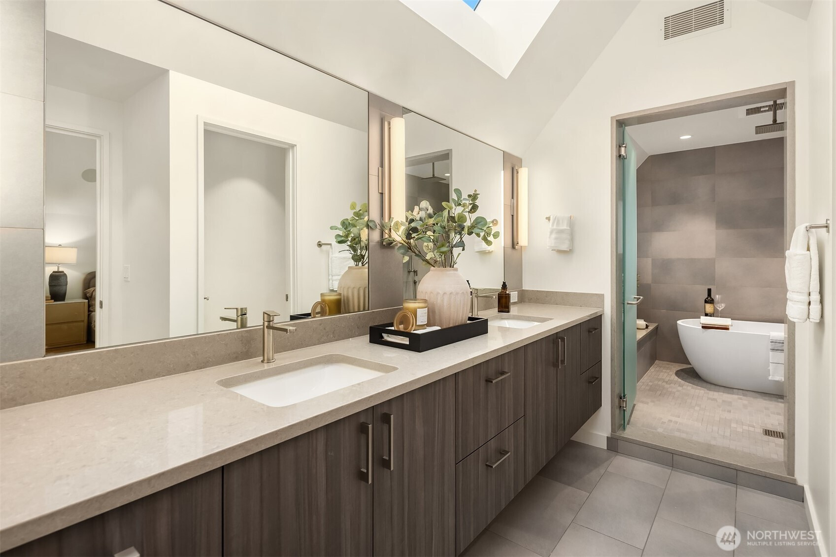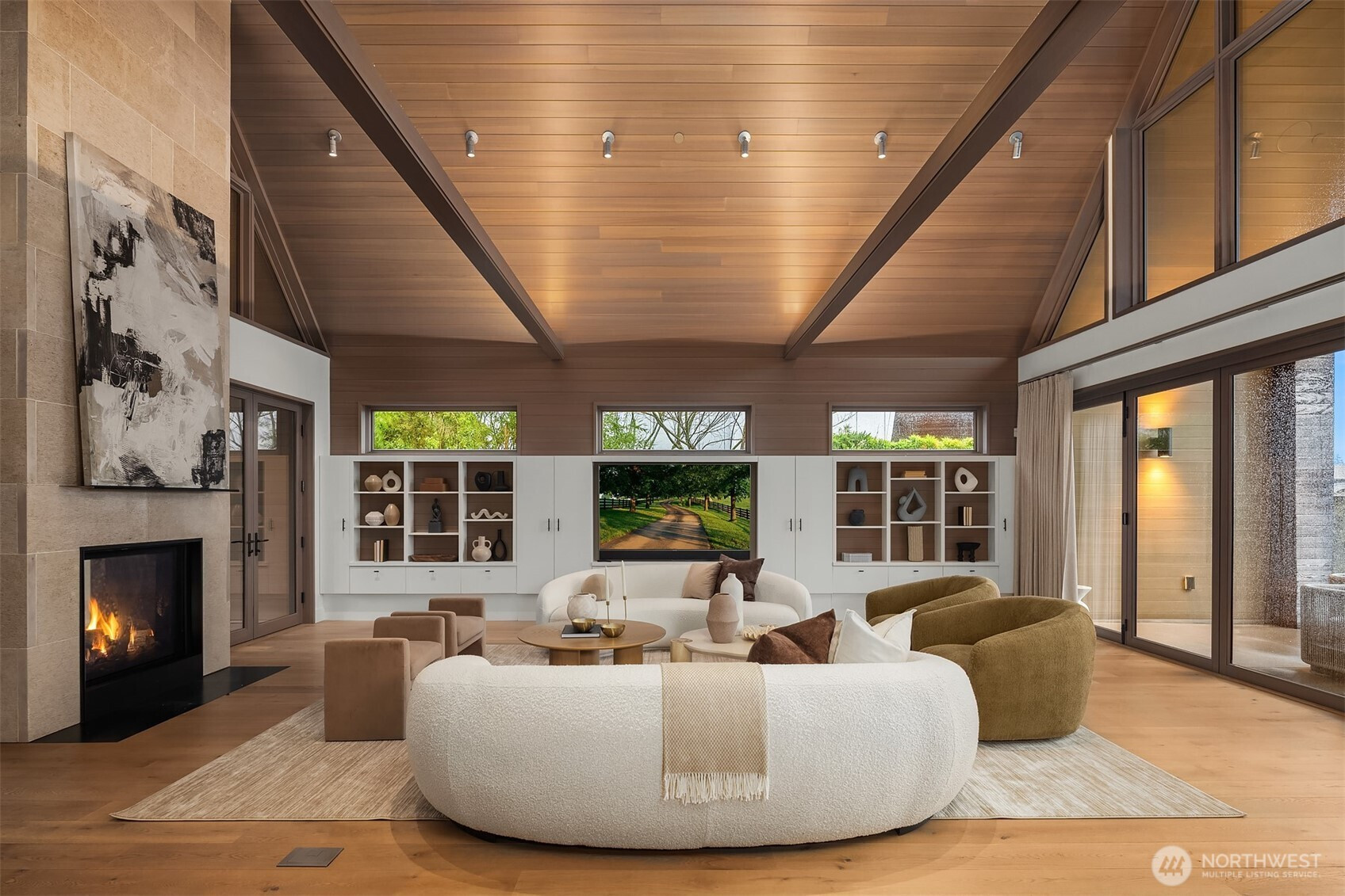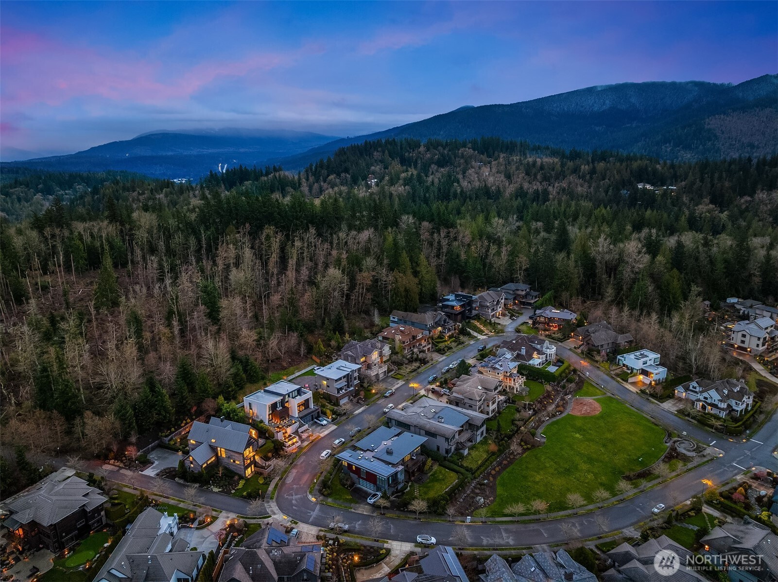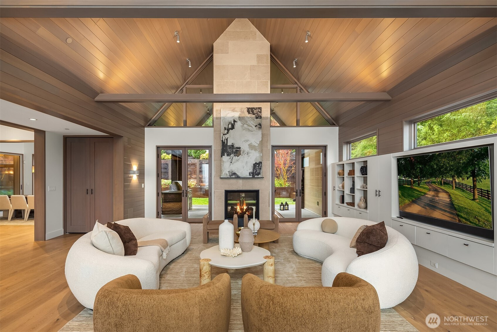 Prestigious, award-winning architecture crowning the Harrison neighborhood in Issaquah Highlands: This stunning, corner lot residence, designed by Adams Architecture was recognized by the AIA as a “Home of Distinction: Gabled Elegance". German influences helped craft this modern, twin-gabled A-frame into a contemporary work of art. Upon entering, natural elegance takes center stage with premium white oak flooring, organic materials, and bespoke craftsmanship throughout. The heart of the home features a Chef's kitchen with expansive quartz counters and temperature-controlled wine room. Family room boasts impressive vaulted cedar ceiling and a stunning stone indoor/outdoor fireplace. Designed for entertaining, formal outdoor living spaces frame picturesque views of the Olympic Mountains and Seattle skyline, while the Eastern terrace offers a tranquil retreat against a lush greenbelt. Upstairs, the Primary suite offers vaulted ceiling, glorious western views, a large custom closet, and spa-inspired bath with wet room. Two additional large bedrooms and a bonus room sit on the upper level. A lower-level guest suite is perfect for hosting. The exterior materials are low-maintenance and renewable; the standing-seam metal roof and charred shou sugi ban siding will age gracefully over time. The expansive, flat driveway doubles as your own private pickleball court. Experience this home in person to truly capture its beauty, design, and elegance.