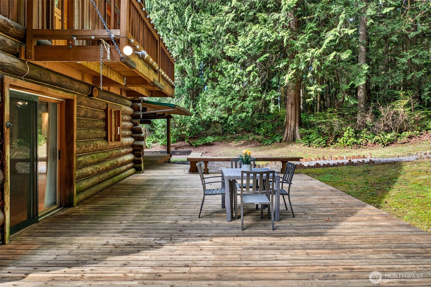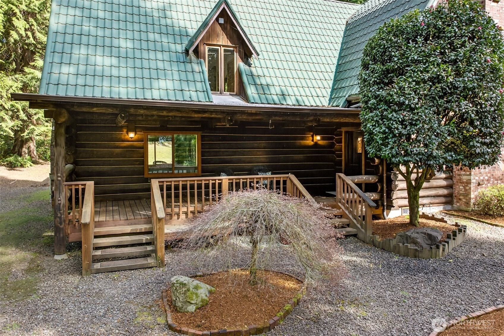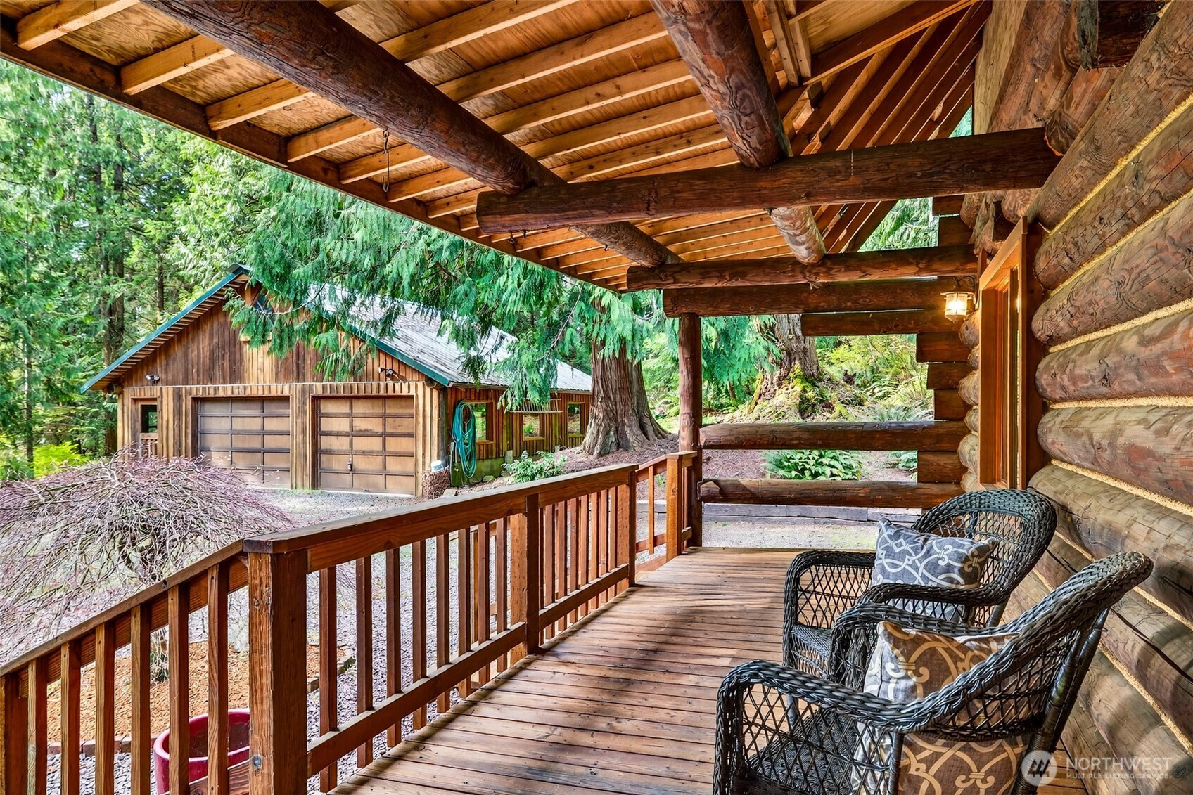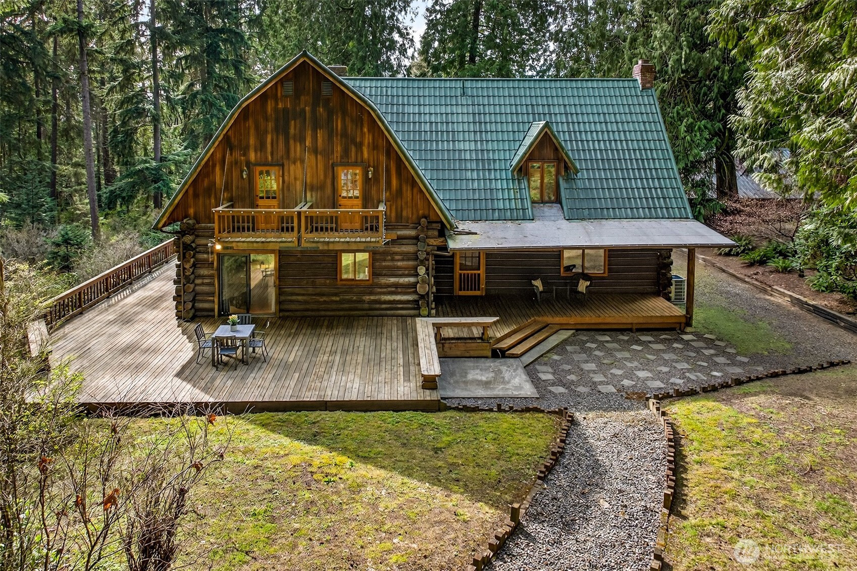 Handcrafted from the ground up and nestled within a cathedral of Pacific Northwest old-growth evergreens, this iconic two-story log home on 3.71 private acres delivers a living experience that simply cannot be replicated. Soaring A-frame gable windows, vaulted ceilings, hand-scribed log walls, and a dramatic brick fireplace create a great room that is as architecturally stunning as it is warm and inviting. The open kitchen features quartz counters, stainless appliances, knotty pine cabinetry with leaded glass accents, and a peninsula with bar seating. A main-level family room with second brick fireplace and an upper-level study loft add exceptional flexibility. The primary suite offers forest-facing gable windows and a private ensuite bath with glass-enclosed shower. Two secondary bedrooms each provide private deck access and forested views. Dedicated laundry room, newer heat pump, and portable generator deliver everyday reliability. Outside, multi-level decks open to sweeping private grounds with open lawn, mature plantings, a detached two-car garage with shop area, and a secondary outbuilding. No HOA. Northshore School District. Minutes from Woodinville wine country, dining, and shopping. A storybook property where craftsmanship, privacy, and natural beauty converge.