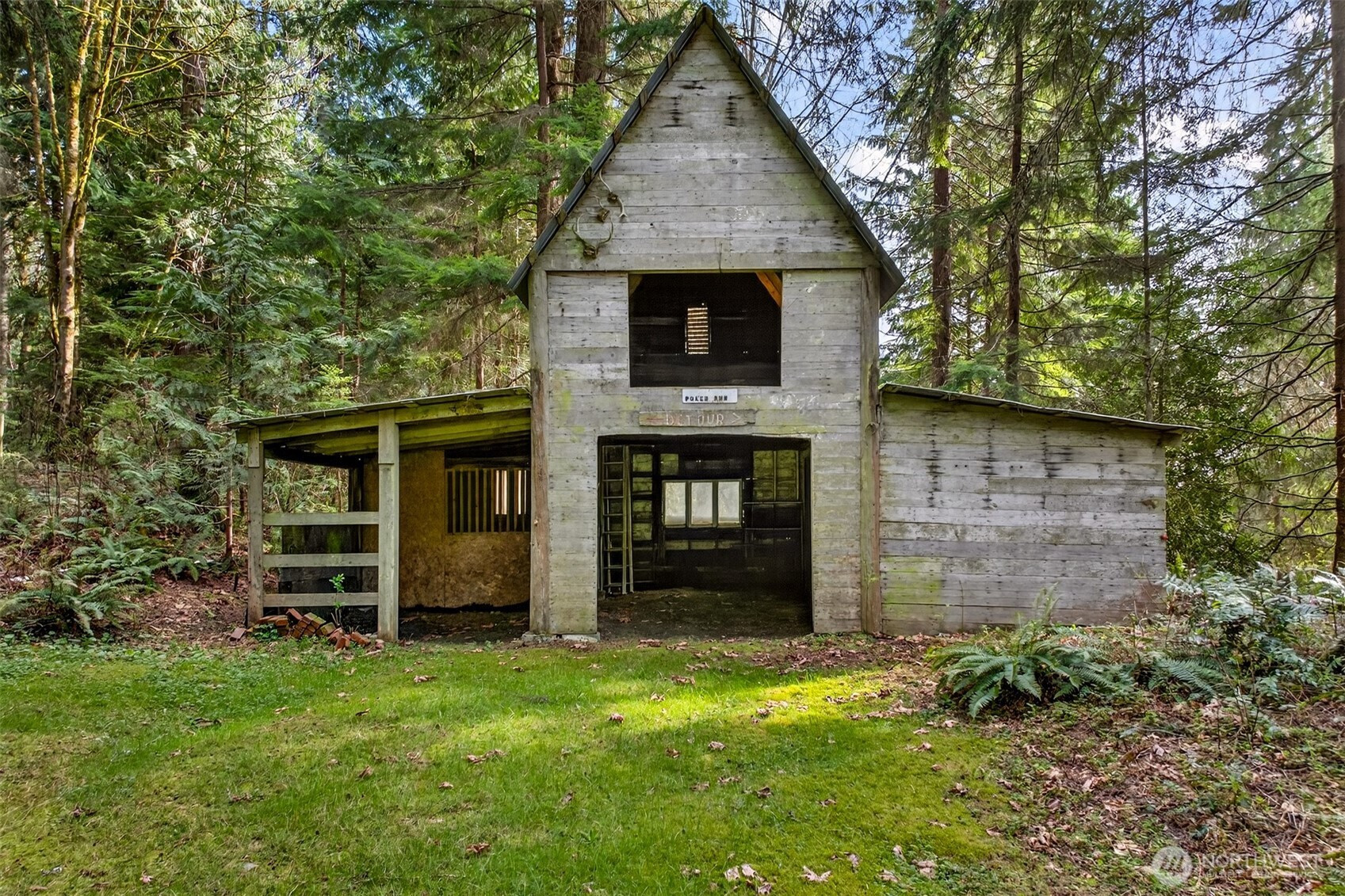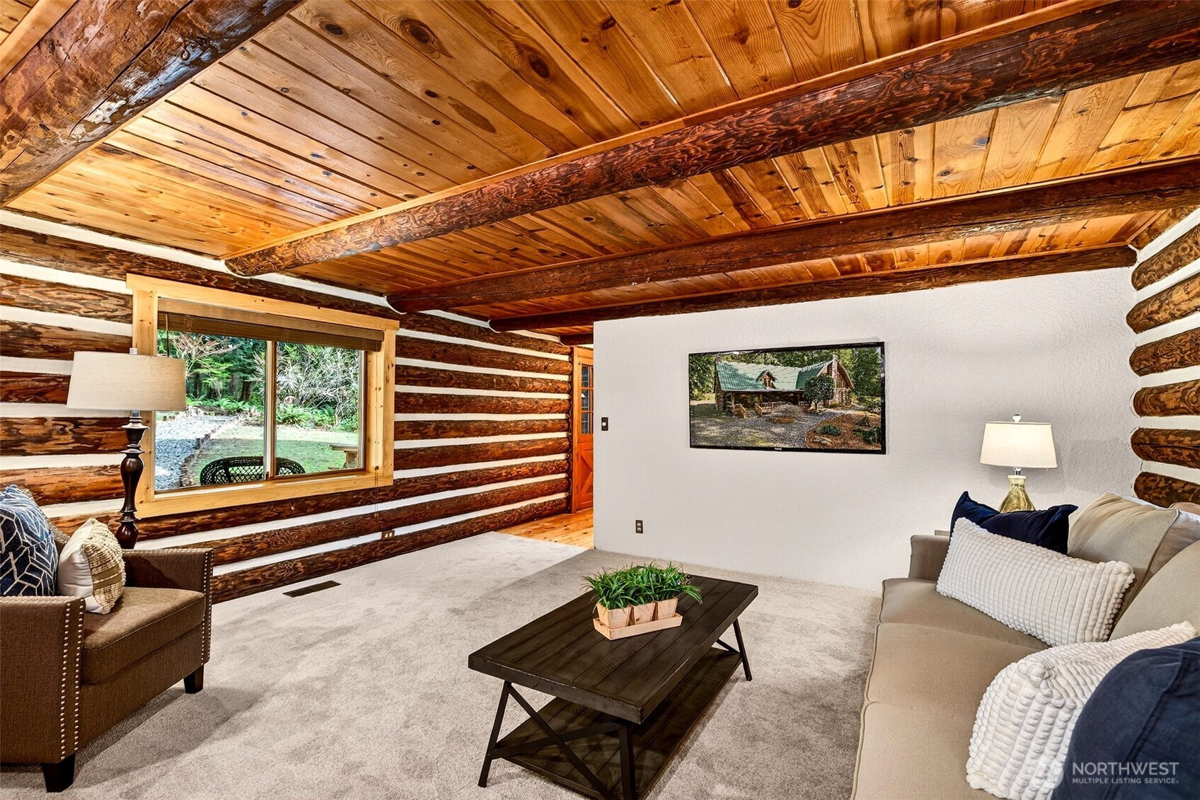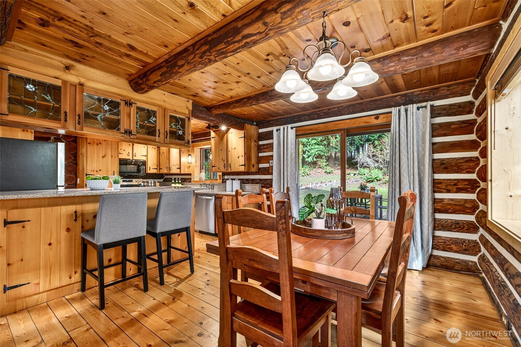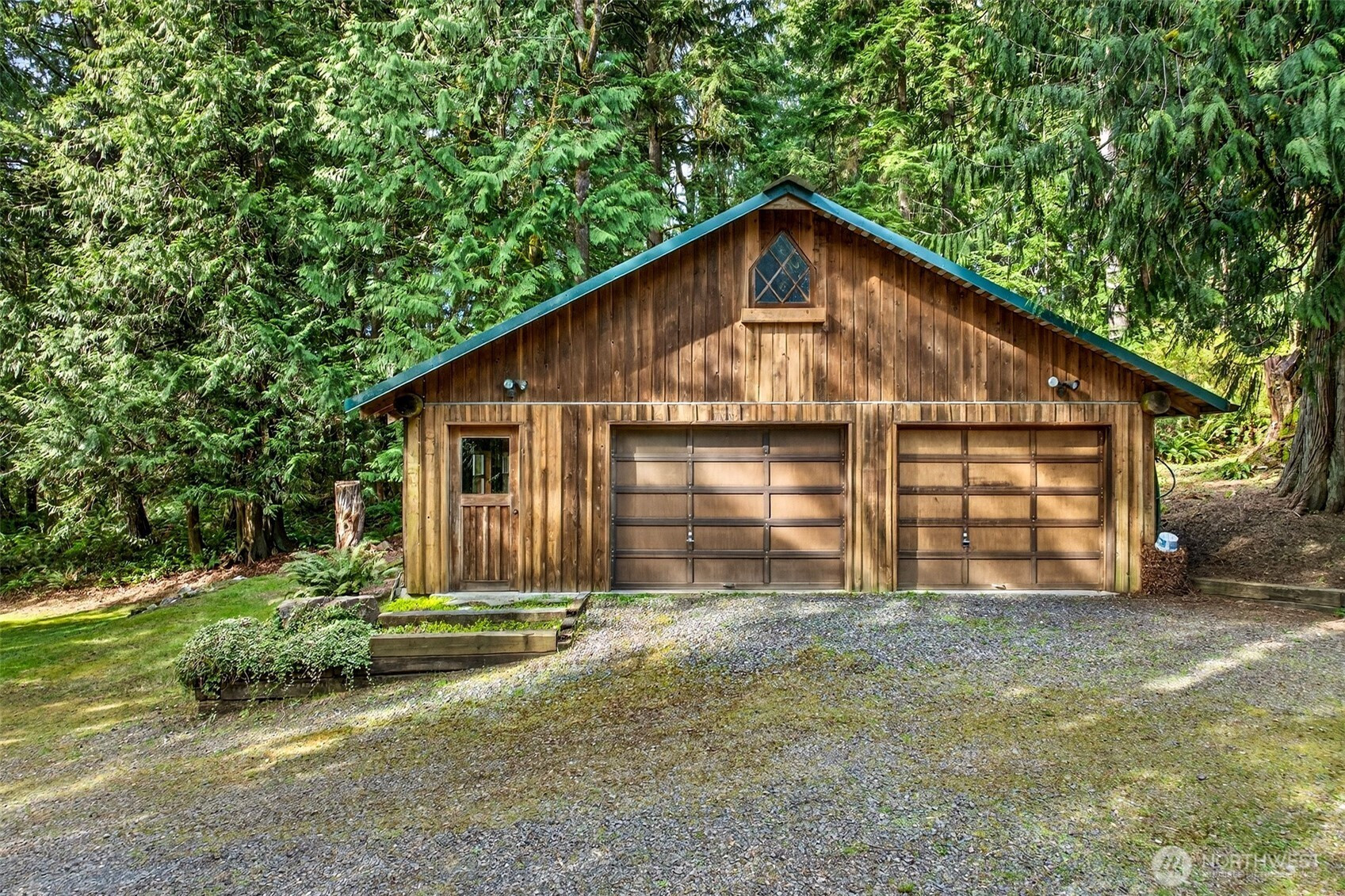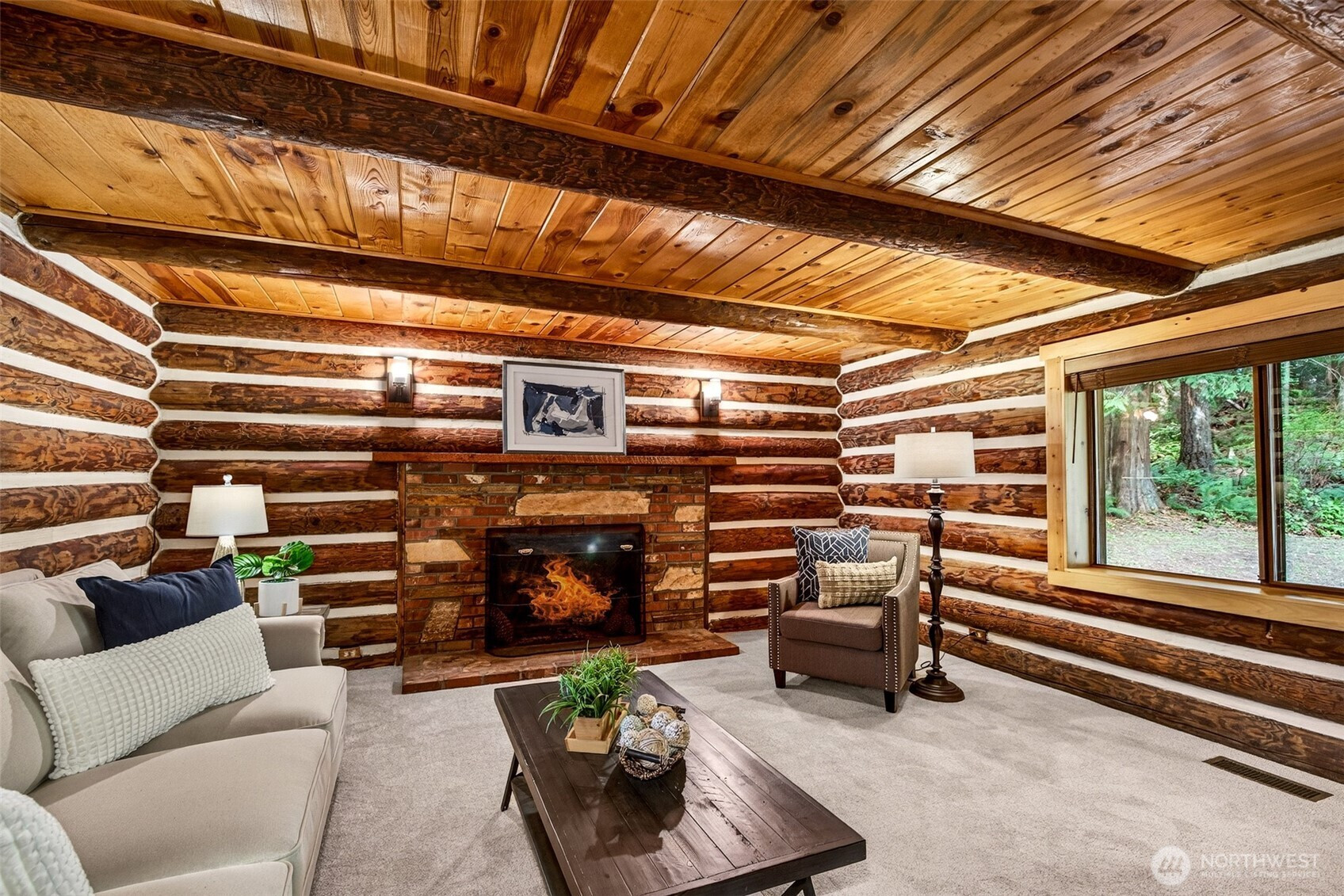 Handcrafted from the ground up and nestled within a cathedral of Pacific Northwest old-growth evergreens, this iconic two-story log home on 3.71 private acres delivers a living experience that simply cannot be replicated. Soaring A-frame gable windows, vaulted ceilings, hand-scribed log walls, and a dramatic brick fireplace create a great room that is as architecturally stunning as it is warm and inviting. The open kitchen features quartz counters, stainless appliances, knotty pine cabinetry with leaded glass accents, and a peninsula with bar seating. A main-level family room with second brick fireplace and an upper-level study loft add exceptional flexibility. The primary suite offers forest-facing gable windows and a private ensuite bath with glass-enclosed shower. Two secondary bedrooms each provide private deck access and forested views. Dedicated laundry room, newer heat pump, and portable generator deliver everyday reliability. Outside, multi-level decks open to sweeping private grounds with open lawn, mature plantings, a detached two-car garage with shop area, and a secondary outbuilding. No HOA. Northshore School District. Minutes from Woodinville wine country, dining, and shopping. A storybook property where craftsmanship, privacy, and natural beauty converge.