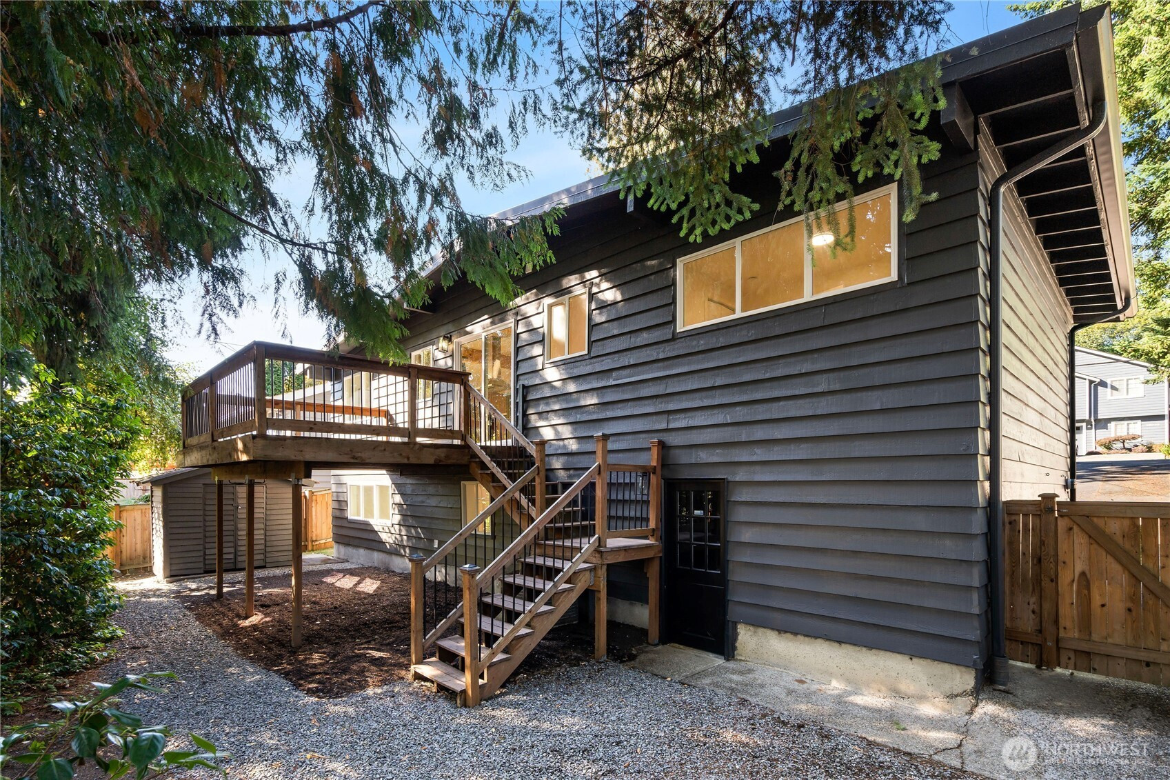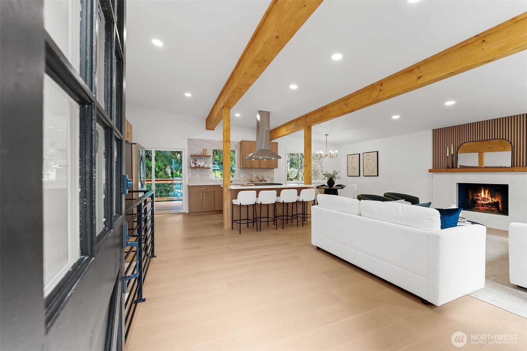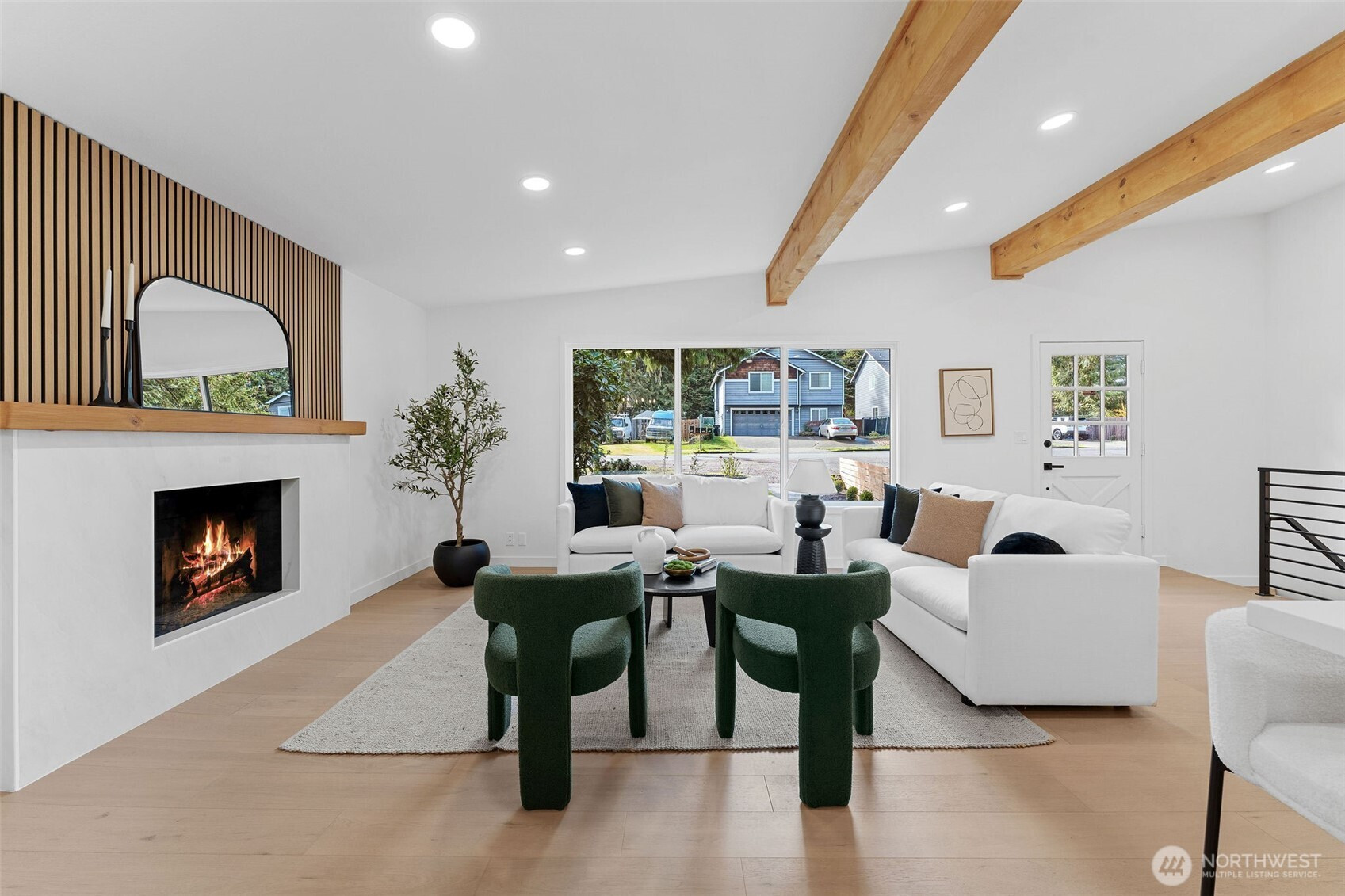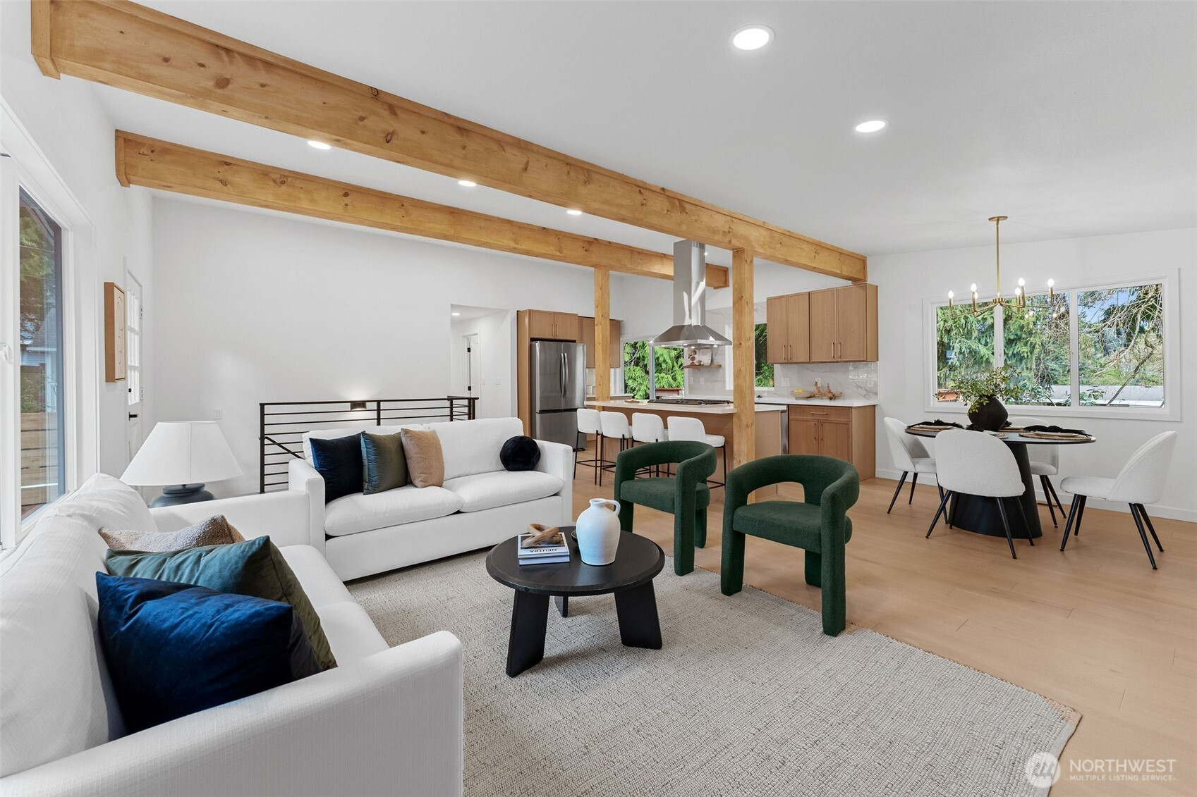 Located in Shoreline’s desirable Meridian Park neighborhood, this stunning, Remodeled & Fully permitted Mid-Century Modern home showcases thoughtful updates & timeless design. Vaulted ceilings w/ exposed beams & an open layout. Enjoy a spacious living & dining area, beautifully designed kitchen w/ Quartz countertops, Slim Shaker cabinets & SS appliances. Engineered hardwood throughout main living areas & bdrooms. The Primary Suite offers a spa-like en-suite w/ large-format tile, curbless shower & double vanity. An additional bedroom & updated bath complete the main floor. Downstairs features a 2nd living space, full bath & bedroom—ideal for ADU potential. Expansive lot w/ huge backyard, long driveway, minutes to top-rated schools & Seattle.