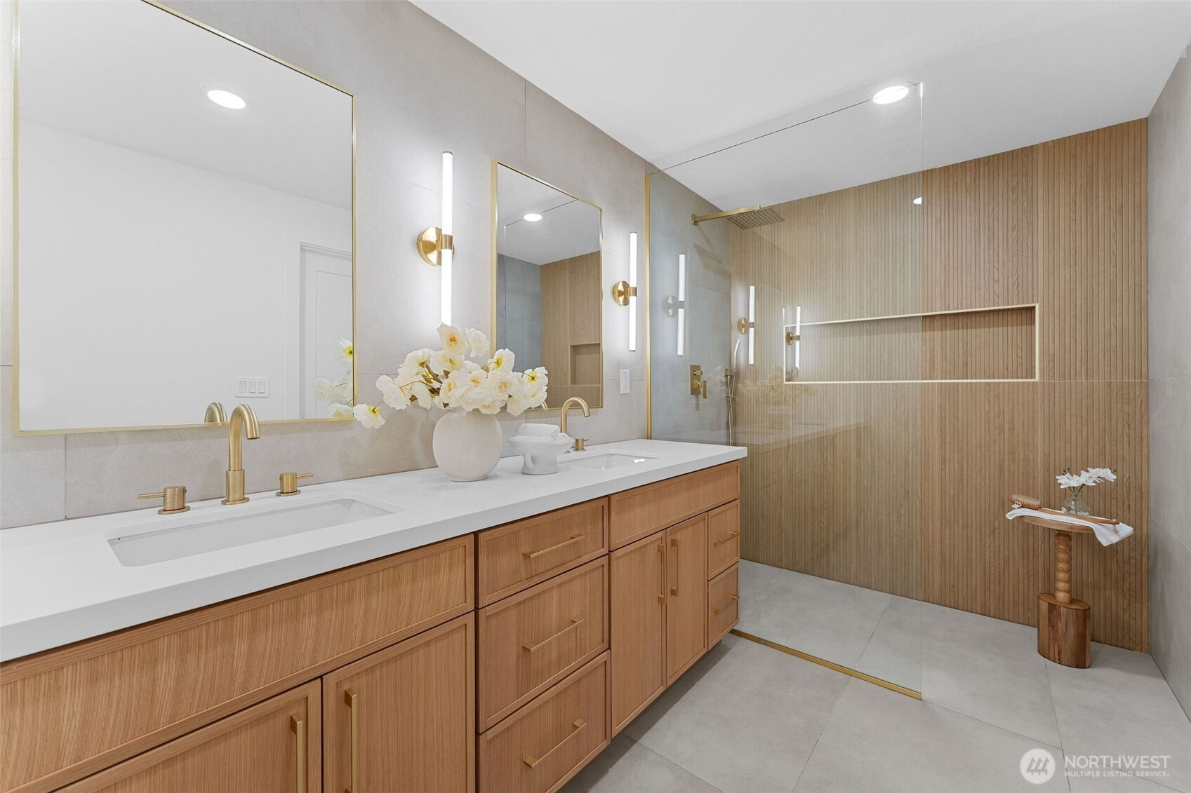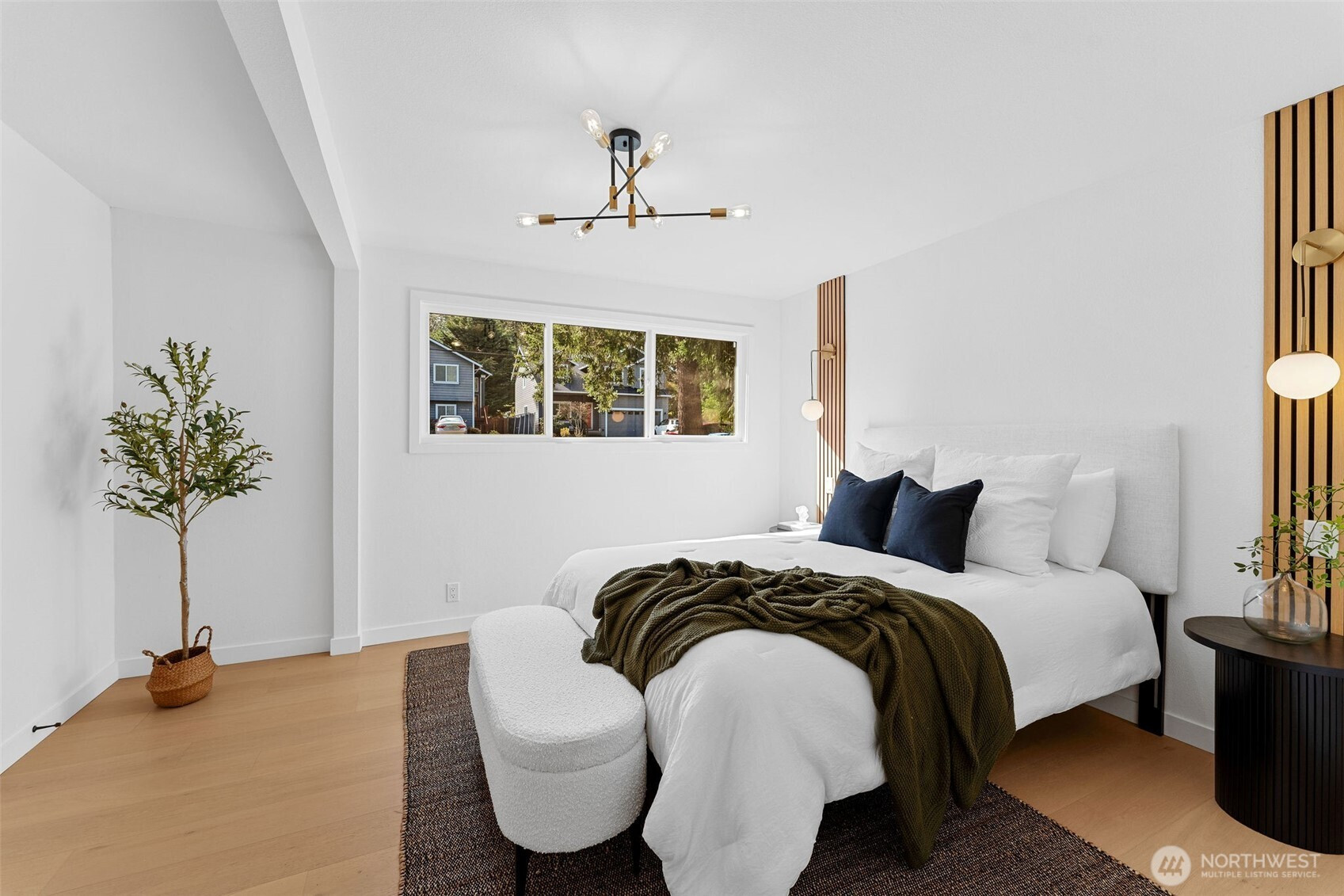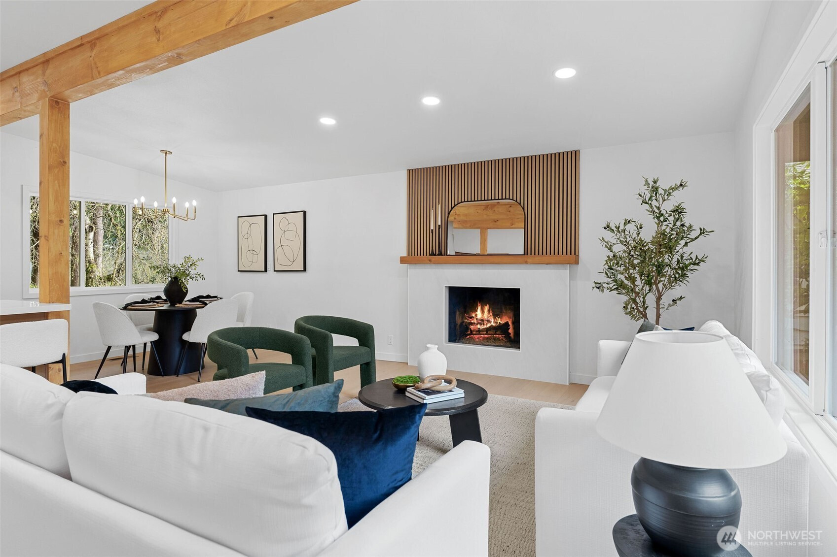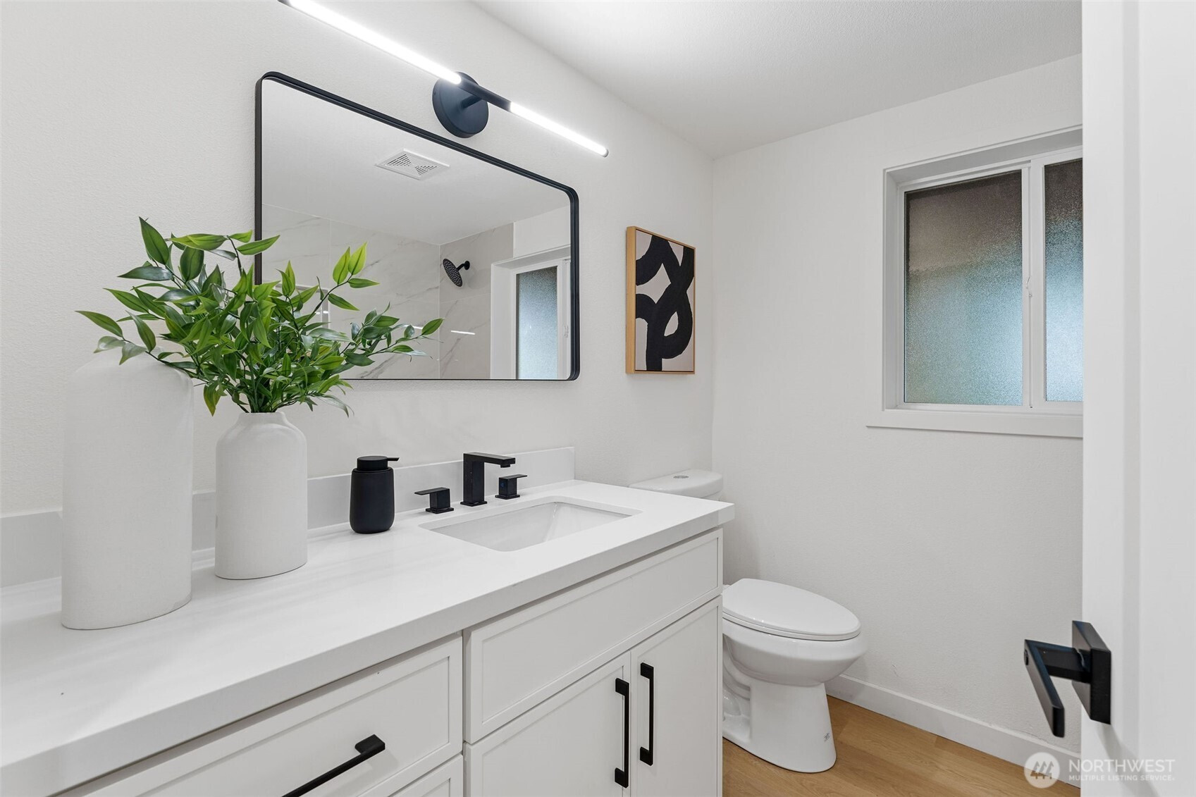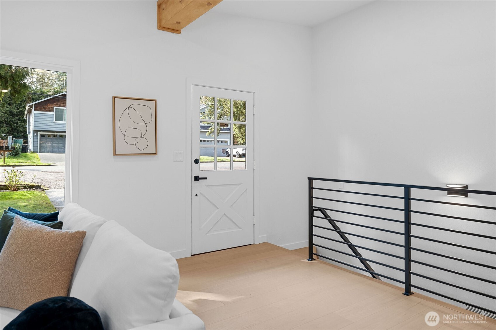 Located in Shoreline’s desirable Meridian Park neighborhood, this stunning, Remodeled & Fully permitted Mid-Century Modern home showcases thoughtful updates & timeless design. Vaulted ceilings w/ exposed beams & an open layout. Enjoy a spacious living & dining area, beautifully designed kitchen w/ Quartz countertops, Slim Shaker cabinets & SS appliances. Engineered hardwood throughout main living areas & bdrooms. The Primary Suite offers a spa-like en-suite w/ large-format tile, curbless shower & double vanity. An additional bedroom & updated bath complete the main floor. Downstairs features a 2nd living space, full bath & bedroom—ideal for ADU potential. Expansive lot w/ huge backyard, long driveway, minutes to top-rated schools & Seattle.