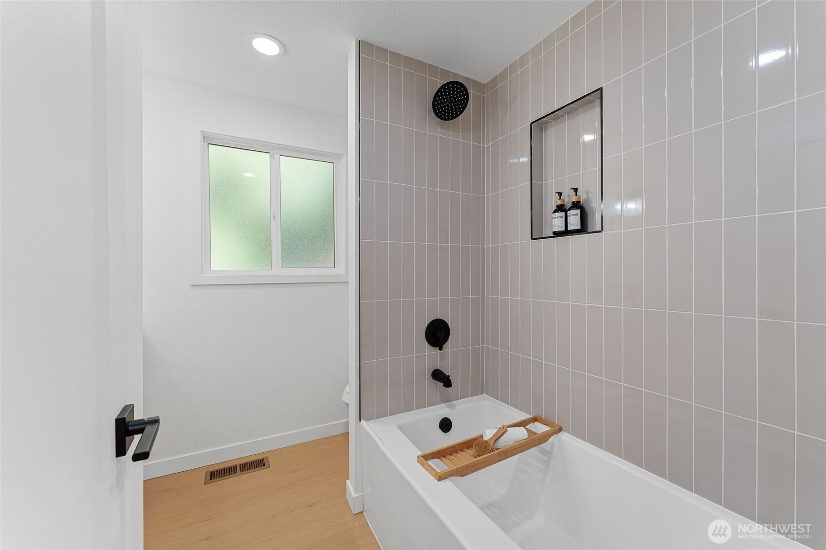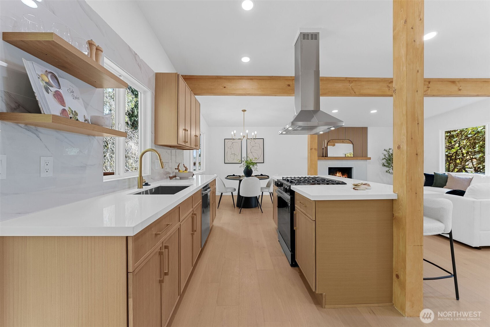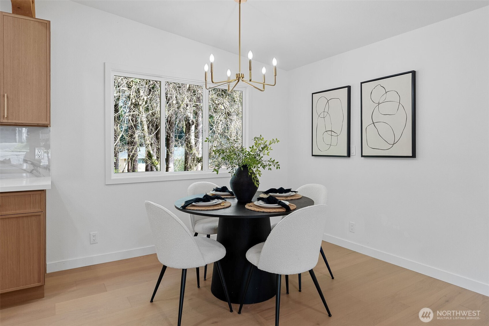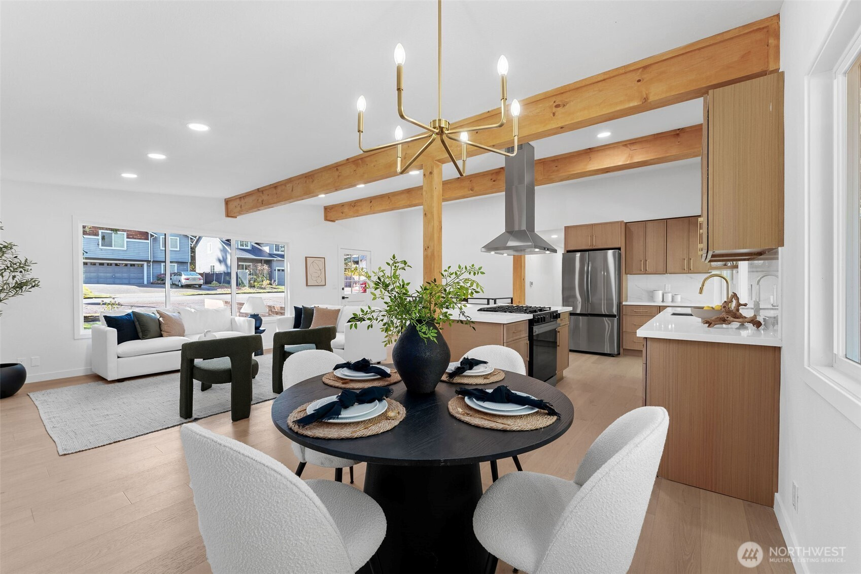 Located in Shoreline’s desirable Meridian Park neighborhood, this stunning, Remodeled & Fully permitted Mid-Century Modern home showcases thoughtful updates & timeless design. Vaulted ceilings w/ exposed beams & an open layout. Enjoy a spacious living & dining area, beautifully designed kitchen w/ Quartz countertops, Slim Shaker cabinets & SS appliances. Engineered hardwood throughout main living areas & bdrooms. The Primary Suite offers a spa-like en-suite w/ large-format tile, curbless shower & double vanity. An additional bedroom & updated bath complete the main floor. Downstairs features a 2nd living space, full bath & bedroom—ideal for ADU potential. Expansive lot w/ huge backyard, long driveway, minutes to top-rated schools & Seattle.