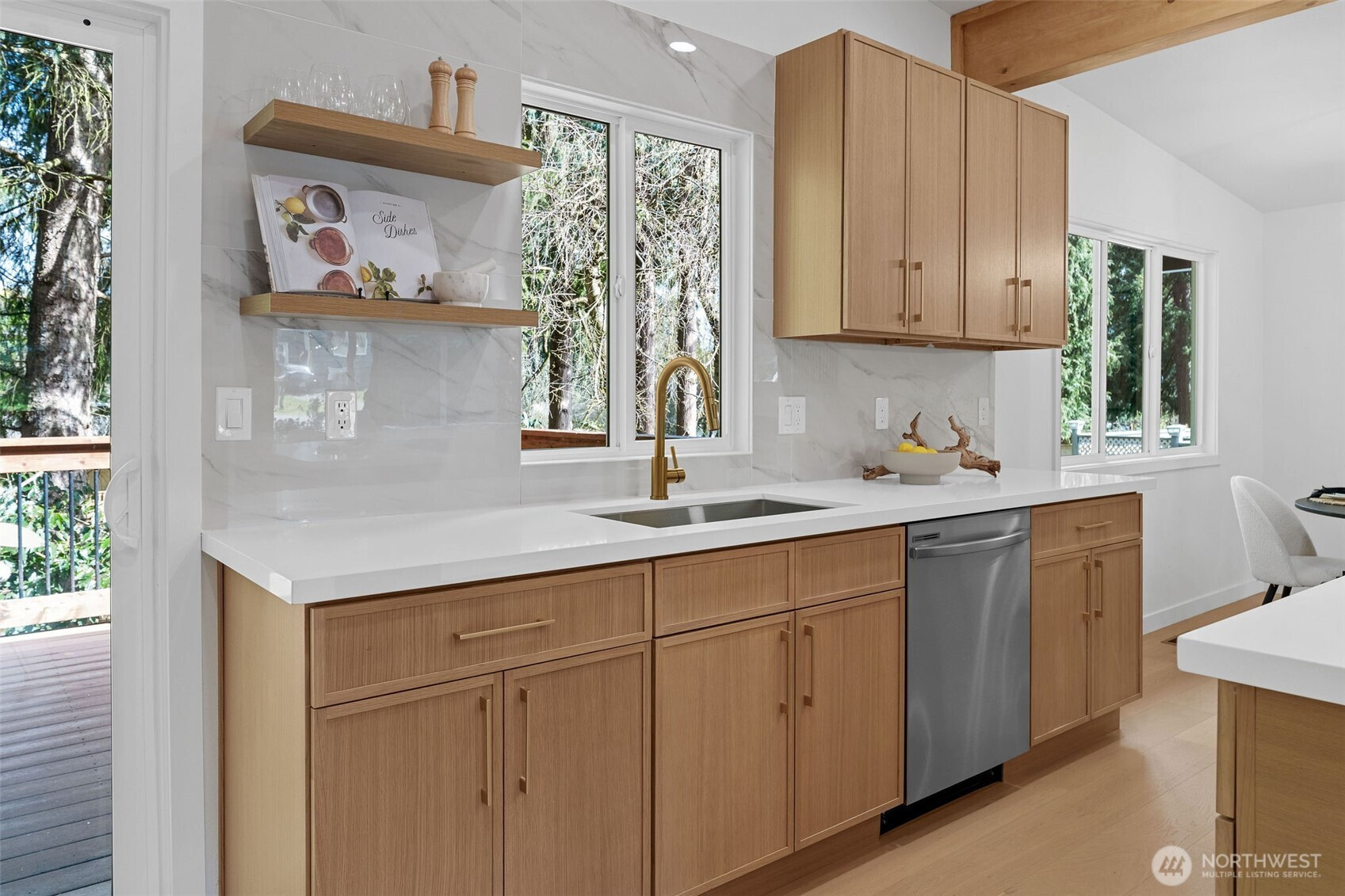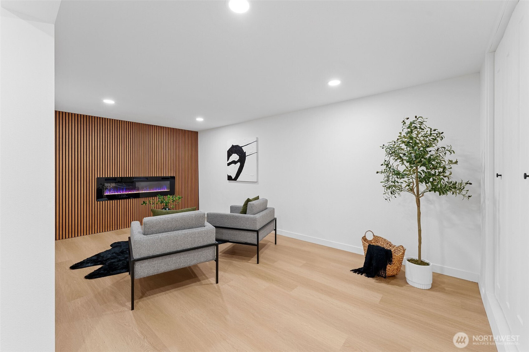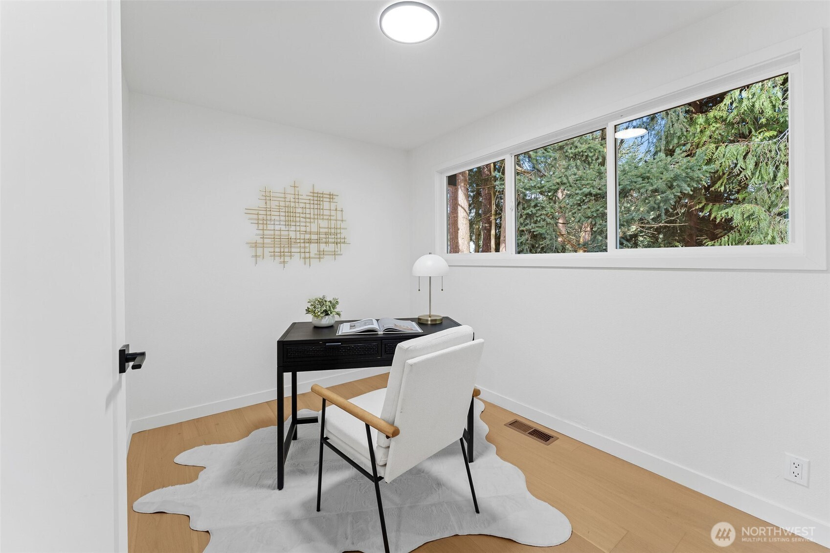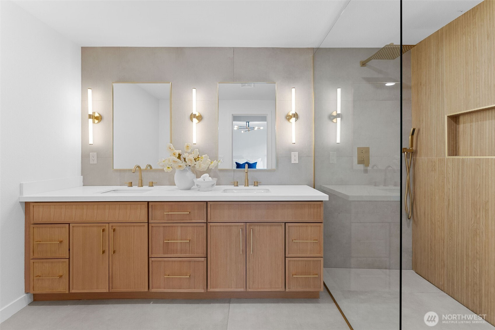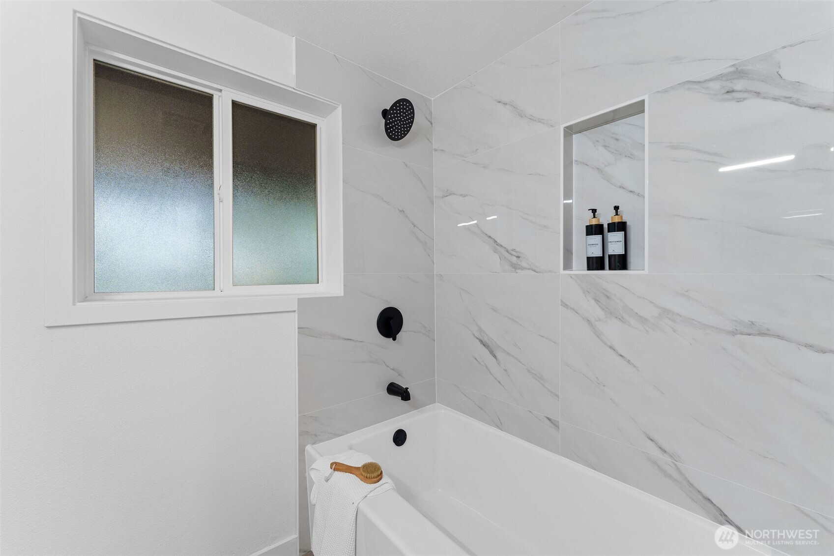Located in Shoreline’s desirable Meridian Park neighborhood, this stunning, Remodeled & Fully permitted Mid-Century Modern home showcases thoughtful updates & timeless design. Vaulted ceilings w/ exposed beams & an open layout. Enjoy a spacious living & dining area, beautifully designed kitchen w/ Quartz countertops, Slim Shaker cabinets & SS appliances. Engineered hardwood throughout main living areas & bdrooms. The Primary Suite offers a spa-like en-suite w/ large-format tile, curbless shower & double vanity. An additional bedroom & updated bath complete the main floor. Downstairs features a 2nd living space, full bath & bedroom—ideal for ADU potential. Expansive lot w/ huge backyard, long driveway, minutes to top-rated schools & Seattle.