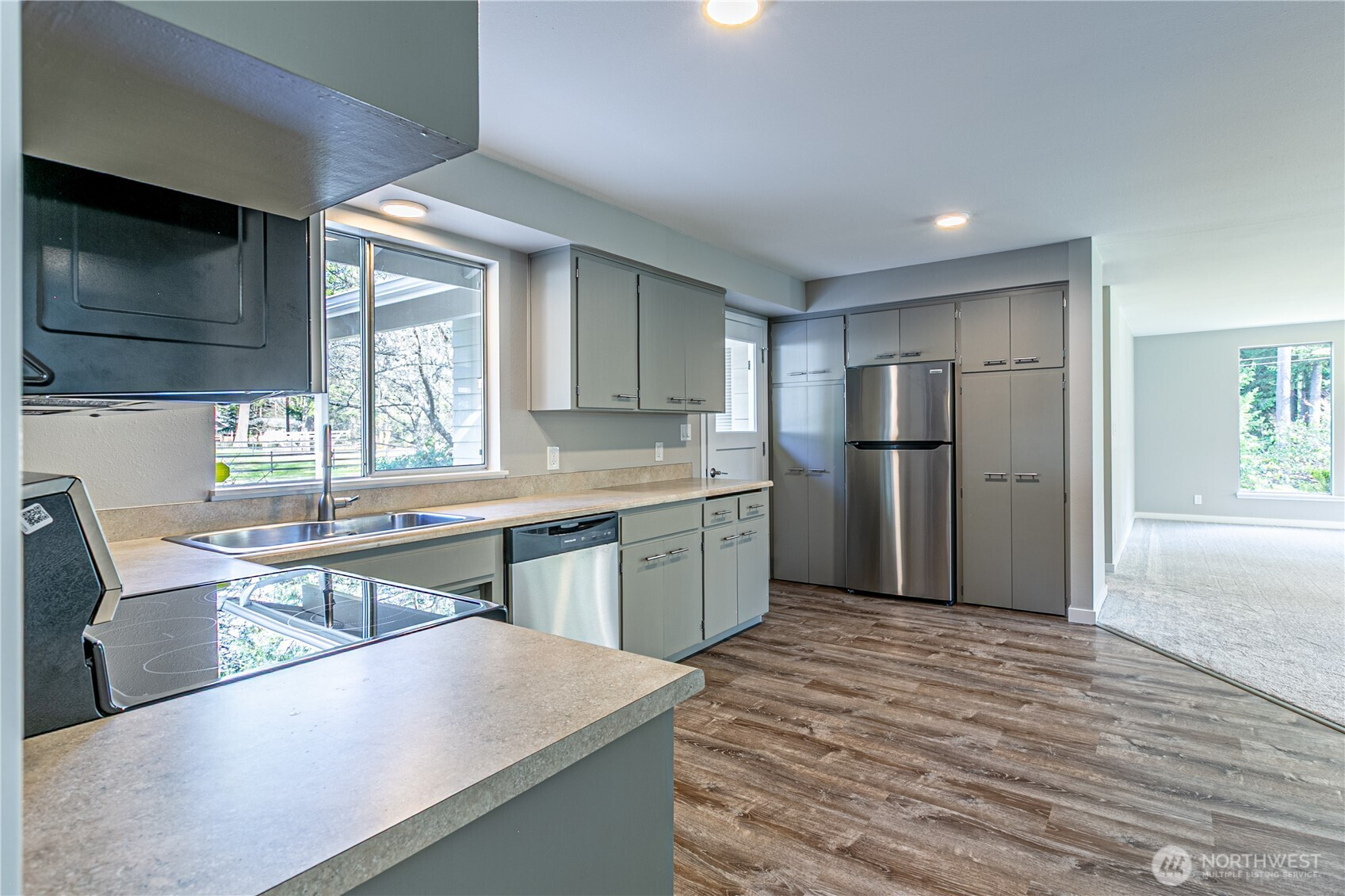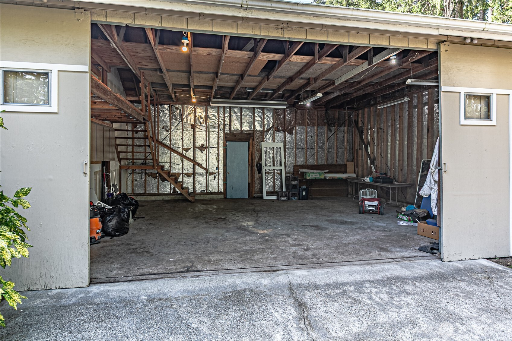 Enjoy space and privacy with this turnkey rambler on a nearly one-acre corner lot. This 2,020 sq ft home features brand-new flooring throughout, three beautifully remodeled bathrooms, new lighting, tile, doors, stainless steel kitchen appliances, and fresh interior and exterior paint. The light-filled floor plan offers three spacious bedrooms, including two with attached bathrooms. The primary suite opens directly to the deck for easy indoor-outdoor living. Enjoy multiple living spaces including a formal dining room with sitting area, living room, and rec room—all on one level. Step outside to a brand-new deck overlooking the landscaped yard and garden area. The property also includes a two-story shop with loft, storage rooms, and covered space—offering versatile options for hobbies, projects, or storage.