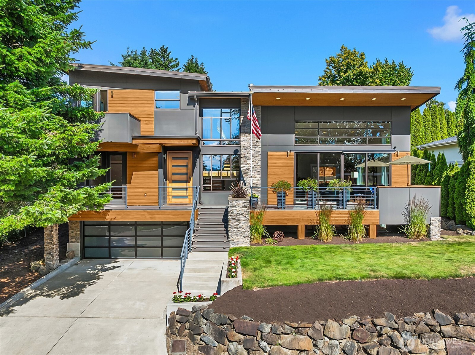 Modern masterpiece just around the corner from downtown Kirkland. This stunning home blends stone pillars, acacia hardwood, and slate fireplace with sleek lines. A bold floating staircase and soaring ceilings frame huge west-facing windows, flooding the flexible, open-concept great room with light. The main floor features an open-concept great room, chef’s kitchen, home office & 2nd Primary Suite with patio access. Upstairs, the primary suite wows with a private balcony, stone fireplace & spa-like ensuite. The lower level offers a bonus/media room and 650-bottle wine cellar. Entertain in the epic backyard with a gas fire pit and dining area. All on a quiet street close to restaurants/shopping and marina. Central AC. Pre-Inspected.